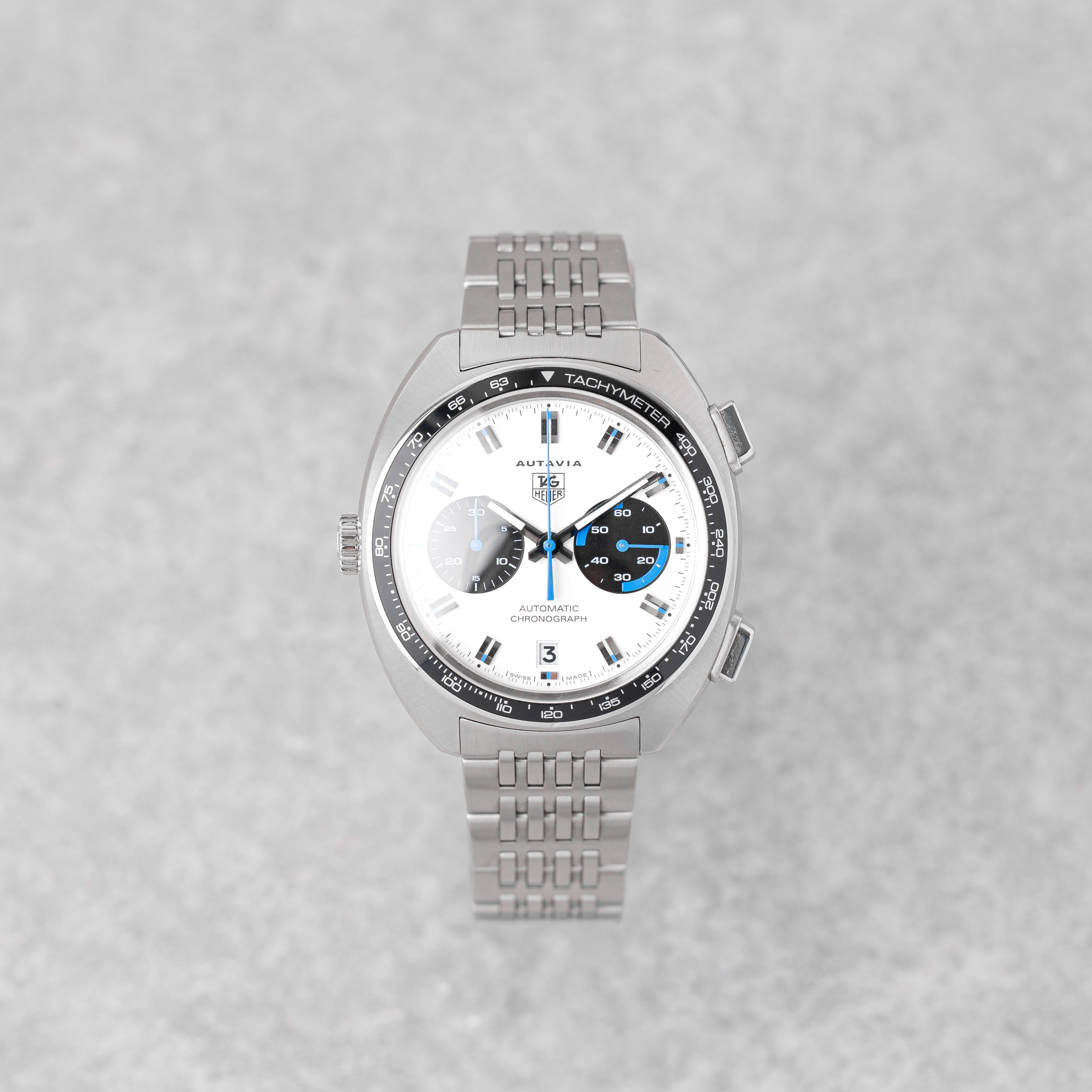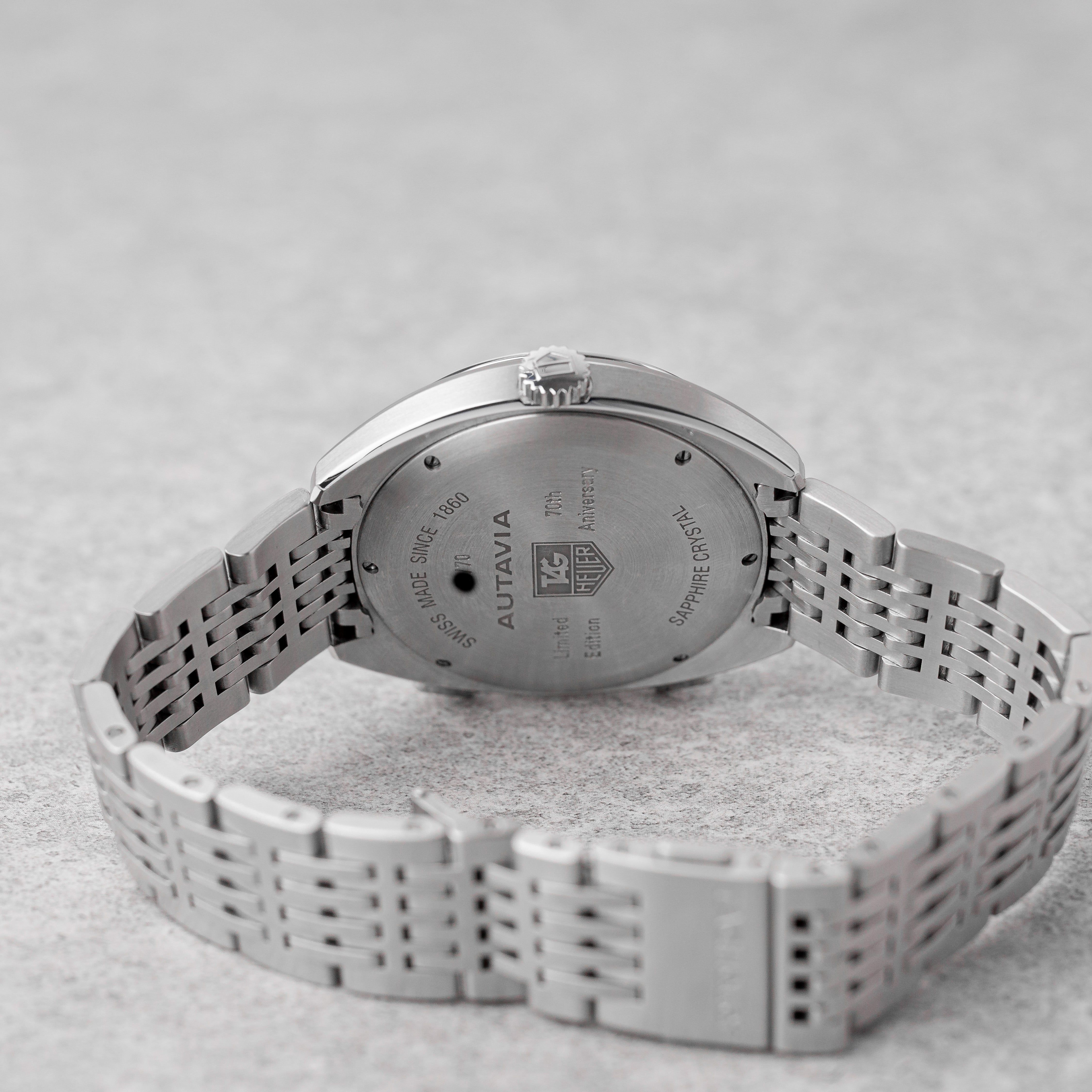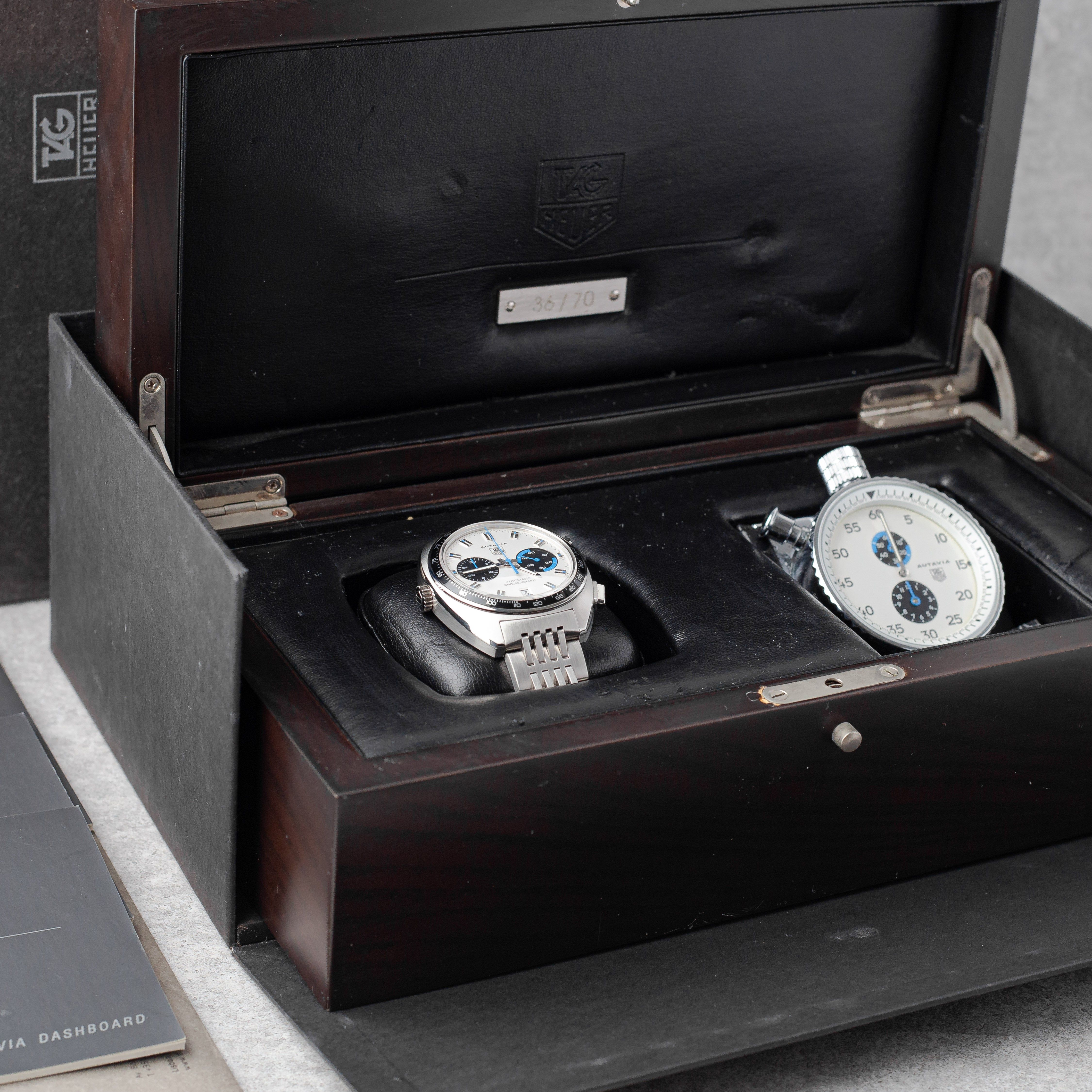 An exceptional and highly collectible piece, this TAG Heuer Autavia “Siffert Set” is a limited edition of only 70 sets, created in tribute to the 70th anniversary of the Autavia and inspired by legendary Formula 1 driver Jo Siffert. This complete collector’s set includes both the 43mm wristwatch and the rare 57mm dashboard timer, housed in the original limited edition presentation box with matching numbered plaque. The set is accompanied by manuals, mounting accessories (nuts & screws), and all original components. The watch features a striking silver opaline “Panda” dial with black subdials and blue accents, a black tachymeter bezel, and the iconic left-side crown, powered by the automatic Calibre 11 movement. It is fitted with a stainless steel bracelet inspired by the classic “Grains of Rice” design. Originally dated 01/2013, the watch has been serviced by TAG Heuer in 12/2025 (invoice included). The set is in very good overall condition, with only light surface marks consistent with careful use. A rare opportunity to acquire one of the most exclusive modern Autavia releases — a true collector’s piece combining motorsport heritage, rarity, and iconic design.