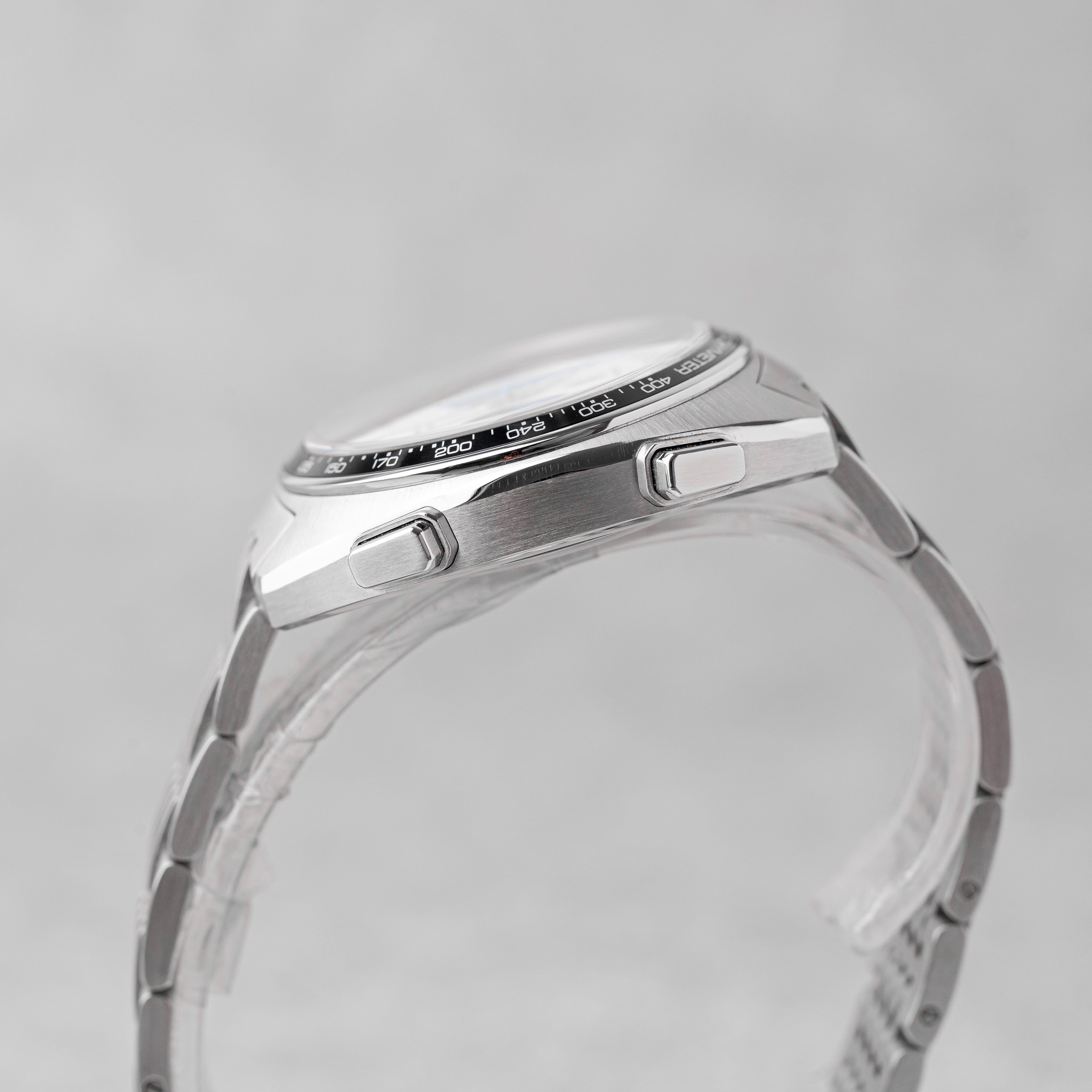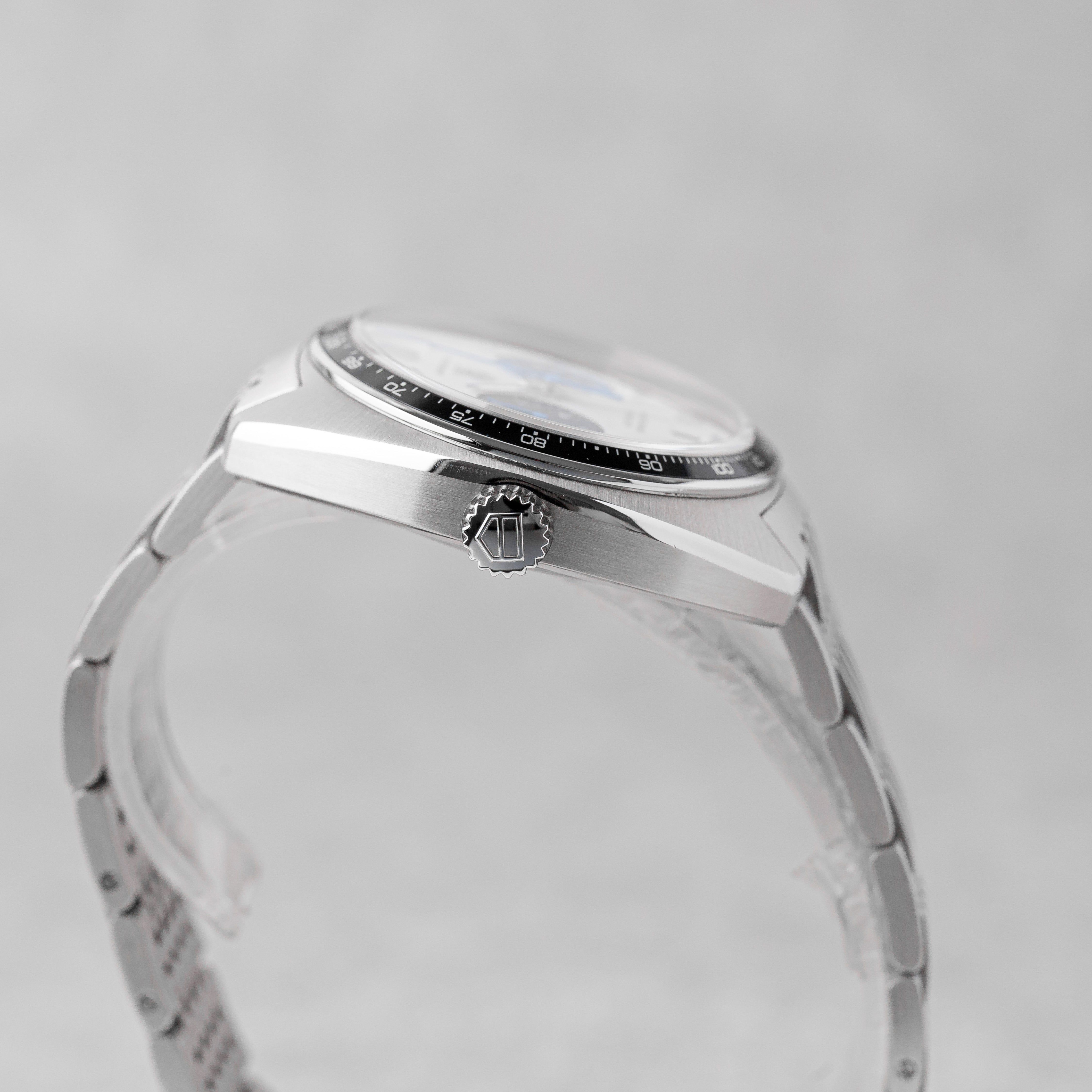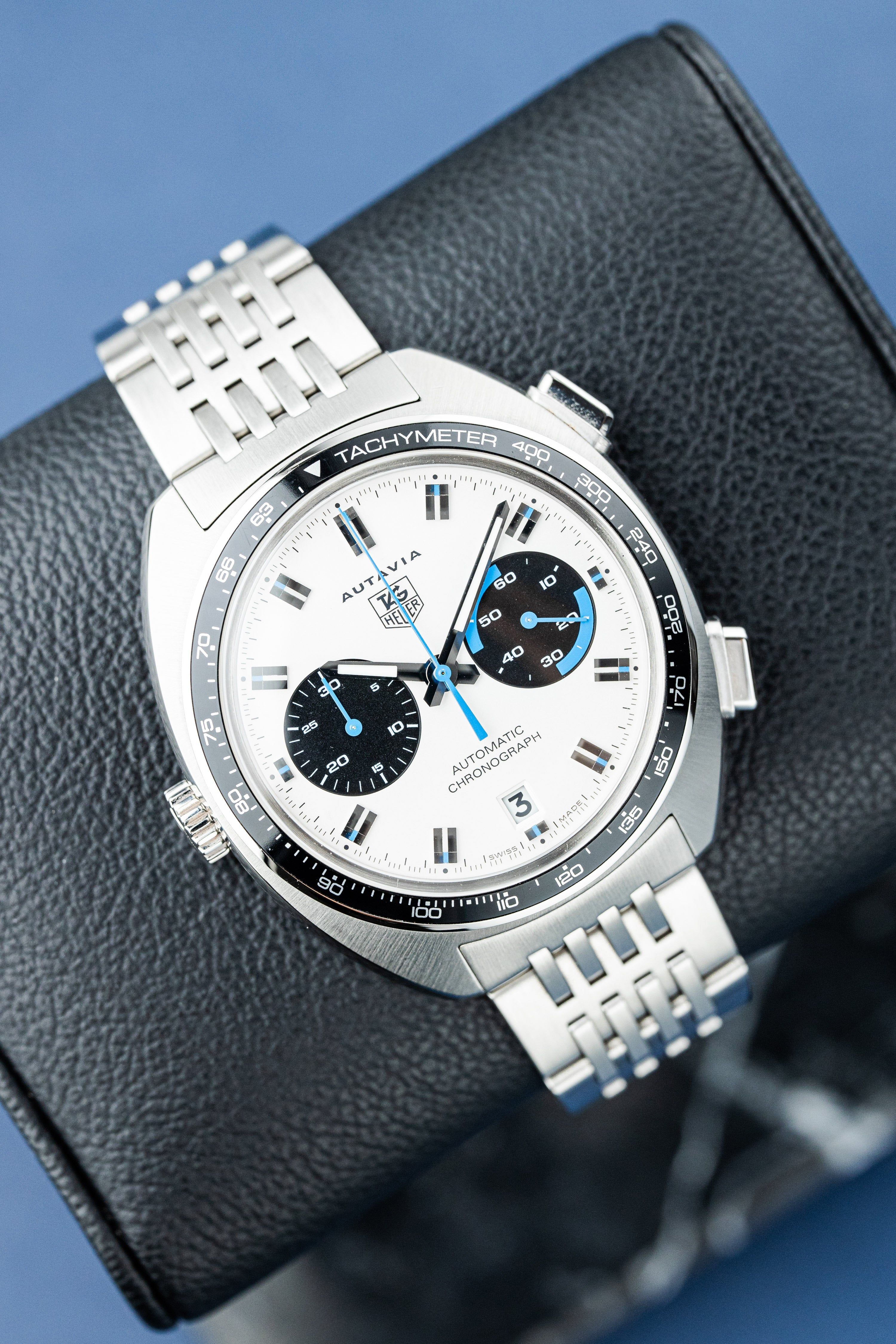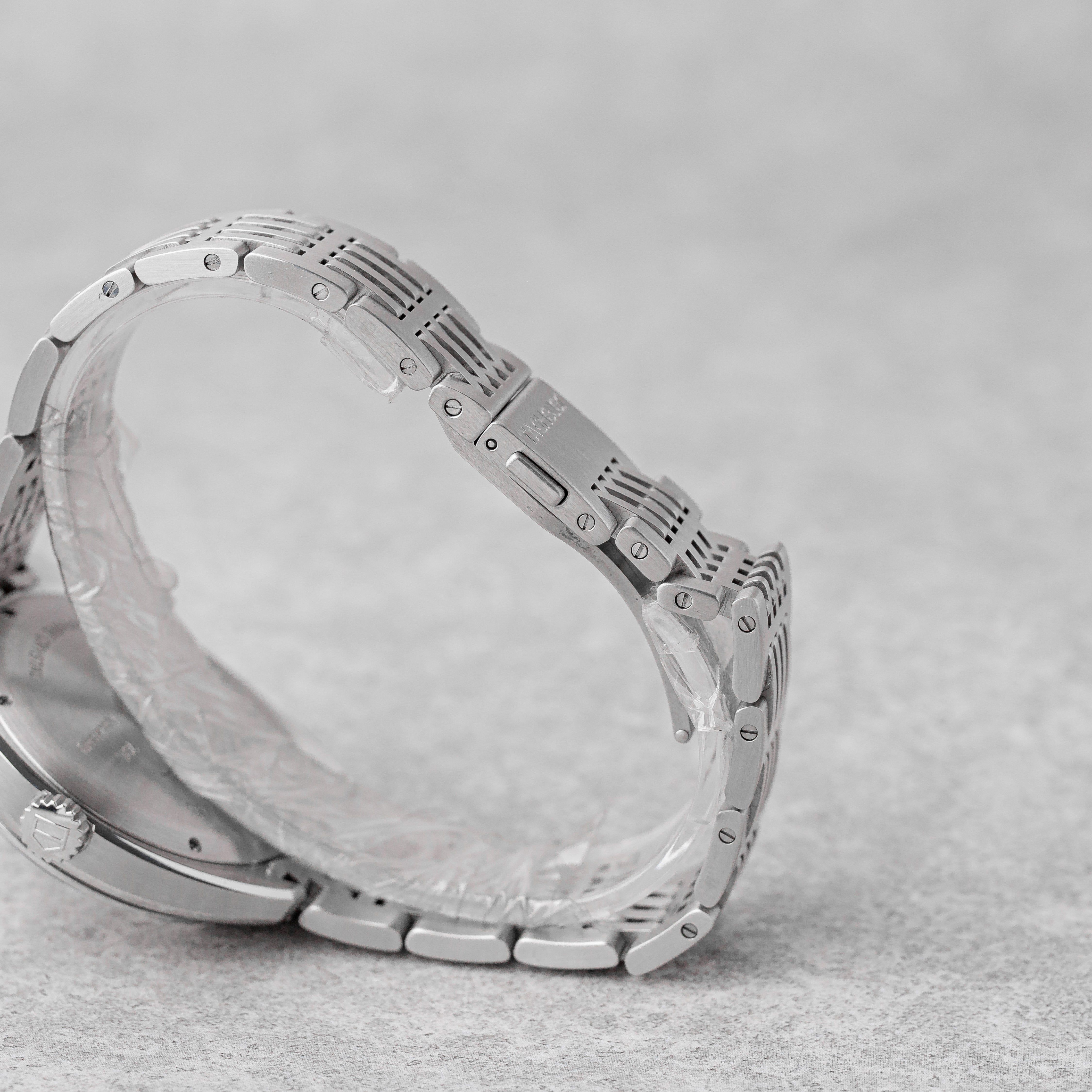 An exceptional and highly collectible piece, this TAG Heuer Autavia “Siffert Set” is a limited edition of only 70 sets, created in tribute to the 70th anniversary of the Autavia and inspired by legendary Formula 1 driver Jo Siffert. This complete collector’s set includes both the 43mm wristwatch and the rare 57mm dashboard timer, housed in the original limited edition presentation box with matching numbered plaque. The set is accompanied by manuals, mounting accessories (nuts & screws), and all original components. The watch features a striking silver opaline “Panda” dial with black subdials and blue accents, a black tachymeter bezel, and the iconic left-side crown, powered by the automatic Calibre 11 movement. It is fitted with a stainless steel bracelet inspired by the classic “Grains of Rice” design. Originally dated 01/2013, the watch has been serviced by TAG Heuer in 12/2025 (invoice included). The set is in very good overall condition, with only light surface marks consistent with careful use. A rare opportunity to acquire one of the most exclusive modern Autavia releases — a true collector’s piece combining motorsport heritage, rarity, and iconic design.