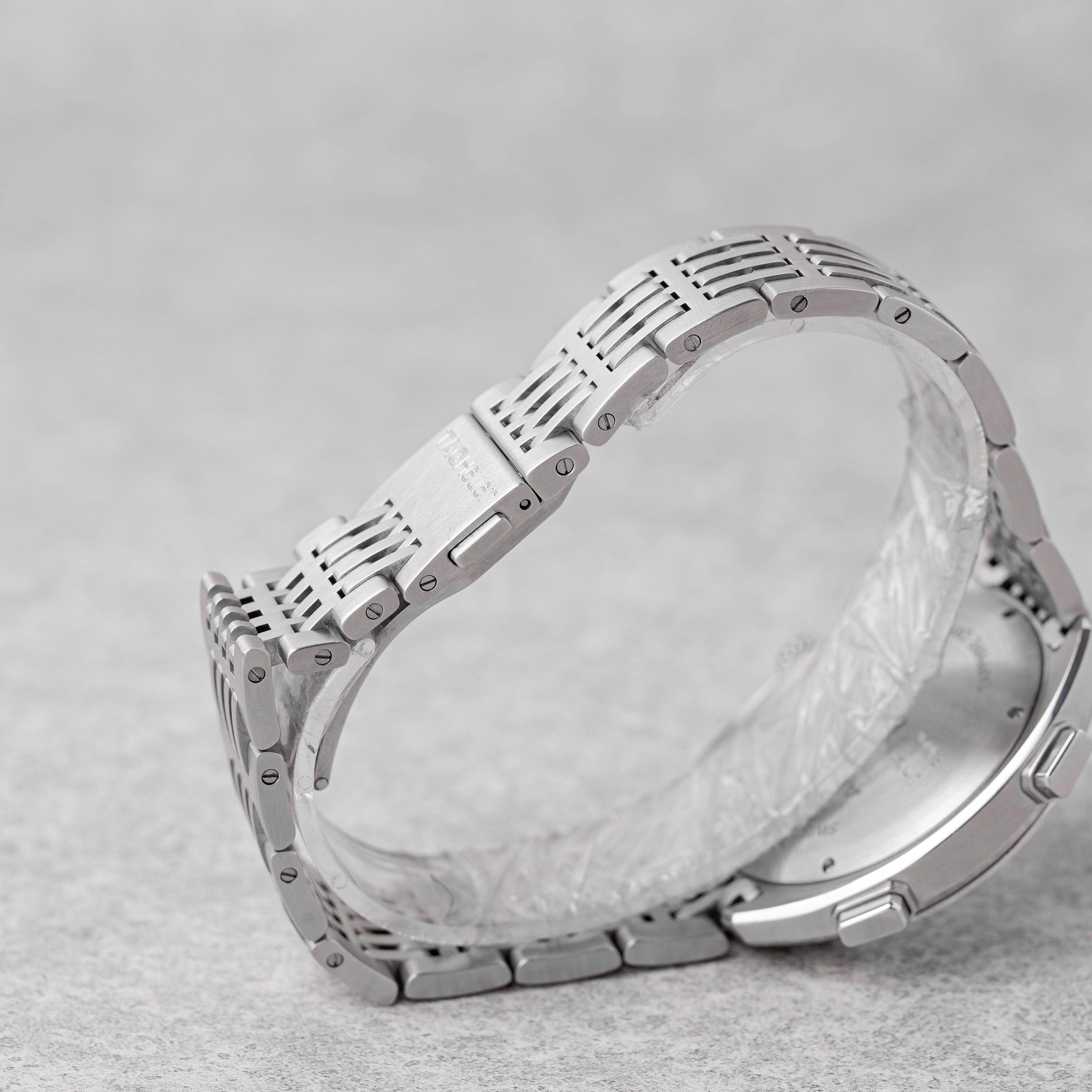 Una pieza excepcional y altamente coleccionable, este TAG Heuer Autavia “Siffert Set” es una edición limitada de solo 70 sets, creada en homenaje al 70 aniversario del Autavia e inspirada en el legendario piloto de Fórmula 1 Jo Siffert. Este completo set de coleccionista incluye tanto el reloj de pulsera de 43 mm como el raro cronómetro de tablero de 57 mm, alojados en la caja de presentación de edición limitada original con placa numerada a juego. El set viene acompañado de manuales, accesorios de montaje (tuercas y tornillos) y todos los componentes originales. El reloj presenta una llamativa esfera “Panda” en plata opalina con subesferas negras y acentos azules, un bisel taquimétrico negro y la icónica corona del lado izquierdo, impulsado por el movimiento automático Calibre 11. Está equipado con una pulsera de acero inoxidable inspirada en el clásico diseño “Granos de Arroz”. Originalmente fechado en 01/2013, el reloj ha sido revisado por TAG Heuer en 12/2025 (factura incluida). El set se encuentra en muy buen estado general, con solo ligeras marcas superficiales consistentes con un uso cuidadoso. Una oportunidad rara de adquirir una de las ediciones más exclusivas del Autavia moderno: una verdadera pieza de coleccionista que combina herencia del automovilismo, rareza y diseño icónico.