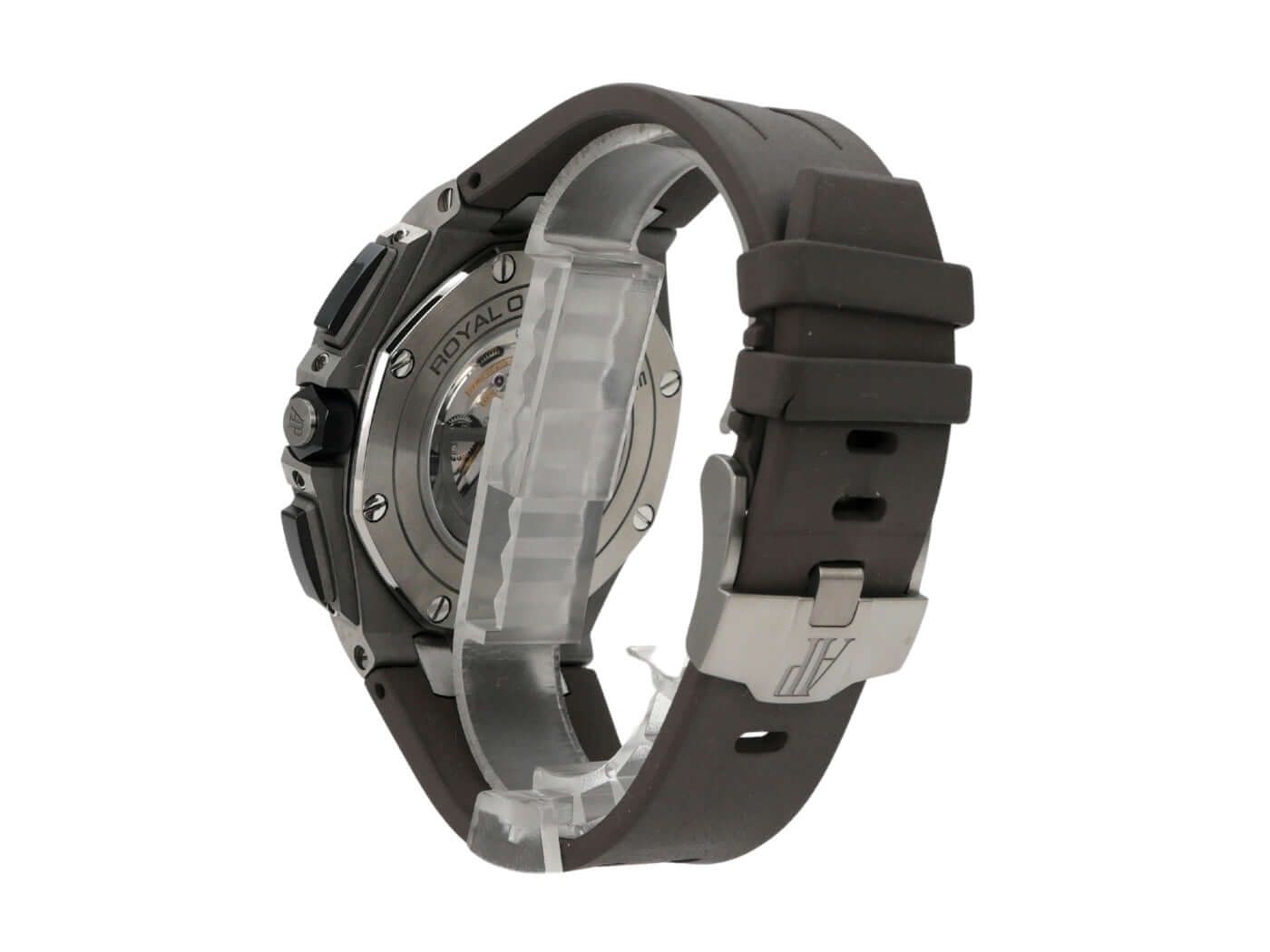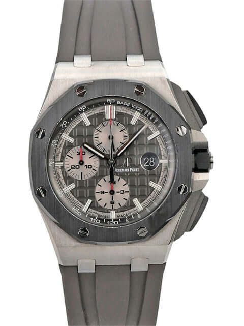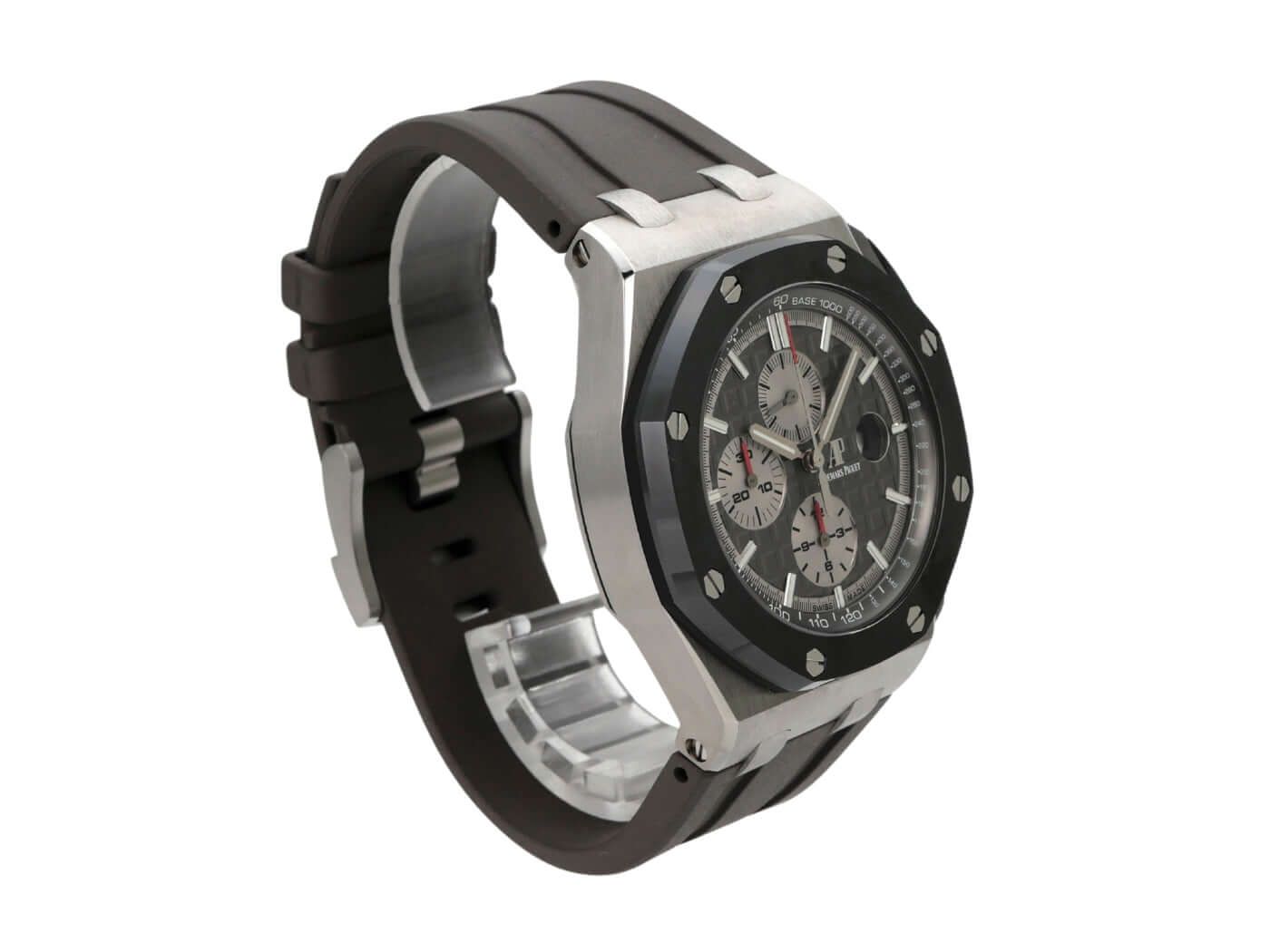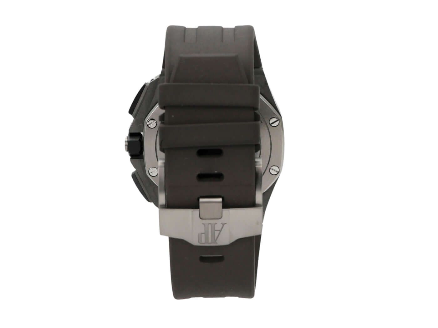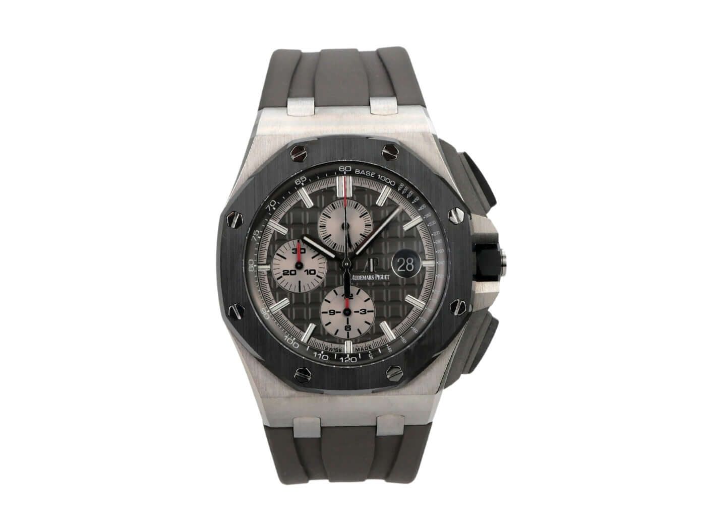 Audemars Piguet Royal Oak Offshore Chronograph Ref. 26400IO.OO.A004CA.01 from 2019Case made of polished and satin-finished titanium, case diameter 44 mm, case height 14.4 mm, screwed ceramic bezel, gray rubber strap with titanium pin buckle, gray dial with luminous indices and markers, automatic movement, manufacture caliber 3126 / 3840 with 59 jewels, frequency 21,600 A/h, power reserve approx. 50 hours, date display, anti-reflective sapphire crystal, screwed and engraved display back, water-resistant up to 10 bar.Used watch, very good condition, complete with box and papers, delivered in 2019, service done at AP in 2025, additional leather strap included.