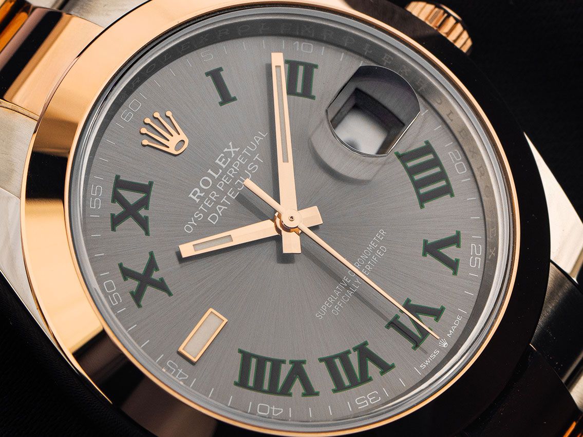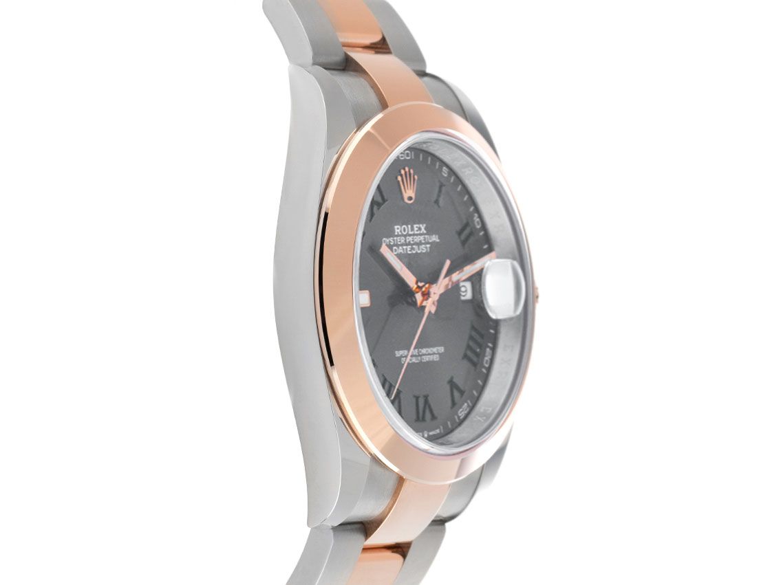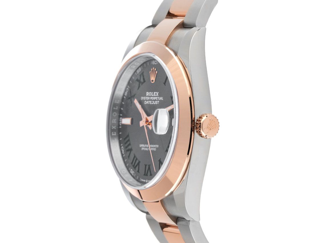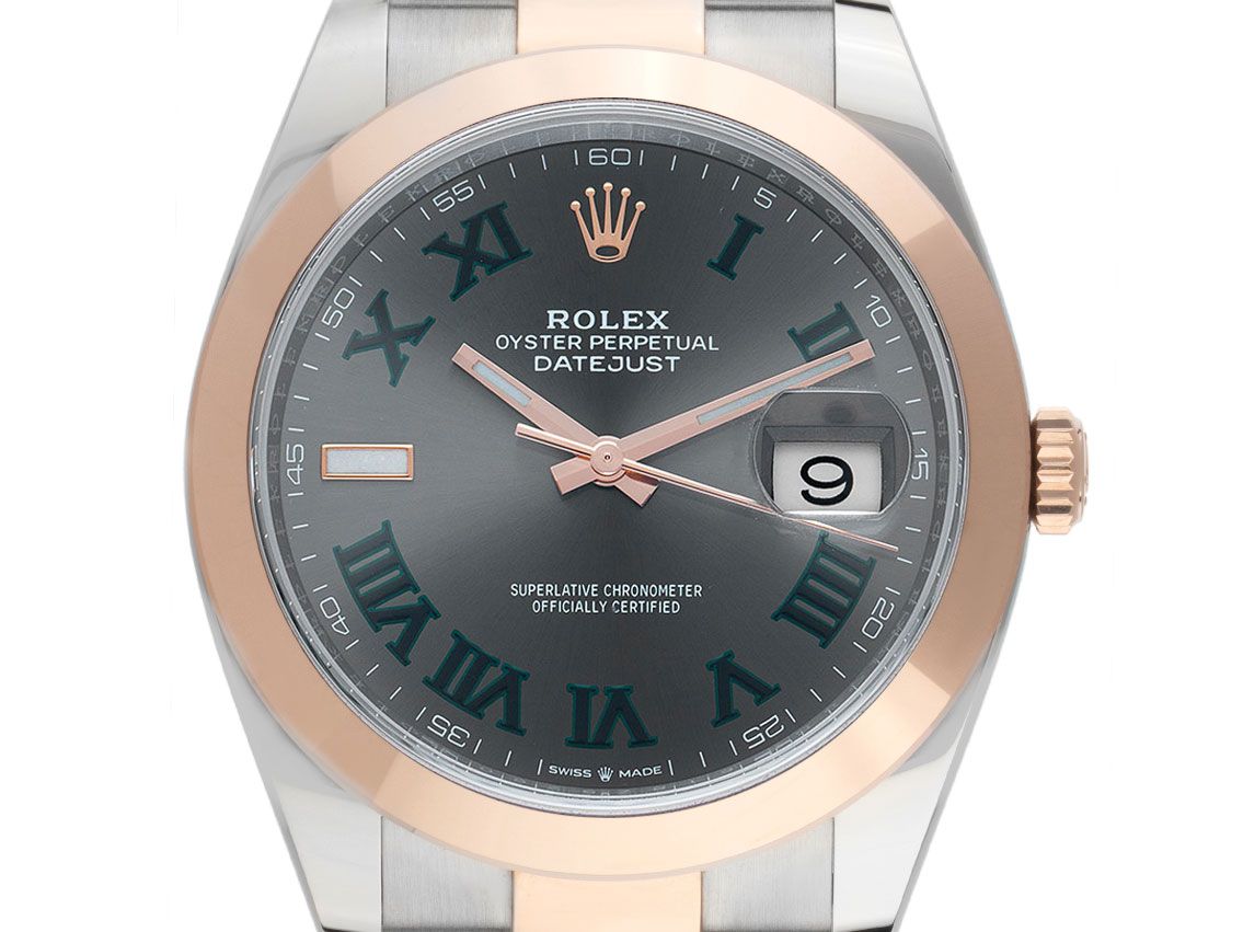 Rolex Datejust Wimbledon Stahl 18kt Roségold Everose Automatik Armband Oyster Gehäuse Edelstahl poliert und satiniert, Gehäusedurchmesser ohne Krone 41mm, Gehäusehöhe 11,4mm. Lünette 18kt Roségold Everose glatt und poliert. Armband Oyster Edelstahl / 18kt Roségold Everose poliert und satiniert, Faltschließe Edelstahl / 18kt Roségold Everose mit Hersteller-Logo. Zifferblatt schiefergrau mit aufgesetztem in Roségold gefassten Leuchtindex bei 9 Uhr, dunkelgrünen römischen Ziffern und roségoldenen Leuchtzeigern. Uhrwerk Automatik, Chronometer mit Zeugnis, Rolex Manufakturkaliber 3235 mit 31 Edelsteinen, Gangreserve ca. 70 Stunden. Anzeige von Stunde, Minute und Sekunde über Zeiger aus der Mitte mit Sekundenstopp zur sekundengenauen Einstellung der Uhrzeit, Datumsanzeige mit Schnellverstellung unter Glaslupe bei 3 Uhr. Saphirglas kratzfest. Krone verschraubbar mit Hersteller-Logo. Boden Edelstahl verschraubt. Gewicht der Uhr inklusive Armband 150g, Länge des Armbandes inklusive Gehäuse 185mm. Wasserdicht bis 10 ATM. Referenznummer: 126301, Gehäusenummer: 1V271XXX, ID: P2855230000426HW-16350/16350, Artikelnummer: 10000085553. Mit Gangkontrolle und kompletter äußerlicher Aufarbeitung von April 2026. Original Rolex Box mit Umkarton und Garantie Papiere von Juli 2021, neue Rolex Garantie Karte ohne Ländercode sowie Beschreibung, Ledermäppchen, Rolex Chronometer-Siegel und Watchregister Auszug von April 2026, The Watch Register Zertifikat / ohne Eintrag (Internationale Datenbank für verlorene oder gestohlene Uhren), inkl. Erstkaufrechnung und Rolex Service Card mit Rechnung von Juni 2024, Full Set. Superschnäppchen, Kapitalanlage mit Wertsteigerungspotential. Wie Neu. Lieferzeit sofort. Inklusive certified pre owned Siegel / Uhrenpass mit einem Farbbild, der genauen Beschreibung sowie dem Wiederbeschaffungswert der Uhr über 16350,-€ und 1000 Tage Garantie ab Kaufdatum.