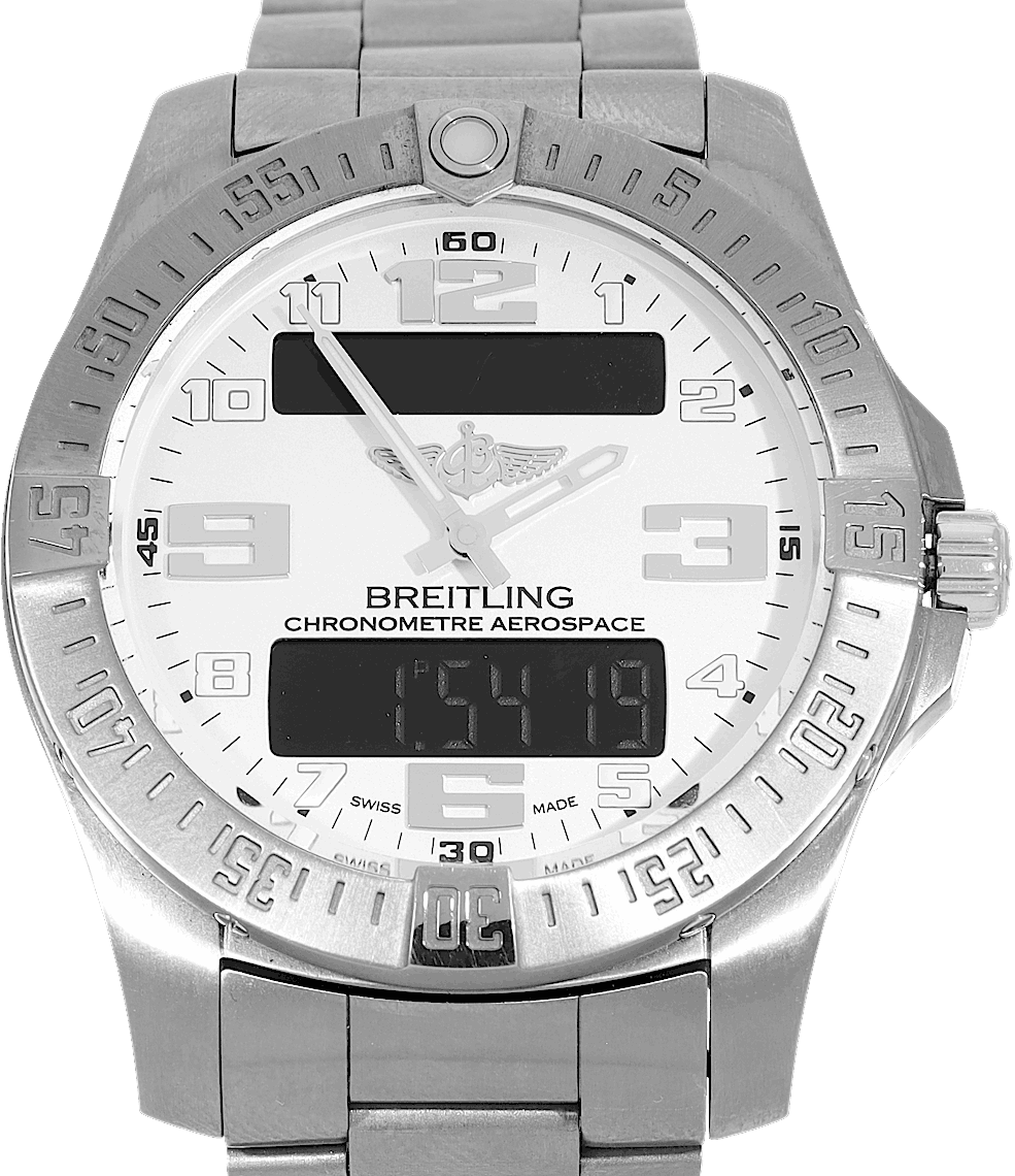 Breitling Aerospace EVO, Reference: E79363, Gender: Male, Size: 42mm, Dial color: White, Strap material: Titanium, Movement: Quartz, Year: 2019, Condition: Previously worn, minor to no signs of usage. The movement is flawless and the case has been cleaned. watch tested ensure full functionality. An inspection by our certified watchmakers guarantees its authenticity., Documents: Original papers, CHRONEXT Certificate