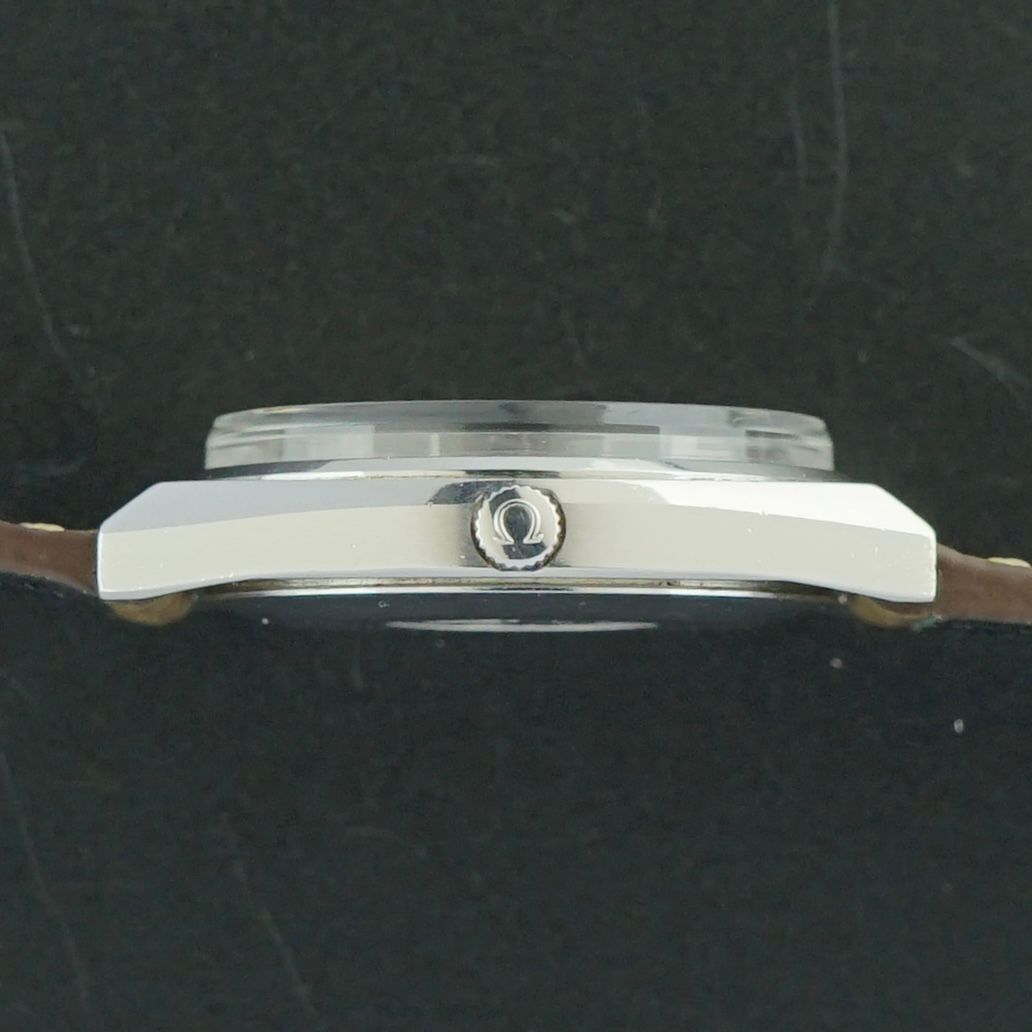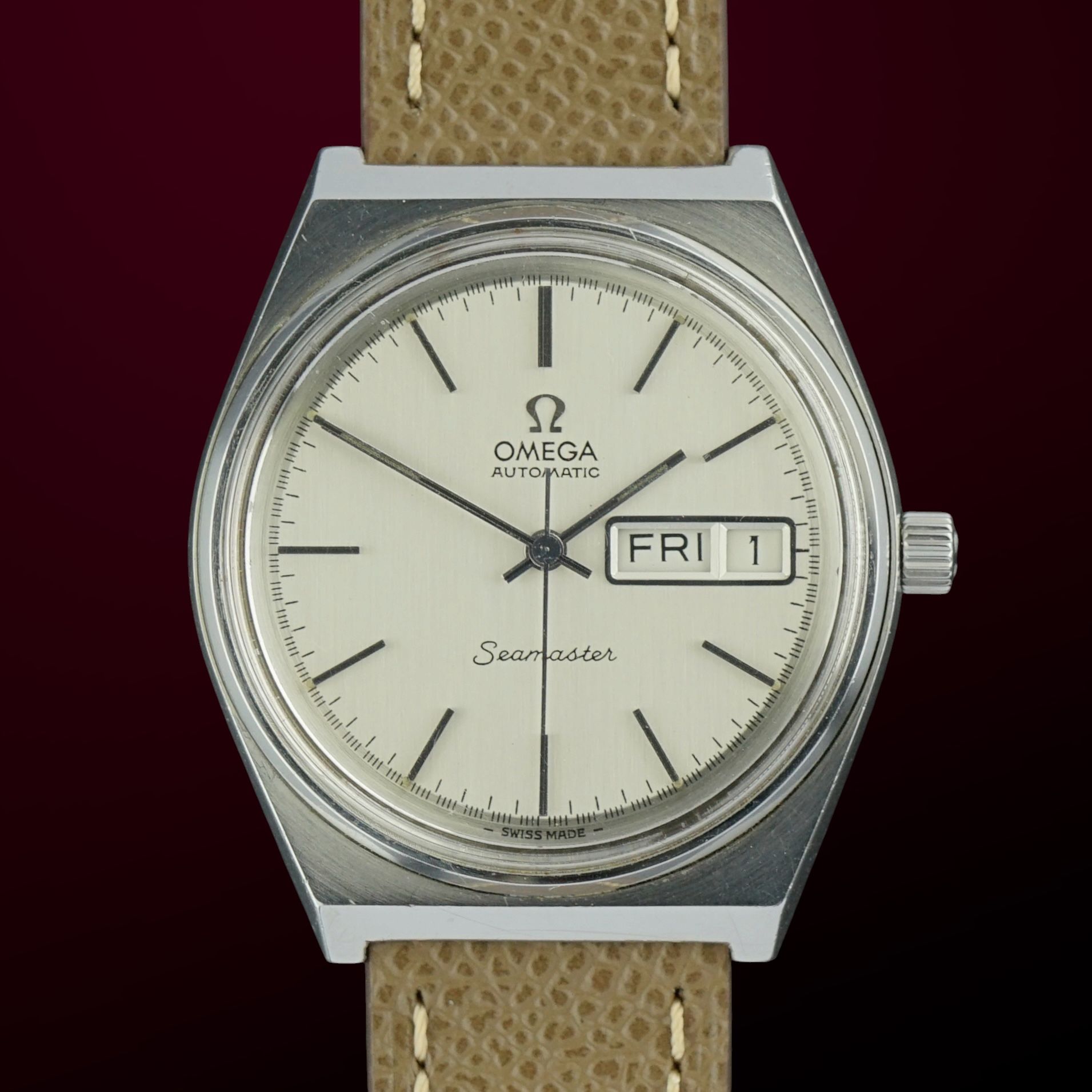 A Vintage Omega Seamaster Automatic Day-Date from 1975, featuring a beautiful silver dial with a vertically brushed finish that remains in impeccable shape. It has a day-date function at the 3 o’clock position with English weekdays, both the date and day are quickset thanks to the caliber 1022 automatic movement, which was overhauled in April 2026 and now runs and functions well. The steel case measures 35.5mm excluding crown and remains in great condition. Fitted with a tan brown leather strap, this piece makes for a beautiful daily wearer and a great addition to any collection.Year of production: 1975