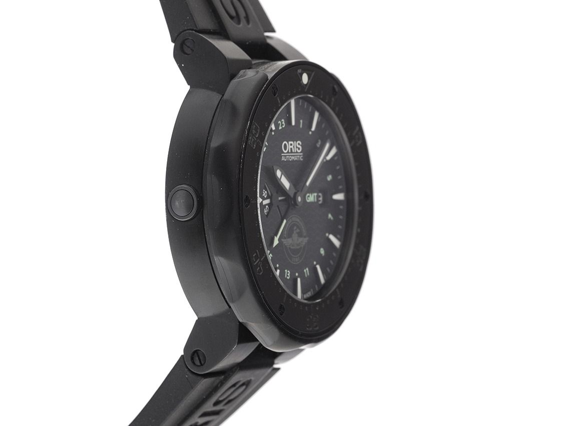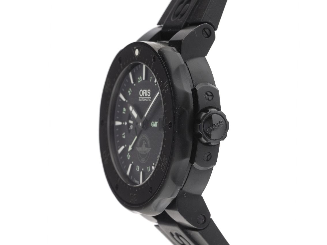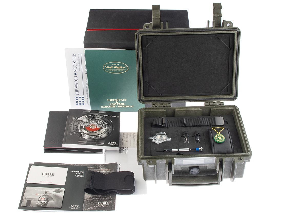 Oris Force Recon GMT Titan beschichtet Automatik Armband Kautschuk FaltschließeGehäuse Titan beschichtet satiniert, Gehäusedurchmesser ohne Krone 49mm, Gehäusehöhe 16,0mm. Lünette Titan beschichtet mit schwarzem Keramik Inlay und 60-Minuten Skala, einseitig drehbar mit Sicherungsring zum hochziehen. Armband Kautschuk schwarz, Anstoßbreite 26mm, Sicherheitsfaltschließe Titan beschichtet mit Hersteller-Logo. Zifferblatt schwarz mit Wellendekor, aufgesetzten schwarzen Indexen und schwarzen Zeigern. Uhrwerk Automatik, Kaliber Oris 747. Anzeige von Stunde und Minute über Zeiger aus der Mitte, kleine Sekunde mit Sekundenstopp zur sekundengenauen Einstellung der Uhrzeit bei 9 Uhr, Datumsanzeige mit Schnellverstellung bei 3 Uhr, zweite Zeitzone (GMT) ablesbar über Zeiger aus der Mitte. Saphirglas kratzfest. Krone verschraubbar mit Flankenschutz und Hersteller-Logo. Boden Titan beschichtet, verschraubt und graviert (United States Marine Corps). Gewicht der Uhr inklusive Armband 146g. Referenznummer: 01 747 7715 7754, Gehäusenummer: 3428XXX, ID: P287718000426HW-4700, Artikelnummer: 10000085592. Mit Gangkontrolle und kompletter äußerlicher Reinigung von April 2026. Original Oris Box mit Umkarton und Garantie Papiere von Juni 2019, Wechselband Textil, Bandwechselwerkzeug, original Kaufrechnung sowie Watchregister Auszug von April 2026, The Watch Register Zertifikat / ohne Eintrag (Internationale Datenbank für verlorene oder gestohlene Uhren), Full Set. Superschnäppchen, sehr seltenes Sammlerstück. Sehr guter Zustand. Lieferzeit sofort.