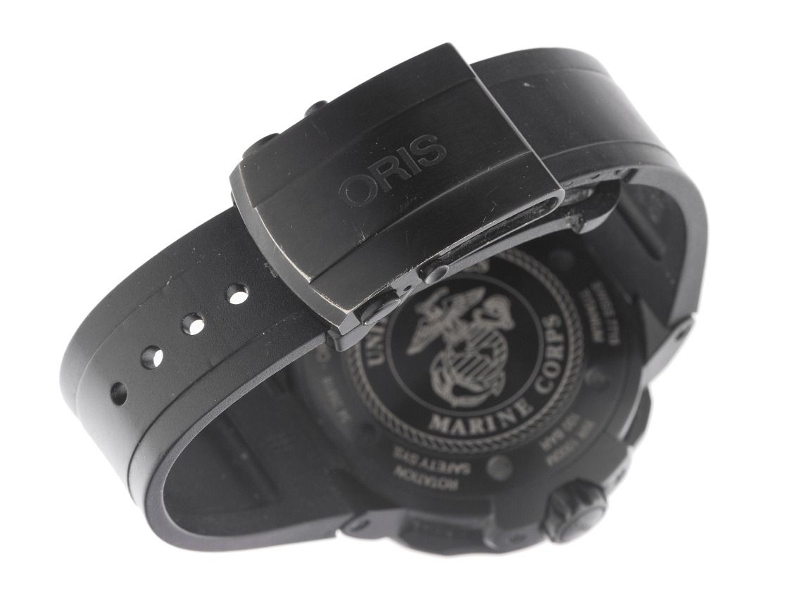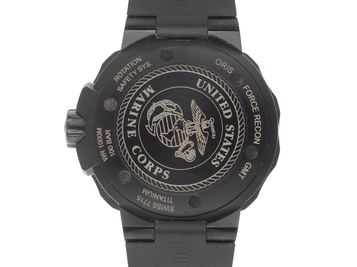 Caja recubierta de titanio satinada, diámetro de la caja sin corona 49mm, altura de la caja 16,0mm. Bisel recubierto de titanio con inserto de cerámica negra y escala de 60 minutos, unidireccional con anillo de seguridad para levantar. Pulsera de caucho negra, ancho de asas 26mm, cierre desplegable de titanio recubierto con logo del fabricante. Esfera negra con decoración de olas, índices negros aplicados y manecillas negras. Movimiento automático, calibre Oris 747. Indicador de horas y minutos a través de manecillas centrales, segundero pequeño con parada de segundos para ajuste preciso de la hora a las 9, indicador de fecha con ajuste rápido a las 3, segunda zona horaria (GMT) legible a través de manecillas centrales. Cristal de zafiro resistente a los arañazos. Corona atornillada con protección lateral y logo del fabricante. Fondo recubierto de titanio, atornillado y grabado (Cuerpo de Marines de los Estados Unidos). Peso del reloj incluyendo la pulsera 146g. Número de referencia: 01 747 7715 7754, número de caja: 3428XXX, ID: P287718000426HW-4700, número de artículo: 10000085592. Con control de marcha y limpieza exterior completa de abril de 2026. Caja original de Oris con caja exterior y documentos de garantía de junio de 2019, correa de repuesto de textil, herramienta para cambiar la correa, factura original de compra y extracto del registro de relojes de abril de 2026, certificado de The Watch Register / sin entrada (base de datos internacional de relojes perdidos o robados), Full Set. Superoferta, pieza de colección muy rara. Muy buen estado. Tiempo de entrega inmediato.