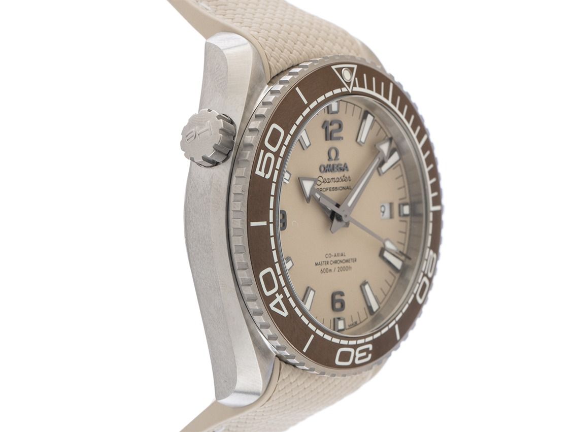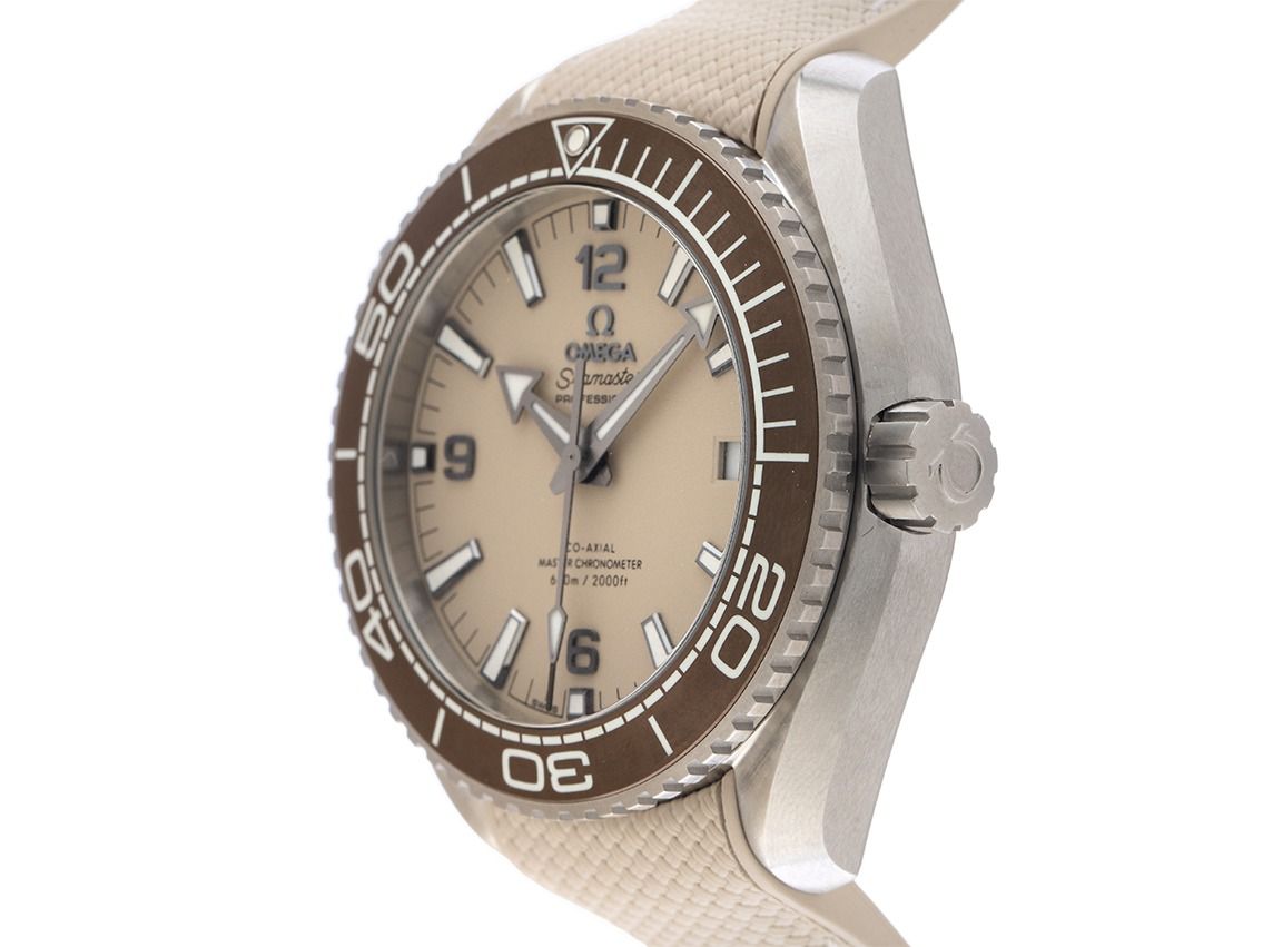 Caja de acero inoxidable pulido y satinado, diámetro de la caja sin corona 43,5 mm, altura de la caja 16,2 mm. Bezel de acero inoxidable con inserto de cerámica marrón, escala de 24 horas y punto luminoso, giratorio unidireccional. Válvula de helio a las 10 en punto. Correa de caucho beige con costura decorativa clara, ancho de asas 21 mm, cierre de seguridad plegable de acero inoxidable con logo del fabricante. Esfera color lino con índices luminosos aplicados y números árabes, así como manecillas luminosas de acero inoxidable. Movimiento automático, Master Chronometer con certificado, calibre Omega 8900 con escape Co-Axial y 39 rubíes. Reserva de marcha de aproximadamente 60 horas. Indicador de hora, minuto y segundo a través de manecillas centrales, con parada de segundos para un ajuste preciso de la hora, indicador de fecha con ajuste rápido a las 3 en punto. Cristal de zafiro resistente a los arañazos, abombado y antirreflejos por ambas caras. Corona atornillada con logo del fabricante. Fondo atornillado y grabado con ventana de cristal de zafiro. Peso del reloj incluyendo la correa 136 g. Resistente al agua hasta 60 ATM. Número de referencia: 215.32.44.21.09.001, ID: ST1160115960125H-8200, número de artículo: 10000078327. Caja original de Omega con caja exterior y documentos de garantía de enero de 2025, Full Set. Sin usar. Tiempo de entrega inmediato.