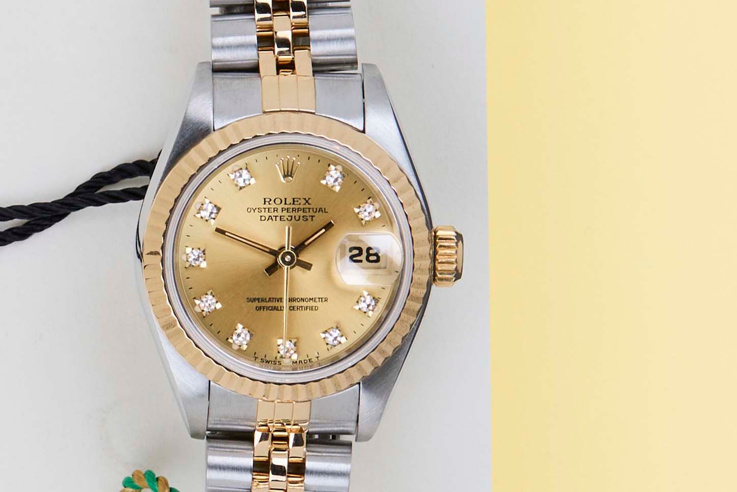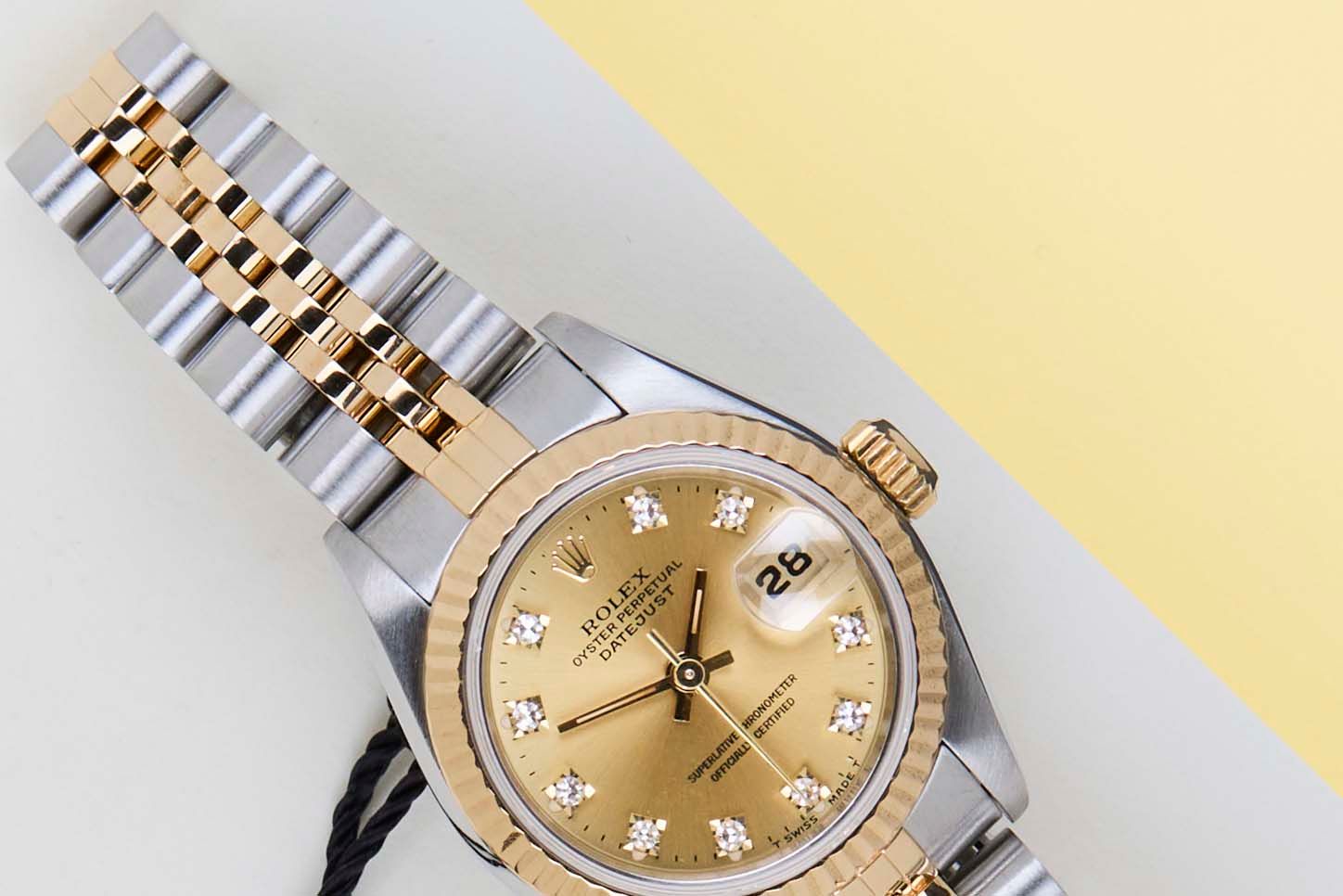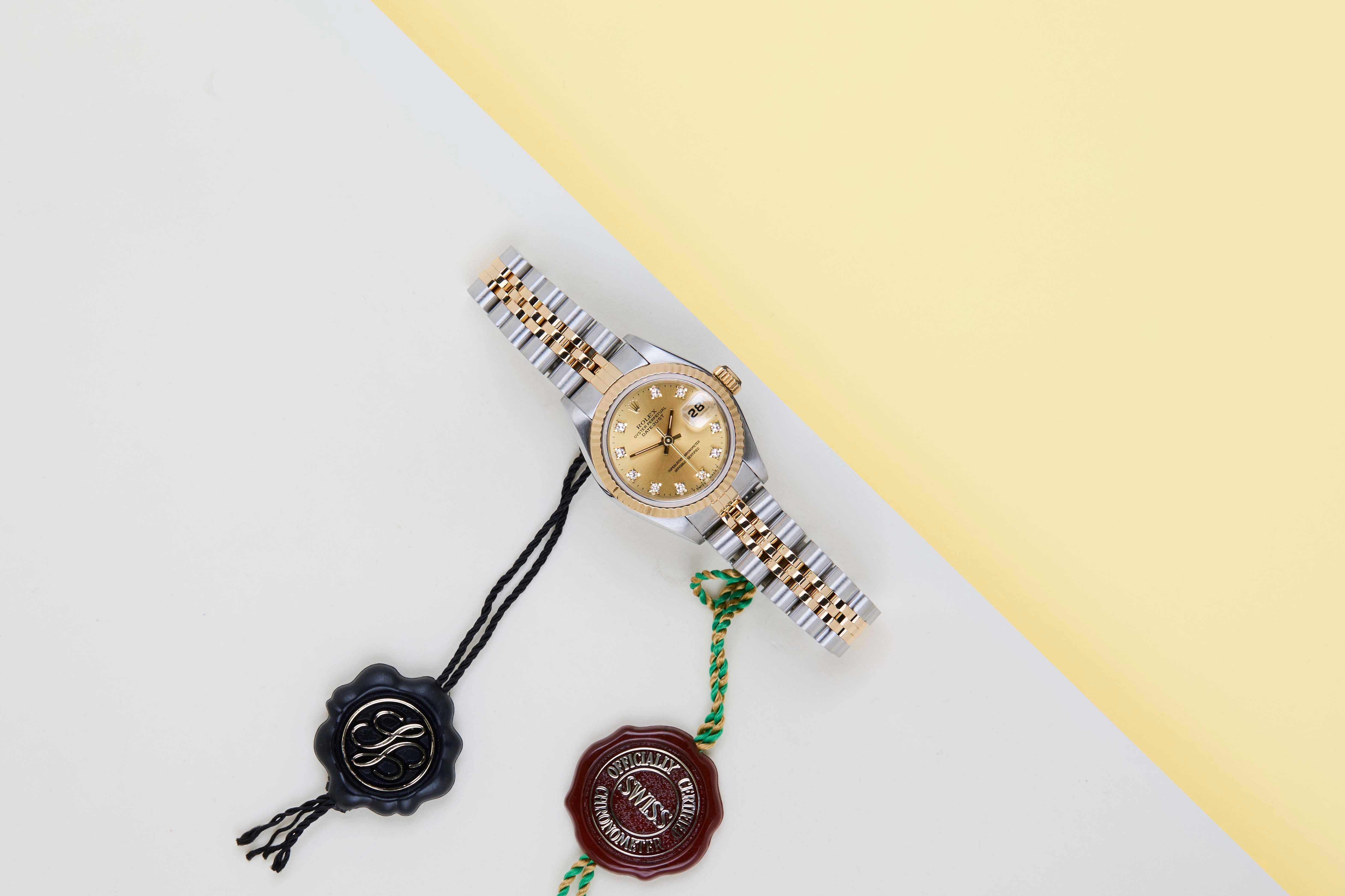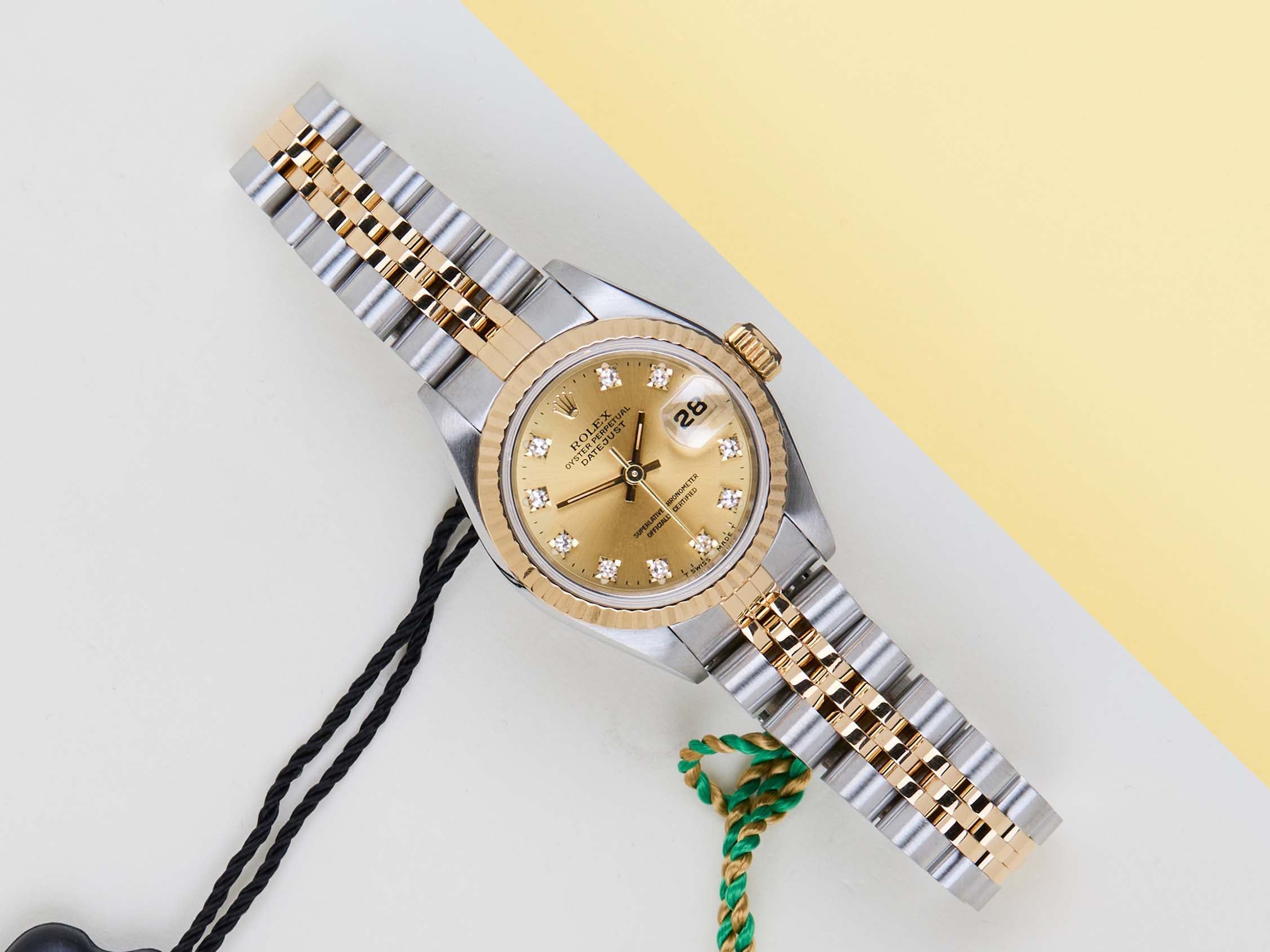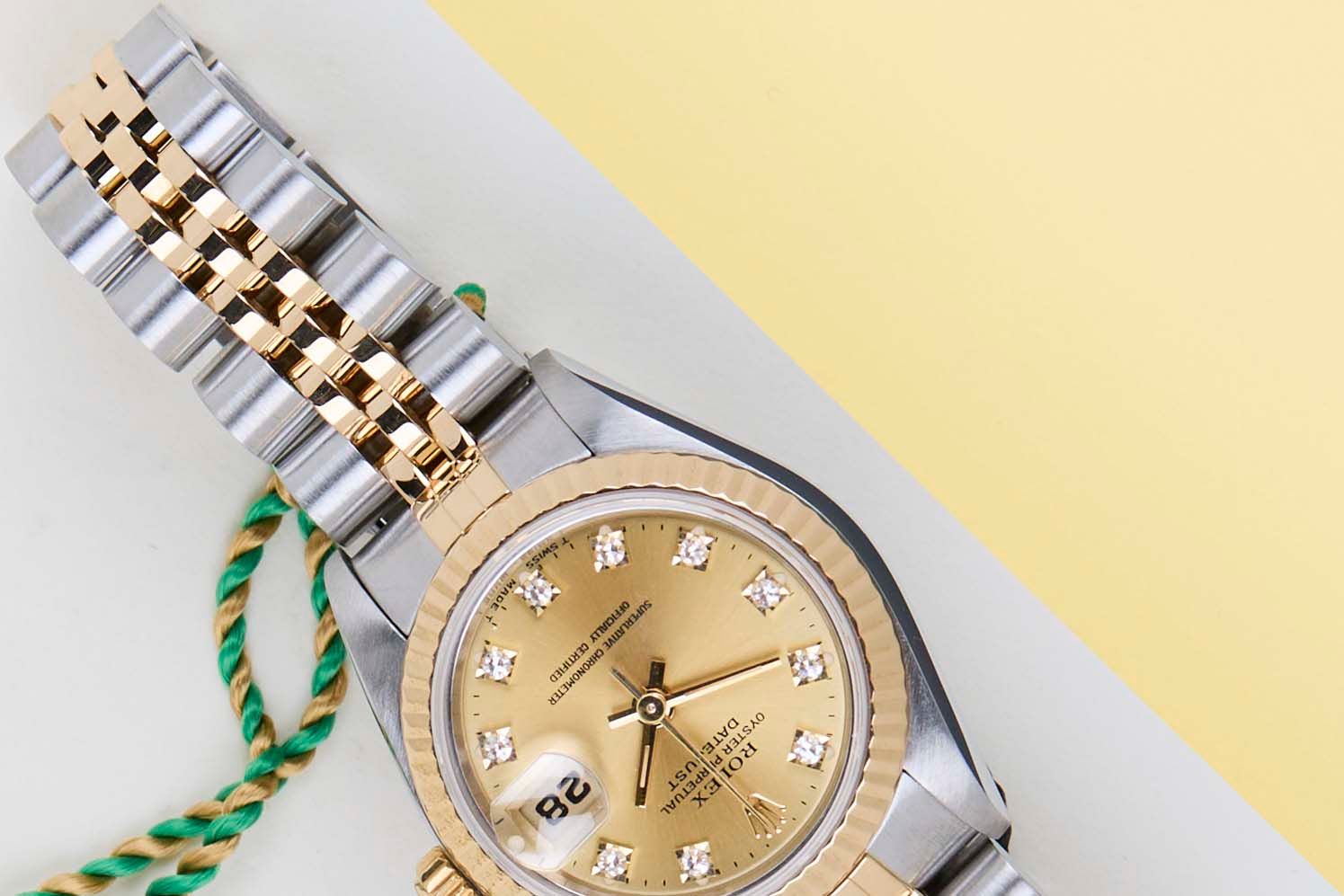 Full Set | European Warranty Card (LC110 - France)Rolex introduced the original Datejust in 1945 to celebrate the company's 40th anniversary. Due to the enormous success, Rolex released the first Lady-Datejust in 1957.This Rolex Datejust 26 'Champagne Diamond Dial - Jubilee' dates back to 1994.This Datejust is made of a combination of 18k Yellow Gold and stainless steel and is fitted with a Jubilee bracelet.This Rolex Datejust 26 is in Mint condition and comes with the original Rolex Warranty Card and box. Furthermore, the watch has been serviced by our watchmakers and therefore has One Year of Steiner Warranty.