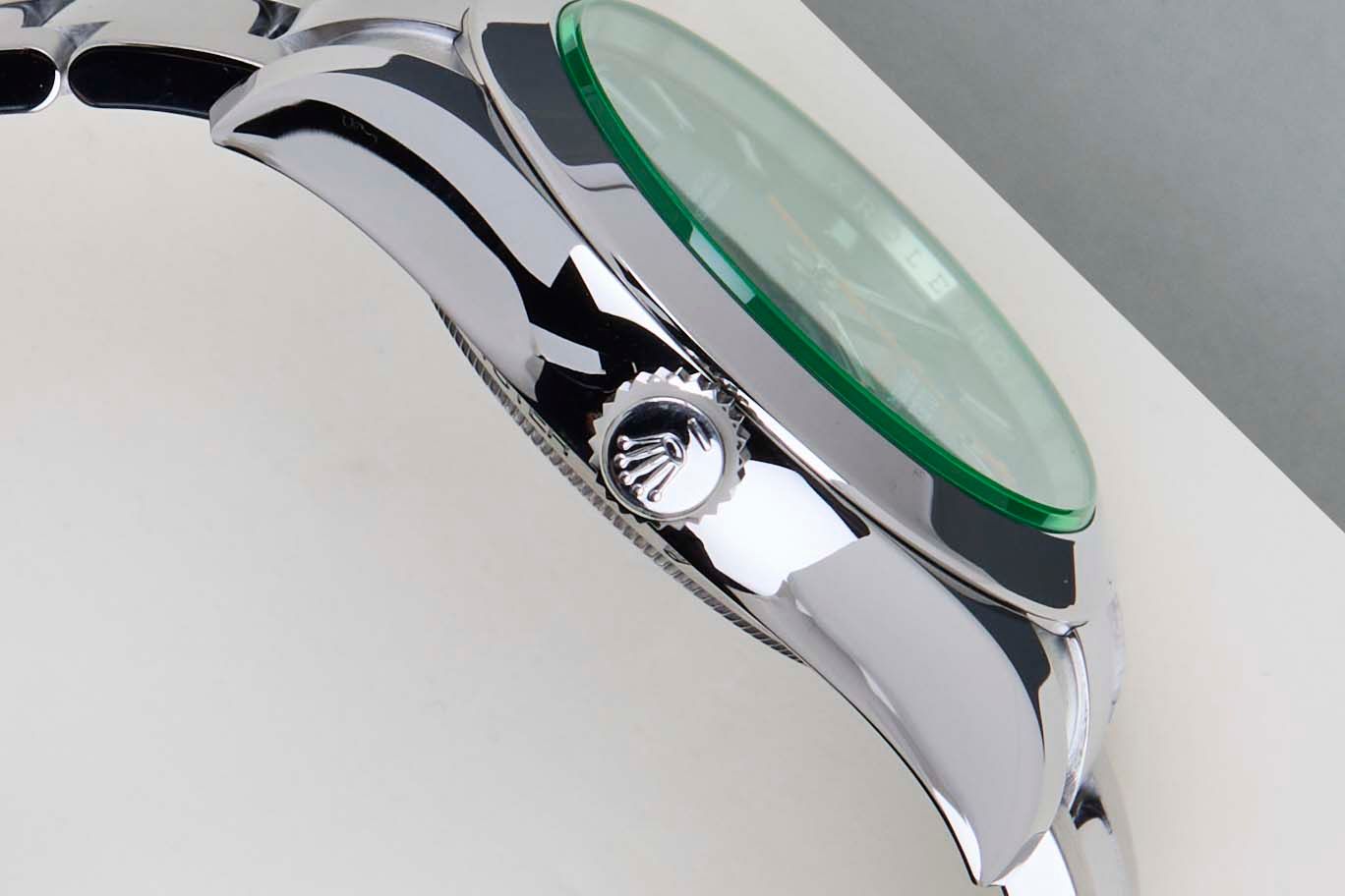- Signos leves de uso como microarañazos o pequeños arañazos superficiales. La caja, el bisel y el brazalete conservan sus aristas definidas y su forma general. Puede haber sido pulido profesionalmente sin afectar a las líneas originales. Totalmente funcional mecánicamente.