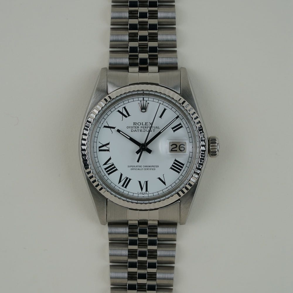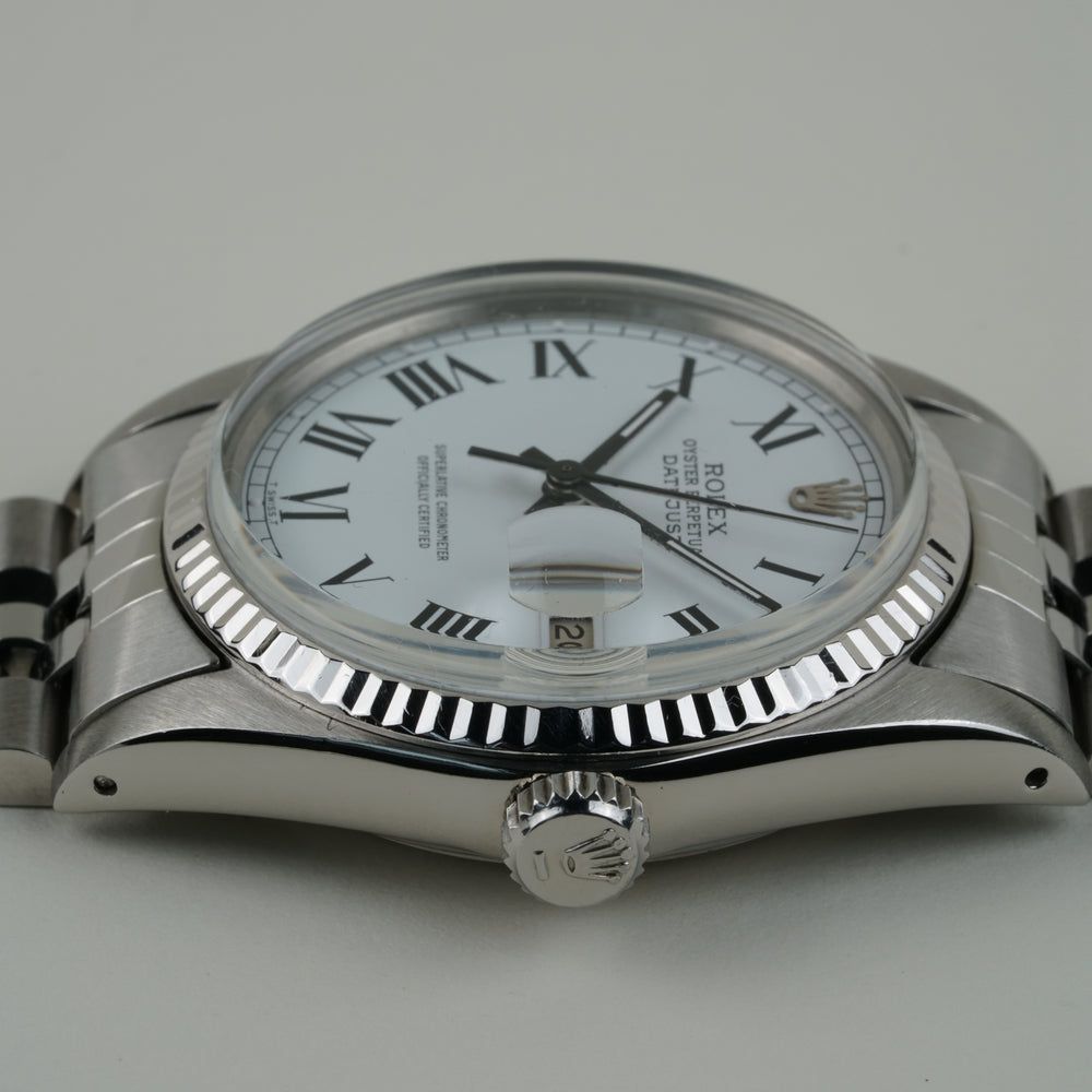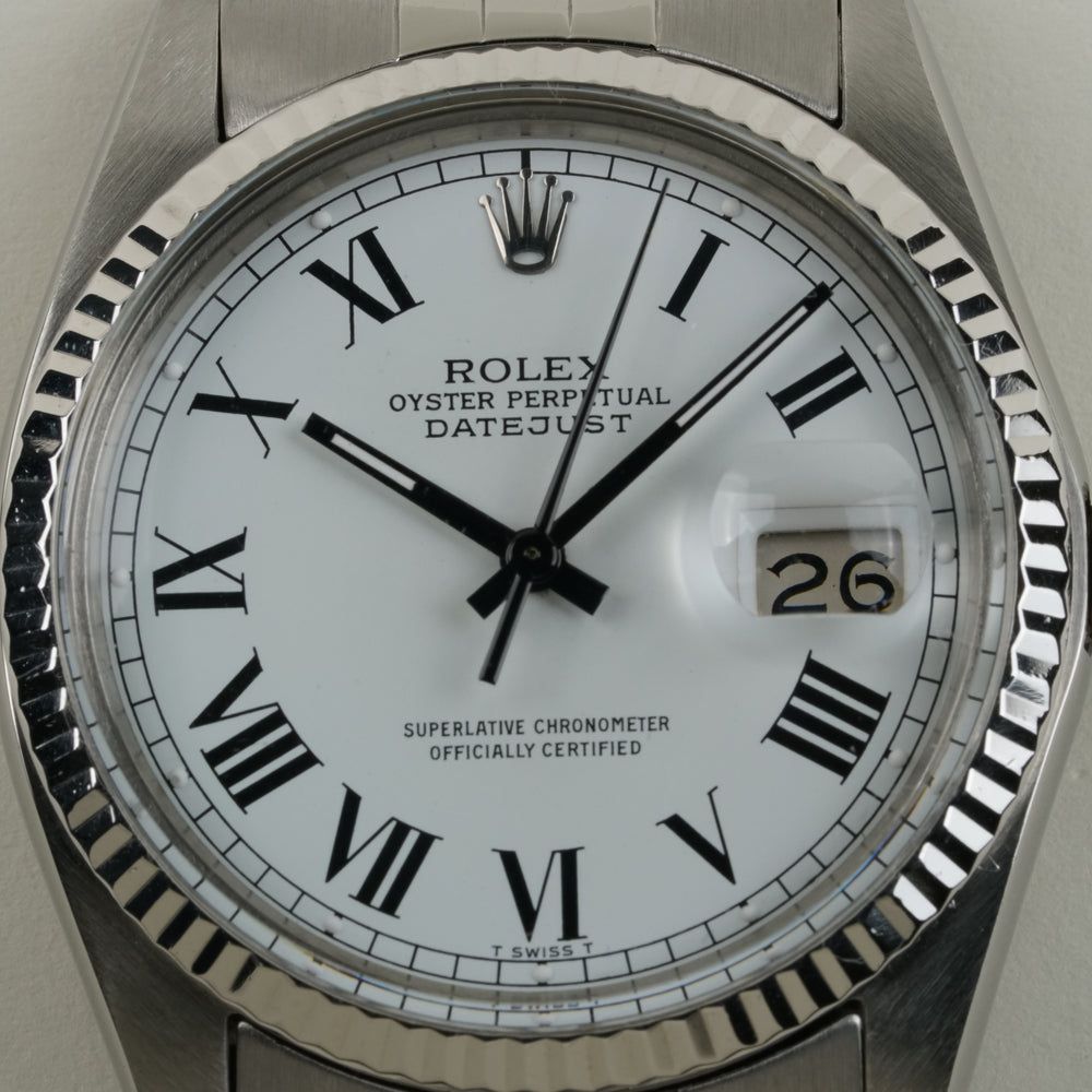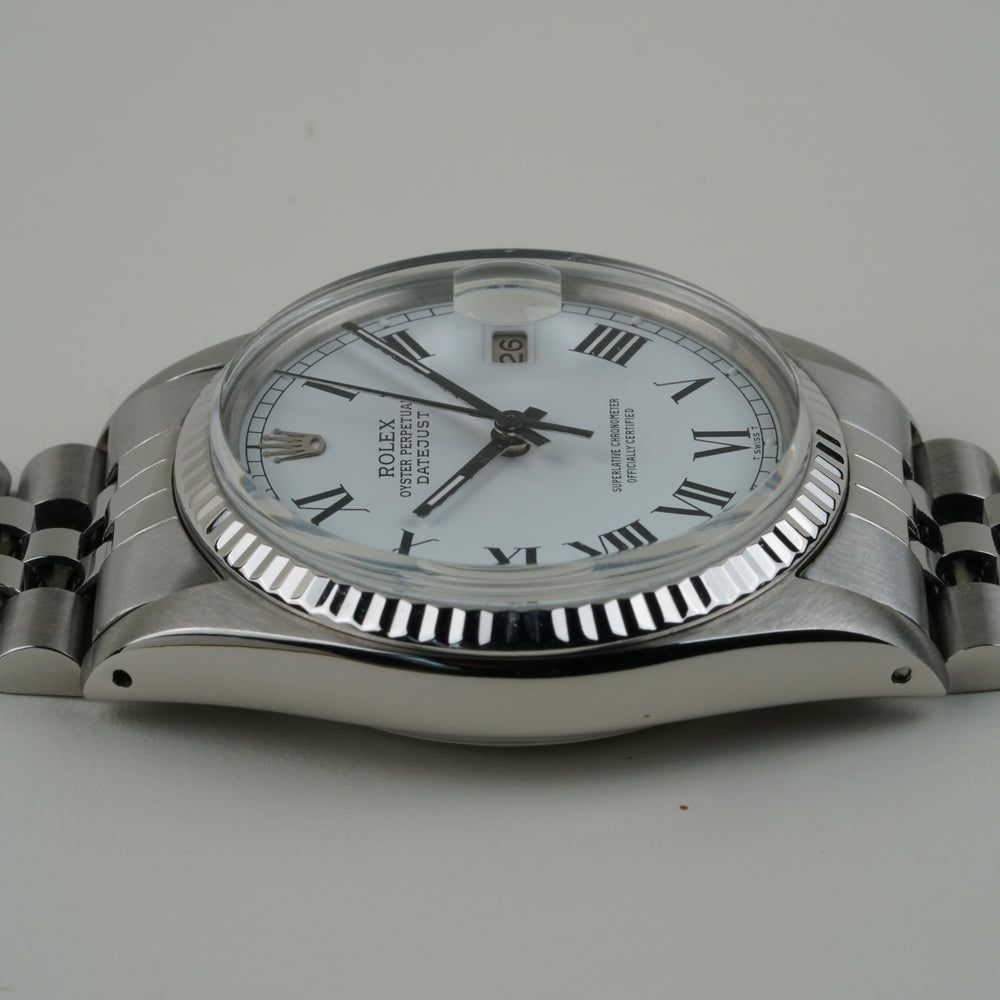 El Rolex Datejust (Ref. 16014) es una obra maestra de lujo discreto. Mientras que la mayoría de los Datejust brillan en oro, esta versión opta por la combinación fresca y elegante de acero inoxidable y un bisel estriado de oro blanco de 18k. Sin embargo, el verdadero centro de atención de este reloj es la esfera blanca Buckley. Con sus llamativos números romanos impresos en negro y sus agujas a juego en negro, este reloj ofrece una legibilidad y un perfil visual único que rara vez se encuentra en las colecciones regulares. Bajo el clásico plexiglás, late el fiable Calibre 3035 de Rolex. Este fue el primer movimiento Datejust con la revolucionaria función de fecha "Quickset", que permite ajustar la fecha con un simple giro de la corona sin tener que avanzar la hora. Esto convierte al 16014 en el Rolex "vintage" ideal para quienes desean el encanto clásico, pero no las molestias de un reloj anticuado. Con su caja de 36 mm y la icónica pulsera Jubilee de acero, este reloj es la definición de versatilidad. Este ejemplar se encuentra en excelente estado, con la esfera y las agujas manteniendo su contraste original y nítido. Para el coleccionista que busca un Datejust que sea un poco diferente — un reloj con una historia y una 'cara' única — este Buckley 16014 es una recomendación absoluta.