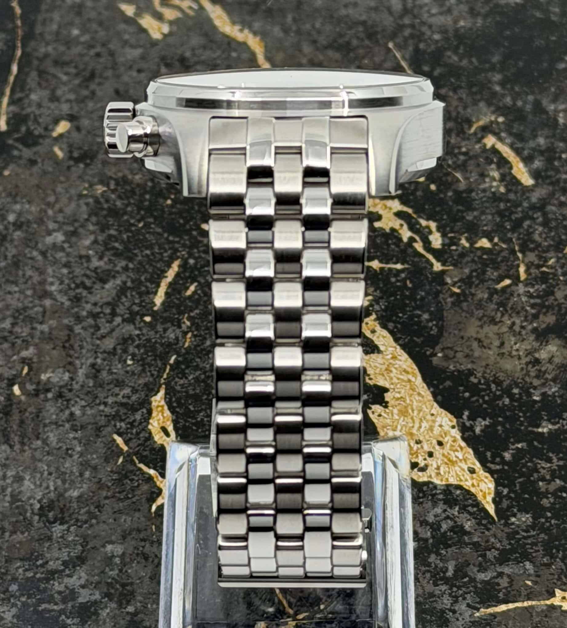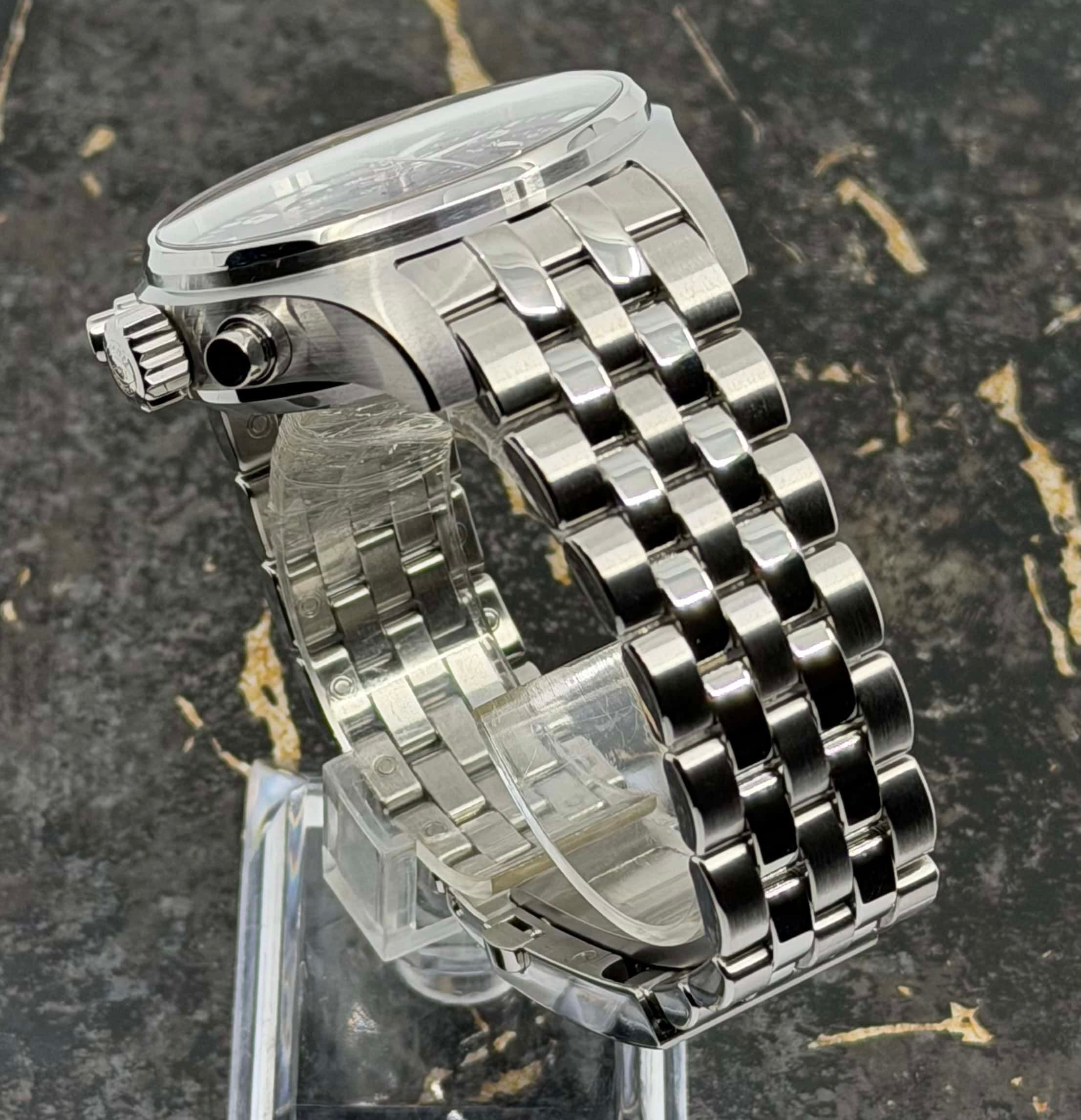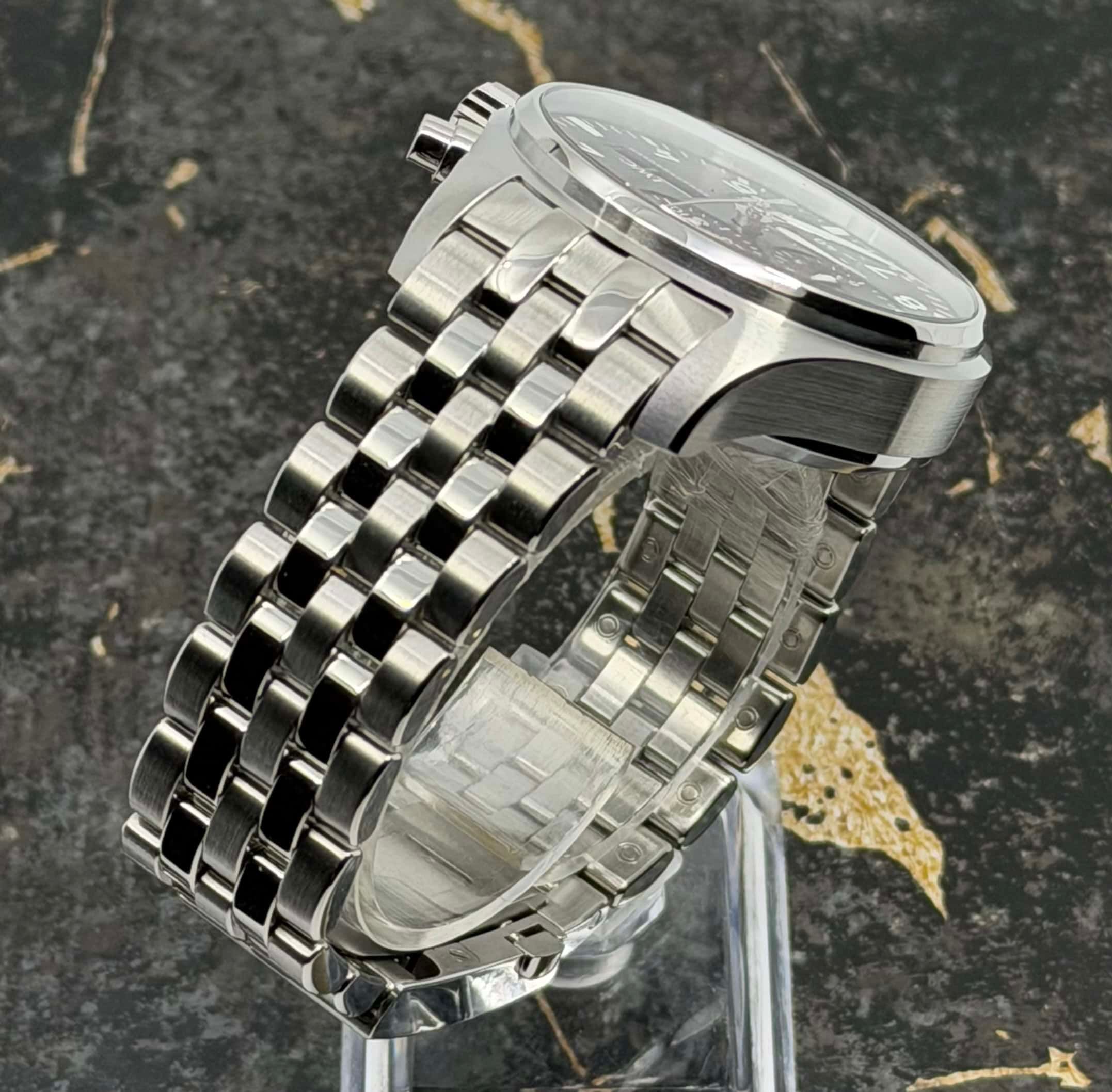 - Signos leves de uso como microarañazos o pequeños arañazos superficiales. La caja, el bisel y el brazalete conservan sus aristas definidas y su forma general. Puede haber sido pulido profesionalmente sin afectar a las líneas originales. Totalmente funcional mecánicamente.