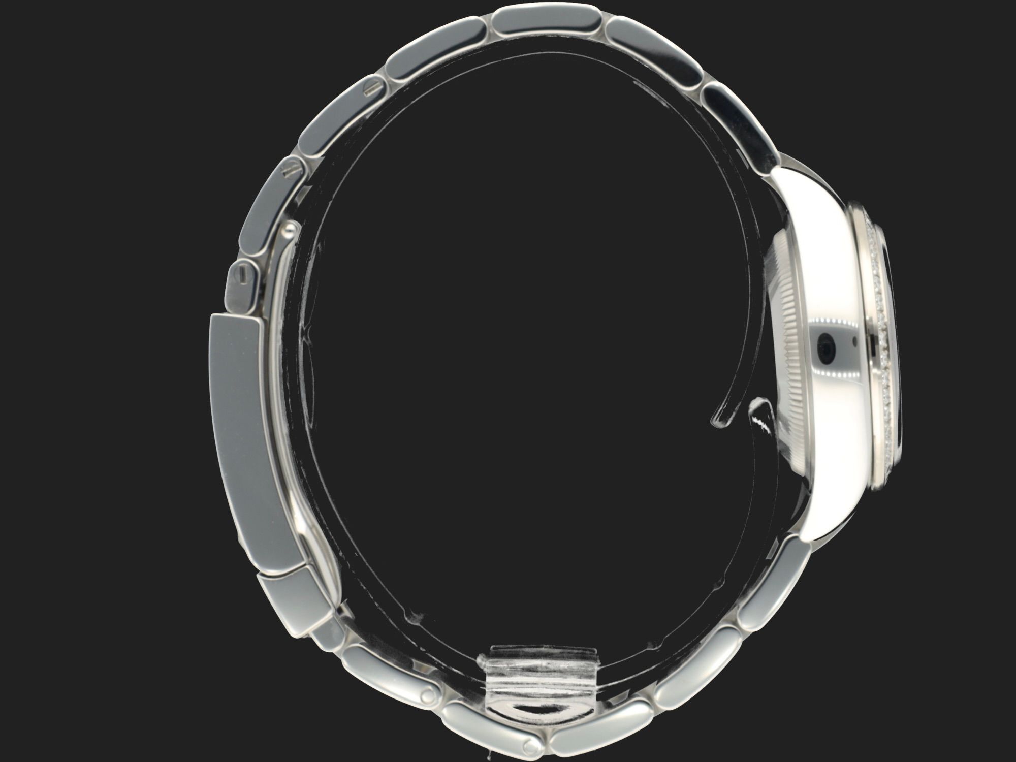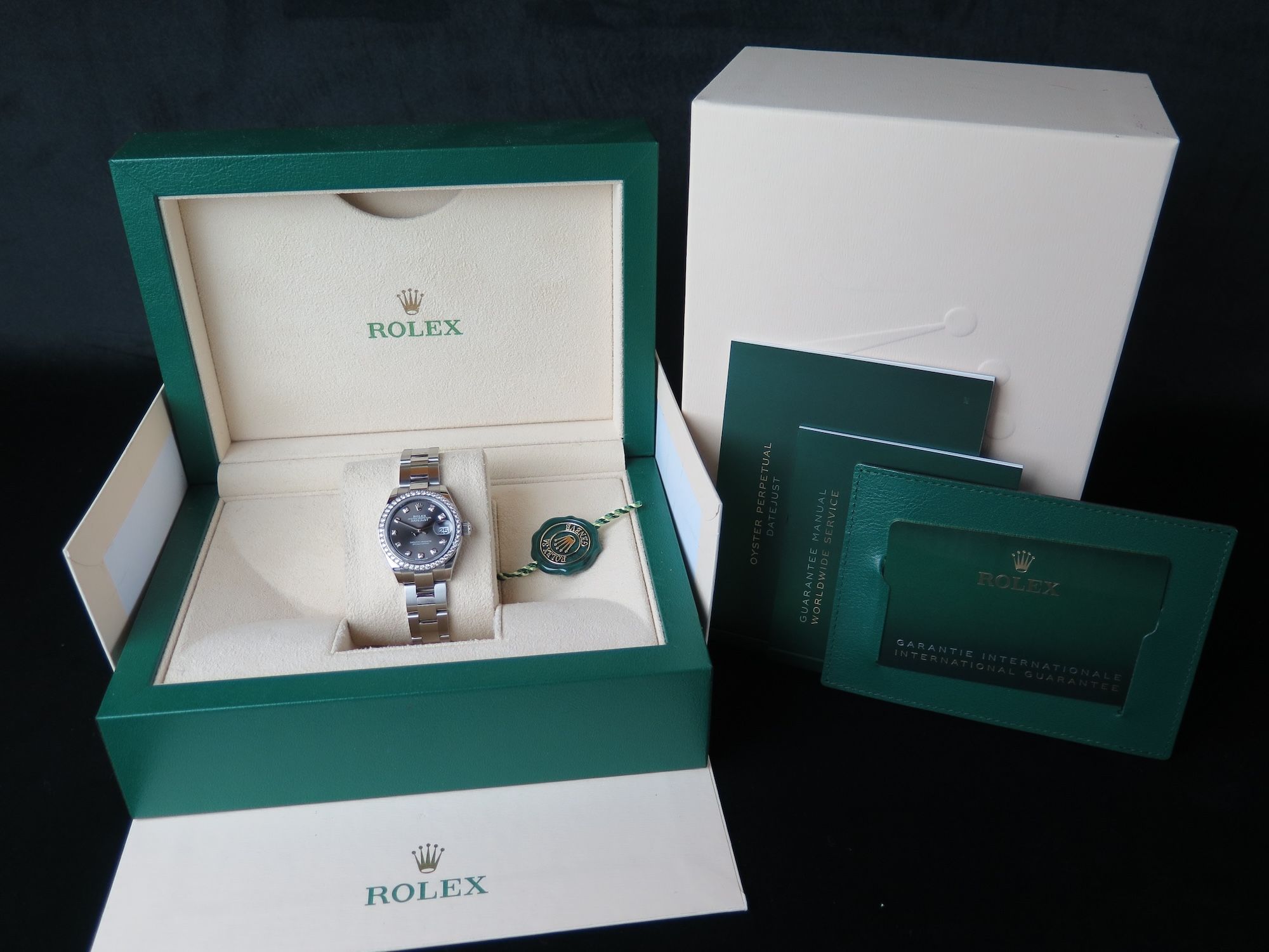 El color de la esfera es gris oscuro con índices de diamantes. Bisel de diamantes engastado de fábrica. Vendido originalmente por Rolex el 01/2023.