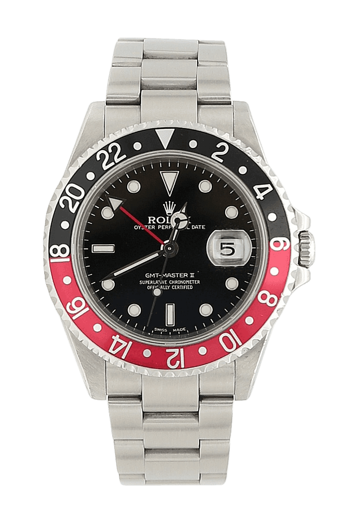 For sale at Debonar Watches: pre-owned Rolex GMT Master II ref. 16710, in very good conditions.This watch is also known as Rolex GMT Master II "Coke", due to the characteristic color of its bezel.The GMT Master II 16710 is powered by the Rolex calibre 3185 automatic movement with GMT hand and quick set functions.A bit of its story:The GMT Master II 16710 was released by Rolex in 1989 until 2007: all the versions of the now iconic Rolex GMT Master II 16710 featured a black dial and red GMT hand.They’re modern watches with all the reliability you’d expect but with a decent dose of old-style charm. BRAND ROLEX MODEL GMT MASTER II REFERENCE 16710 CASE MATERIAL STEEL MOVEMENT AUTOMATIC DIMENSION 40 MM DIAL BLACK BEZEL STEEL ("COKE") CRYSTAL SAPPHIRE BRACELET TYPE BRACELET BRACELET MATERIAL STEEL BRACELET LENGHT 15.5 CM ORIGINAL BOX NO ORIGINAL PAPERS NO YEAR APPROX. END OF '90s CONDITION VERY GOOD
