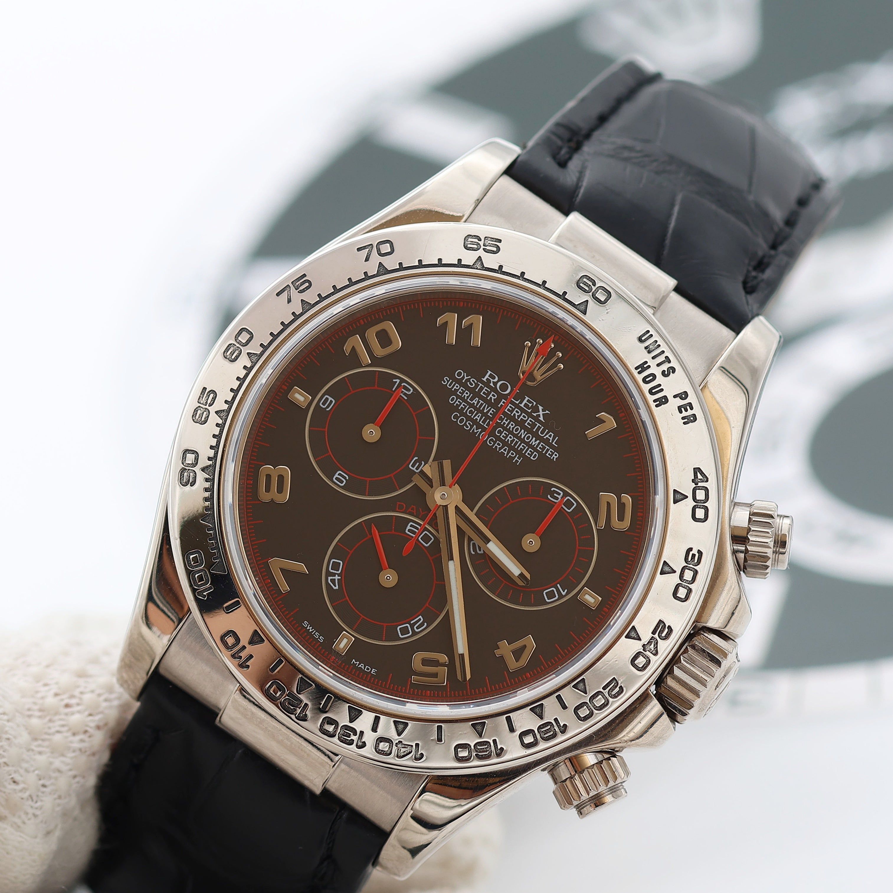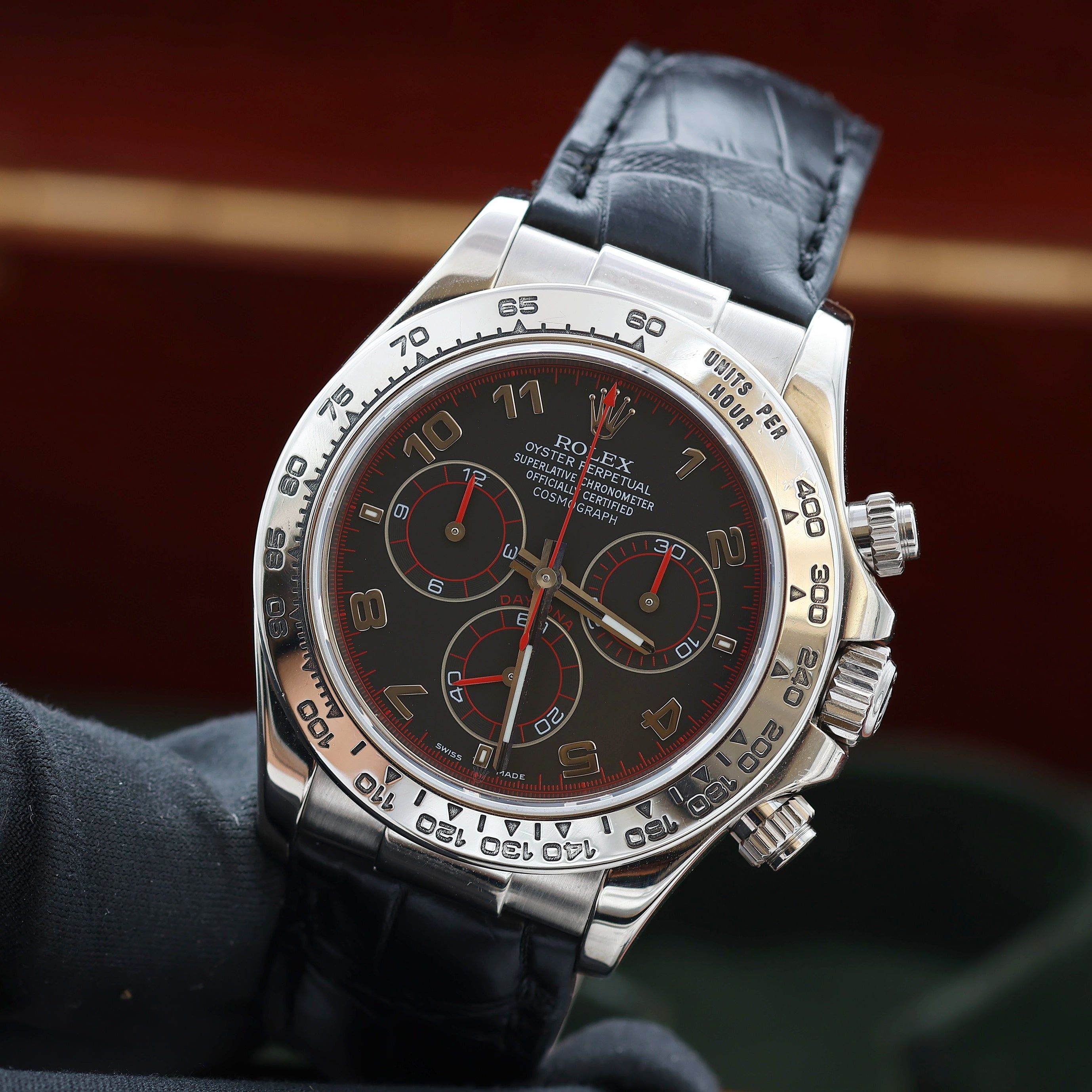 For sale at Debonar Watches: pre-owned Rolex Daytona 116519 full set. This Oyster Perpetual Cosmograph Daytona in 18 ct white gold with Steel and black dial with arabic numbers, featuring a Cerachrom bezel with tachymetric scale. This chronograph was designed to be the ultimate timing tool for endurance racing drivers. More than 50 years after its creation, the Cosmograph Daytona remains in a class of its own among sport chronographs and continues to transcend time.Synonymous with excellence and reliability, this Rolex is designed for everyday wear, and depending on the model, perfectly suited for a wide range of sports and other activities. The Oyster Perpetual Cosmograph Daytona is designed for those with a passion for driving and speed.Story:While the Daytona is now widely loved and worn by everyone from the newbie collector to your boss’s boss, the Rolex Daytona is firstly a racing watch. It was made for motorsport professionals and was named after the famous Daytona Beach in Florida, where numerous land speed records were broken. Introduced in 1963, the reference 6239 Daytona was the first Rolex chronograph with a tachymeter bezel that allowed its wearer to measure the speed of an object. The watch gained traction in the racing world but did not gain widespread acceptance until later, thanks in part to a handsome actor/race car driver named Paul Newman. Over the years, the model has seen various updates and has become one of the most desirable watch models in the world. Note: the box in the photos is for picture use only, it's not included in the purchase.If you are interested in a Rolex box, contact us. BRAND ROLEX MODEL DAYTONA REFERENCE 116519 CASE MATERIAL WHITE GOLD MOVEMENT AUTOMATIC DIMENSION 40 MM DIAL BLACK RACING W/ ARABIC NUMBERS BEZEL WHITE GOLD CRYSTAL SAPPHIRE BRACELET TYPE STRAP BRACELET MATERIAL LEATHER ORIGINAL BOX YES ORIGINAL PAPERS YES YEAR APPROX. THE '00s CONDITION EXCELLENT