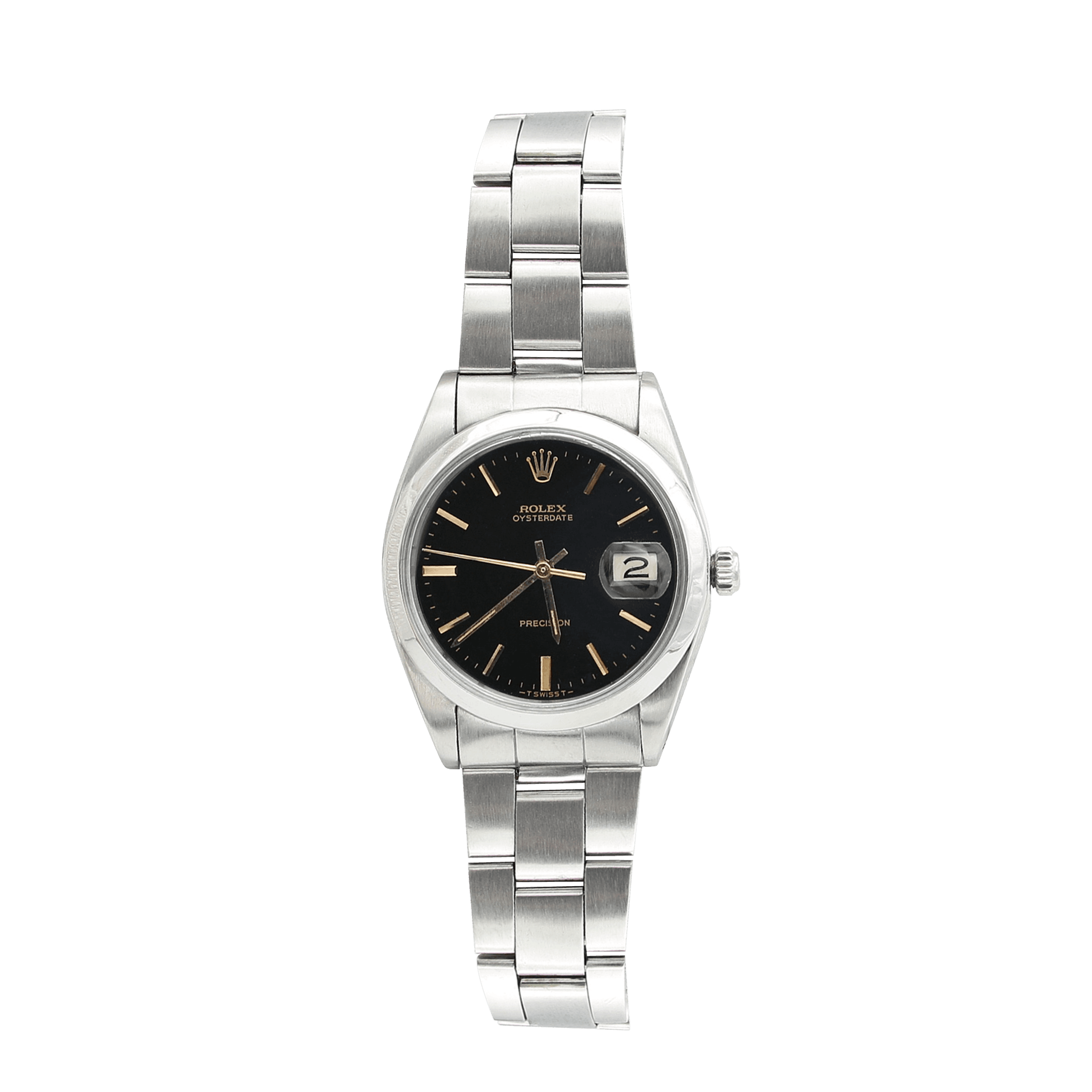 For sale at Debonar Watches: pre-owned Rolex Precision Date ref. 6694 from the '70s, with a sportive black dial and golden indexes. This ROLEX can be an extremely classic fit for both him and her. The Precision model has always represented the ROLEX entry level range, sporting a small case, the usual Oyster case with a thick plexiglass that stands out of the bezel, the instantly recognizable cyclope glass placed at three o'clock and a manual wind calibre. A bit of its story:The Precision reference 6694 began in the early 1960s and ran on with great success until it was discontinued at the end of the 1980s, earning it the distinction of being Rolex’s last manual-wind watch.Throughout that period, the Rolex Oysterdate Precision 6694 was one of the brand’s most popular models, occupying a budget-friendly option that still offered Rolex’s signature date display at 3 o’clock. Easily confused with the Oyster Perpetual and Oyster Perpetual Date, the Oysterdate is actually missing the “Perpetual” label in its name, to point out that it was one of the rare examples from Rolex that was not self-winding. BRAND ROLEX MODEL PRECISION DATE REFERENCE 6694 CASE MATERIAL STEEL MOVEMENT MANUAL WINDING DIMENSION 34 MM DIAL BLACK (GOLDEN INDEXES) BEZEL STEEL CRYSTAL PLEXIGLASS BRACELET TYPE OYSTER FOLDED BRACELET MATERIAL STEEL BRACELET LENGHT 16 CM ORIGINAL BOX NO ORIGINAL PAPERS NO YEAR AROUND '70s CONDITION EXCELLENT
