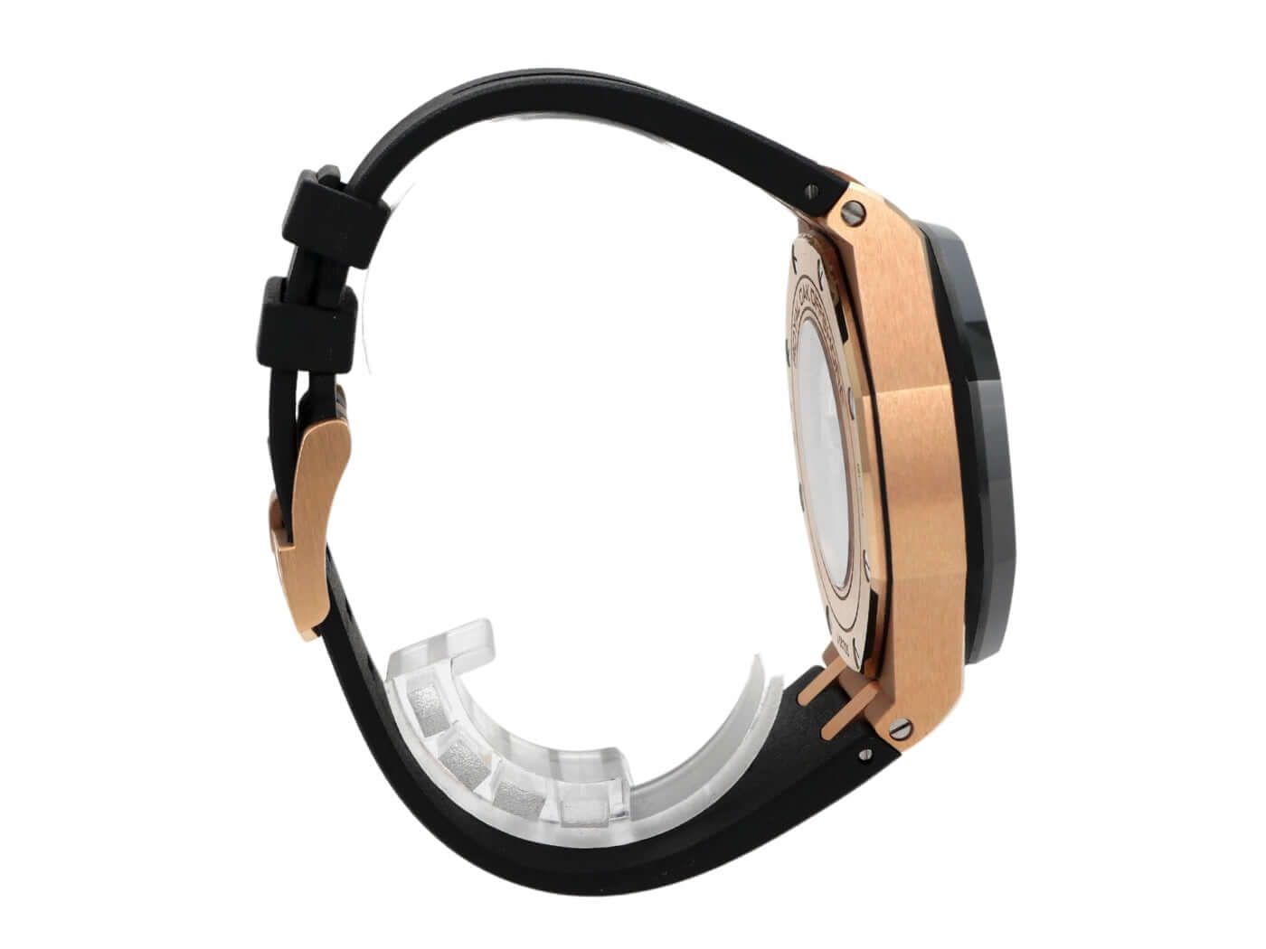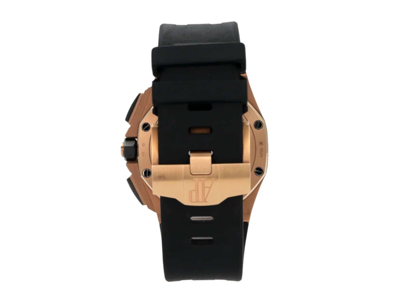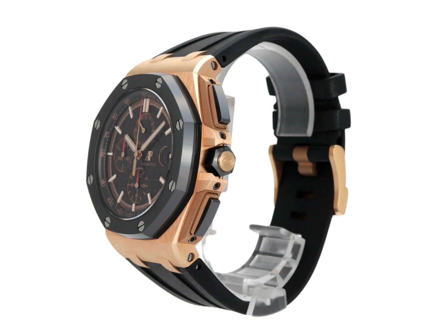Audemars Piguet Royal Oak Offshore 26401RO.OO.A002CA.02 from 2018Case made of polished and satin-finished 18 kt rose gold, case diameter 44 mm, case height 14.4 mm, ceramic bezel screwed in, black rubber strap with pin buckle made of 18 kt rose gold, black dial with luminous indices, automatic movement, manufacture caliber 3126 / 3840 with 59 jewels, frequency 21,600 A/h, power reserve of approximately 50 hours, date display, anti-reflective sapphire crystal, 18 kt rose gold transparent case back screwed in and engraved, water-resistant up to 10 bar.Used watch, very good condition, complete with box and papers, delivery from 2018.