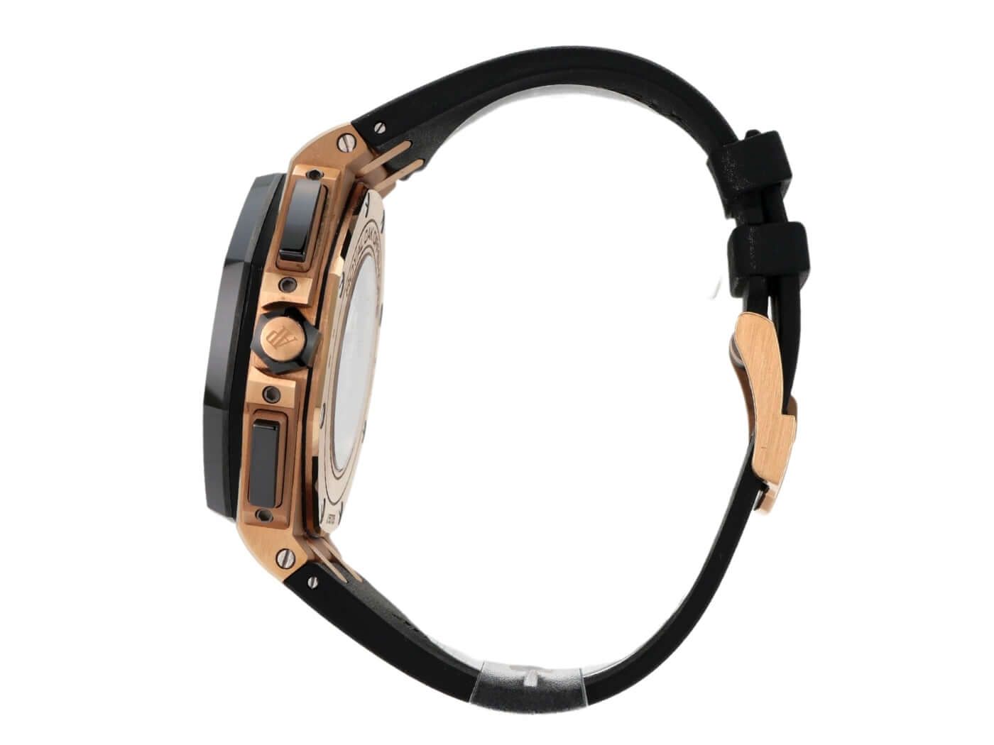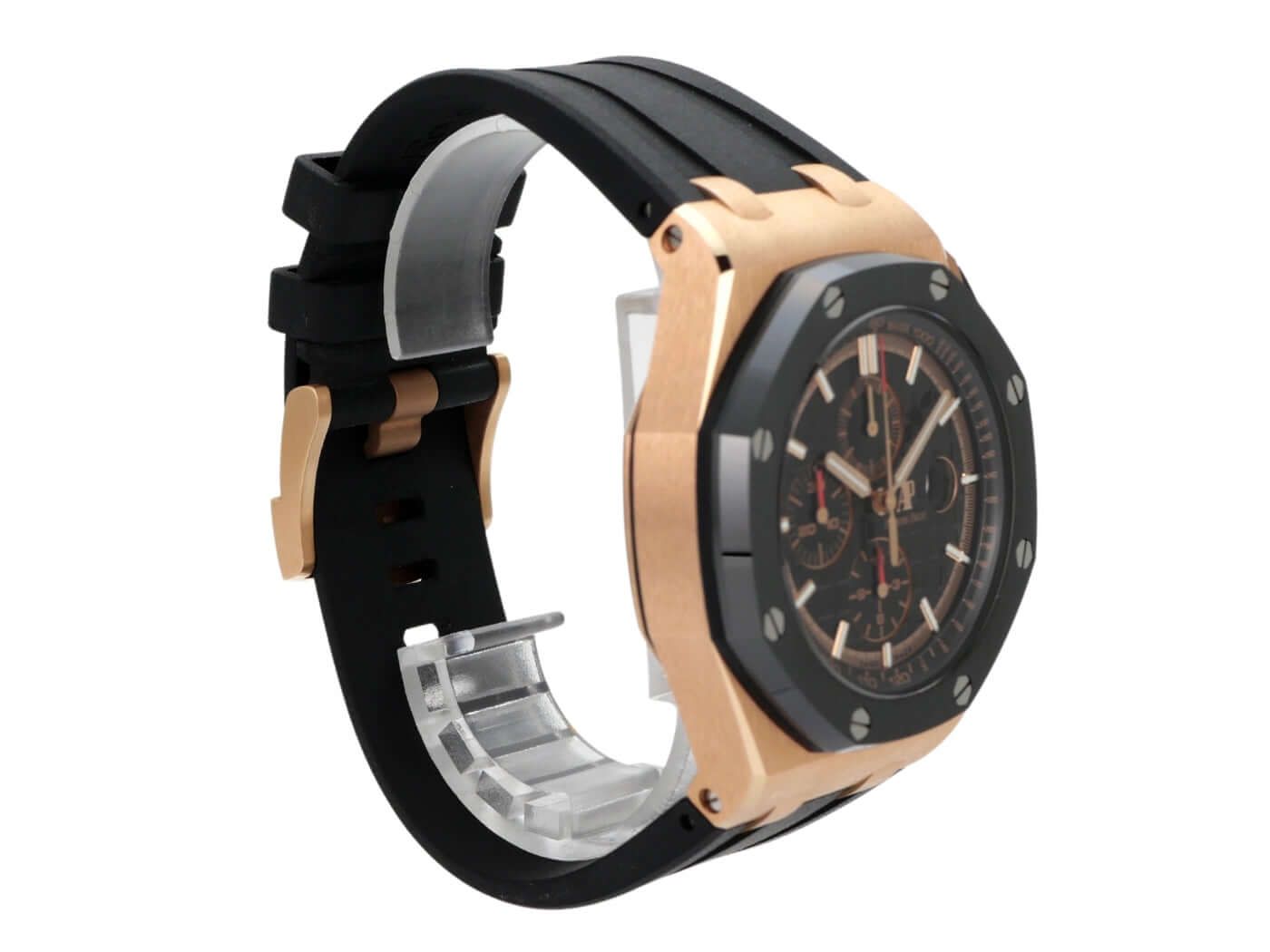 Audemars Piguet Royal Oak Offshore 26401RO.OO.A002CA.02 de 2018Boîtier en or rose 18 kt poli et satiné, diamètre du boîtier 44 mm, hauteur du boîtier 14.4 mm, lunette en céramique vissée, bracelet en caoutchouc noir avec boucle ardillon en or rose 18 kt, cadran noir avec index lumineux, mouvement automatique, calibre de manufacture 3126 / 3840 avec 59 rubis, fréquence 21 600 A/h, réserve de marche d'environ 50 heures, affichage de la date, verre saphir antireflet, fond transparent en or rose 18 kt vissé et gravé, étanche jusqu'à 10 bars.Montre d'occasion, très bon état, complète avec boîte et papiers, livraison de 2018.