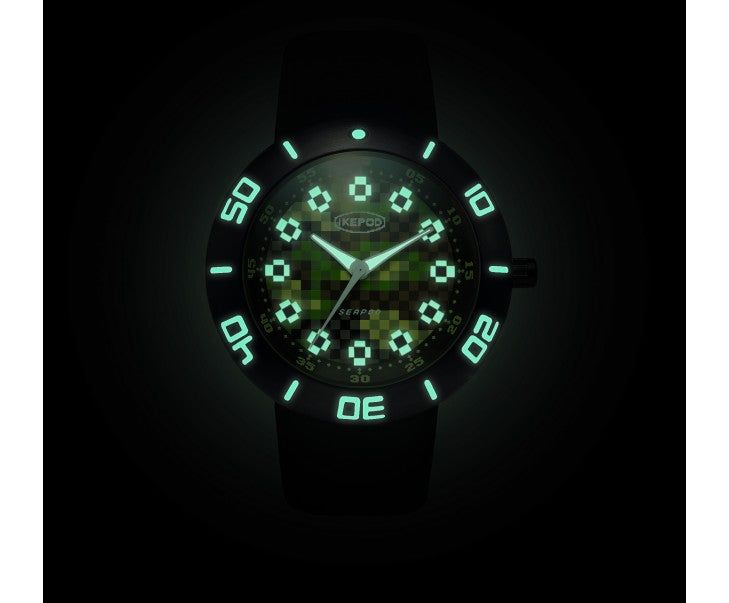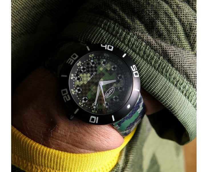 Seapod limited edition of 50 models.Case in black PVD with a camo pixel dial. Comes with 2 straps: black and camo pixel.A tribute to all veterans and gamers. (choose your side, peace out!)200 meters diver, silicone strap, 46mm lugs to lugs feels 43 on the wrist. Screw down crown.Unidirectional rotating bezel 120 click, super luminova on bezel indexes.Miyota 9039 movement,All watches are number the same: 1 OF 50.This is a limited edition version of 50