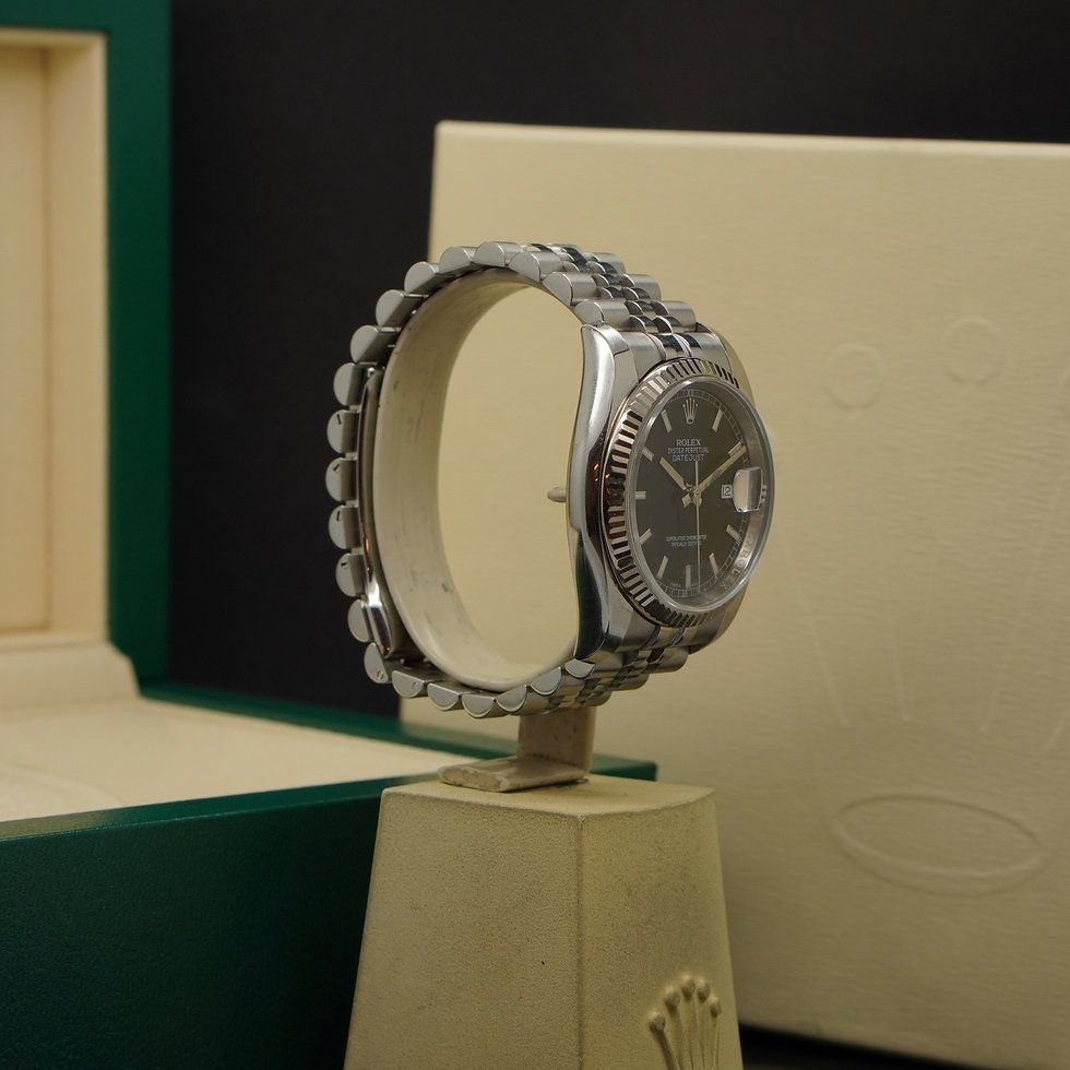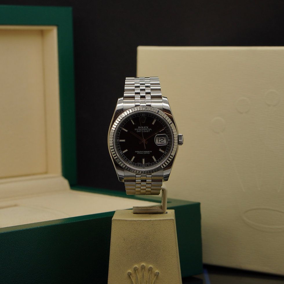 Rolex Datejust 36 | Ref. 116234 | from 2012 | with Rolex box. DATA OF THE WATCH: Internal ID: 146 Manufacturer: Rolex Model: Oyster Perpetual Datejust Reference: 116233 Caliber of the movement: 3135 - 31 Jewels Scope of delivery: box Diameter of the case: 36mm Width of the bracelet: 20mm Bracelet: solid Rolex Jubilee bracelet Material of the watch: stainless steel Winding: automatic movement Dial: black Lugs: solid Glass: sapphire crystal Warranty: 12 months CONDITION OF THE WATCH AND WORK PERFORMED * The watch is in very good condition * The watch has been checked for authenticity * The movement has been checked for accuracy GENERAL INFORMATION: *FREE EXPRESS SHIPPING WITHIN EUROPE* Images: The images shown are not stock images! We photograph each watch model as accurately as possible. Since stains and shadows sometimes cannot be avoided, please call us or write us a message if a picture is not entirely clear to you. Warranty: void if the watch is opened by another watchmaker Water resistance: no permanent property; Annual inspection recommended The goods offered are subject to differential taxation according to §25a. Errors and typographical errors excepted.