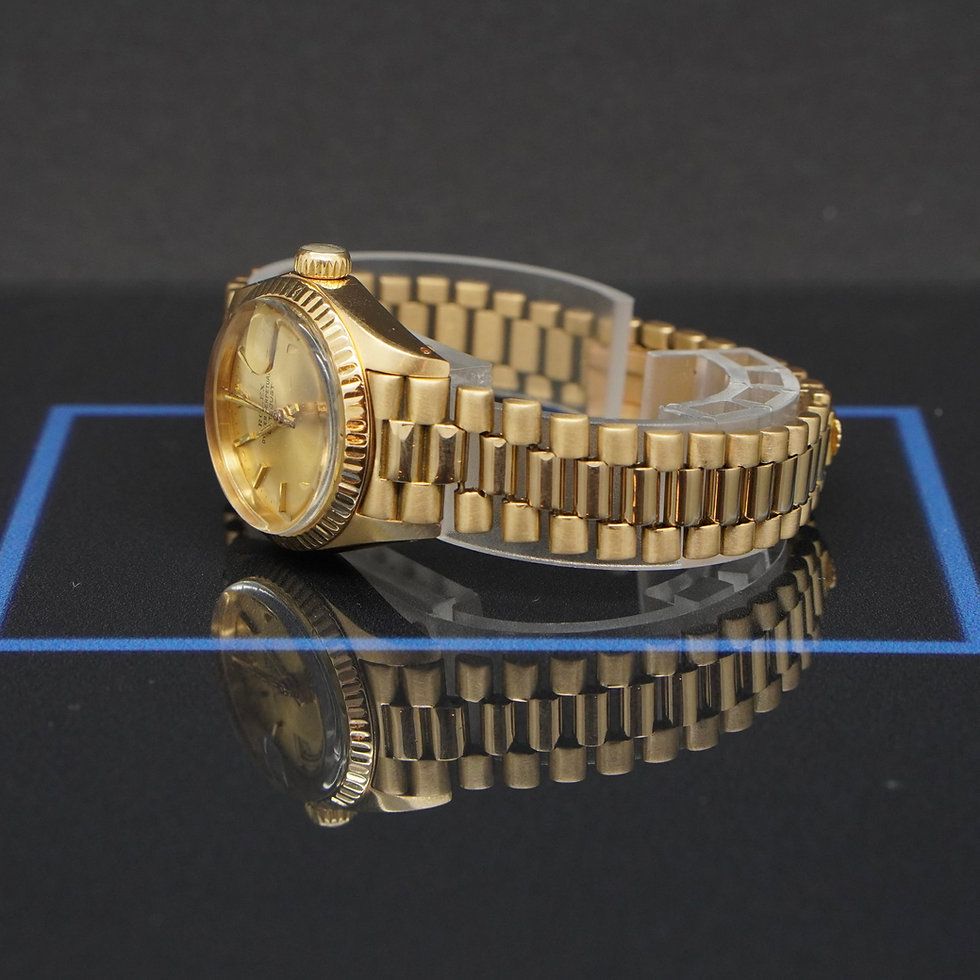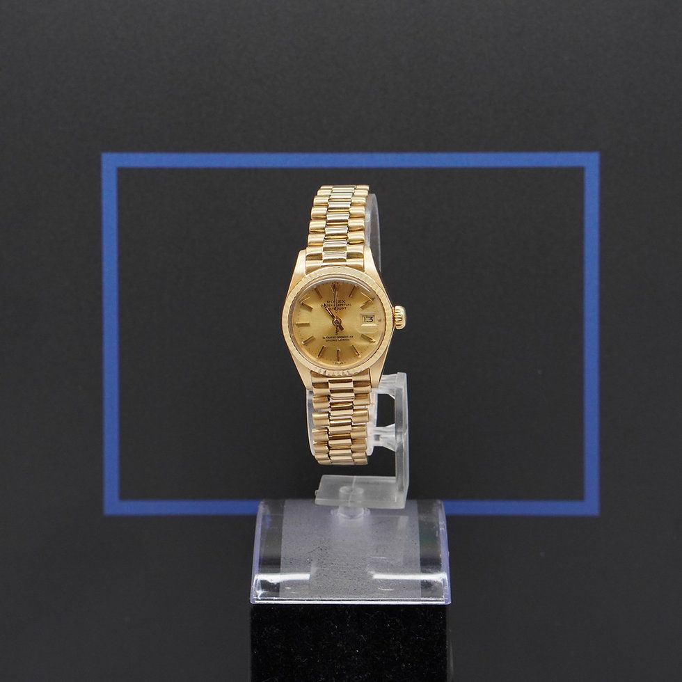 Rolex Lady-Datejust Ref. 6917 | Gold | 1973 | LC EU Box&Papers. DATA OF THE WATCH: Internal ID: 176 Manufacturer: Rolex Model: Oyster Perpetual Lady Datejust Reference: 6917 Warranty: 24 months Caliber of the movement: 2135 - 28 Jewels Scope of delivery: LC EU Rolex Box & Papers Diameter of the case: 26mm Lug width of the bracelet: 13mm Bracelet: solid Rolex Presidential bracelet Material of the watch: yellow gold Winding: automatic movement Dial: gold lugs: solid Glass: Sapphire crystal Last service: 03/2025 Year of manufacture: CONDITION OF THE WATCH AND WORK PERFORMED * The watch is in very good condition * Watch has been checked for authenticity * Movement has been checked for accuracy GENERAL INFORMATION: *FREE EXPRESS SHIPPING WITHIN EUROPE* Images: The images shown are not archive images! We photograph each watch model as accurately as possible. Since stains and shadows sometimes cannot be avoided, please call us or write us a message if a picture is not entirely clear to you. Warranty: void if the watch is opened by another watchmaker Water resistance: no permanent property; Annual inspection recommended The goods offered are subject to differential taxation according to §25a