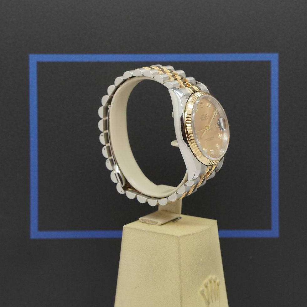 Rolex Datejust 36 S/G Dia - Ref: 116233 - from 2008 - box & card. DATA OF THE WATCH: Internal ID: 179 Manufacturer: Rolex Model: Oyster Perpetual Datejust Reference: 116233 Caliber of the movement: 3135 - 31 Jewels Scope of delivery: Rolex box & card Diameter of the case: 36mm Width of the bracelet: 20mm Bracelet: solid Rolex Jubilee bracelet Material of the watch: stainless steel/yellow gold Winding: automatic movement Dial: gold with diamonds Band lugs: solid Glass: Sapphire crystal CONDITION OF THE WATCH AND WORK PERFORMED * The watch is in very good condition * The watch has been checked for authenticity * The movement has been checked for accuracy GENERAL INFORMATION: *FREE EXPRESS SHIPPING WITHIN EUROPE* Images: The images shown are not stock images! We photograph each watch model as accurately as possible. Since stains and shadows sometimes cannot be avoided, please call us or write us a message if a picture is not entirely clear to you. Warranty: void if the watch is opened by another watchmaker Water resistance: no permanent property; Annual inspection recommended The goods offered are subject to differential taxation according to §25a. Errors and typographical errors excepted.