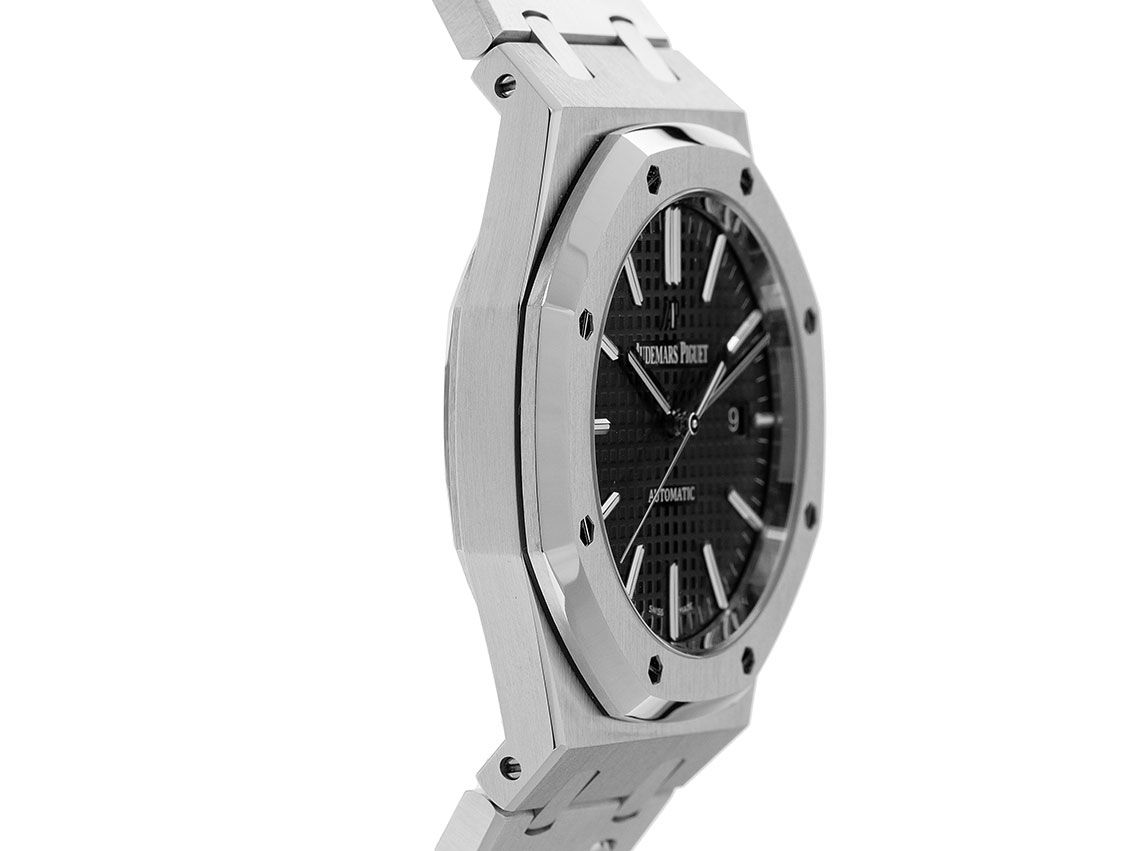 Gehäuse Edelstahl poliert und satiniert, Gehäusedurchmesser ohne Krone 41mm, Gehäusehöhe 10mm. Lünette Edelstahl poliert and satiniert, 8-eckig mit 8 Weißgoldschrauben verschraubt. Brassard Edelstahl poli et satiné, bande verschraubte, verteckte Doppelsicherheitsfaltschließe Edelstahl mit Hersteller-Logo. Zifferblatt schwarz mit Waffelmuster, aufgesetzten Indexen sowie Edelstahl Zeigern. Mécanisme d'horlogerie automatique, Audemars Piguet Kaliber 3120 avec 40 aiguilles. Affichage de l'heure, de la minute et de la seconde par un aiguilleur du milieu avec arrêt de la seconde pour l'affichage de l'heure, affichage de la date et de l'heure à 3 heures. Saphirglas kratzfest. La pierre verschraubbar avec le logo de l'entreprise. Le corps en acier inoxydable de 8 pouces est décoré et gravé avec un filtre en verre acrylique. Le poids du corps, y compris le brassard, est de 168 g. La longueur du brassard, y compris la gaine, est de 180 mm. Numéro de référence : 15400ST, Gehäusenummer : K44XXX, ID : KK760001222HPP-62000, Artikelnummer: 10000067546. Original Audemars Piguet Box mit Umkarton und Garantie Papiere von 2018 sowie Beschreibung, Full Set. Kapitalanlage mit Wertsteigerungspotential, aus erster Hand, fast nicht getragen. Wie Neu. Lieferzeit sofort.