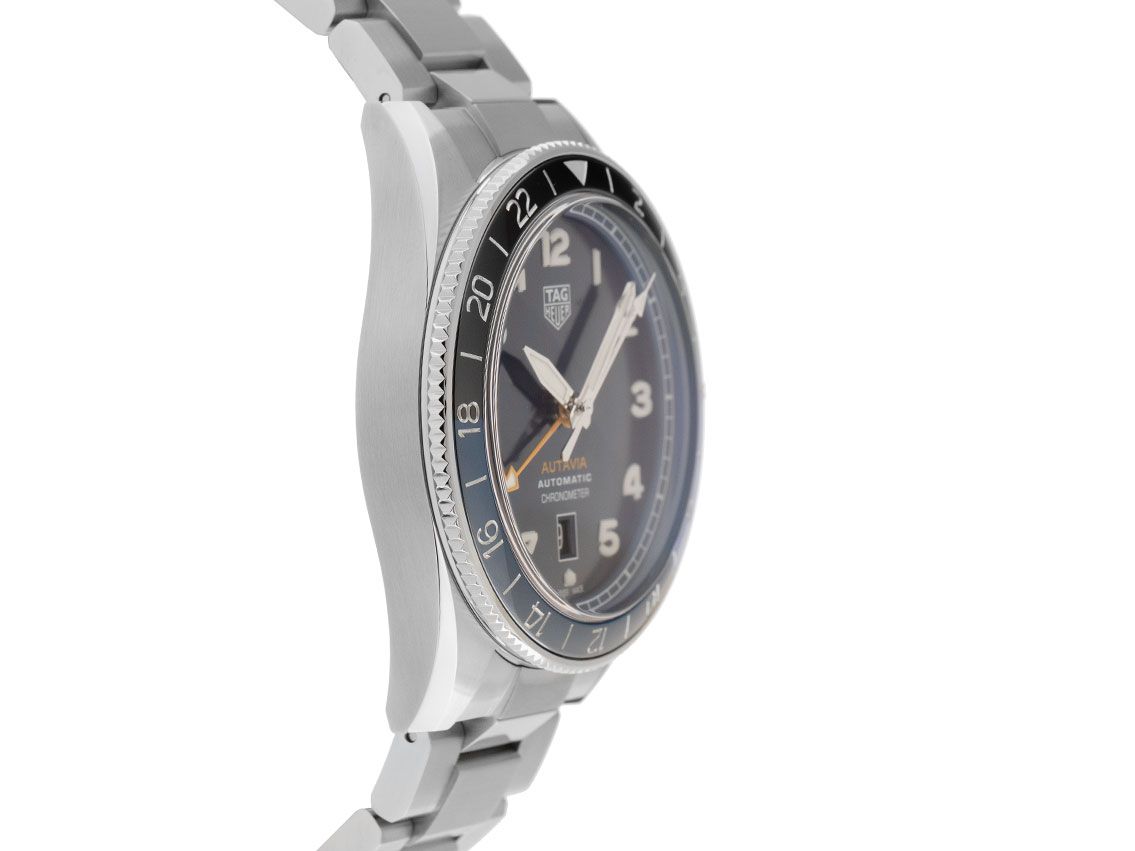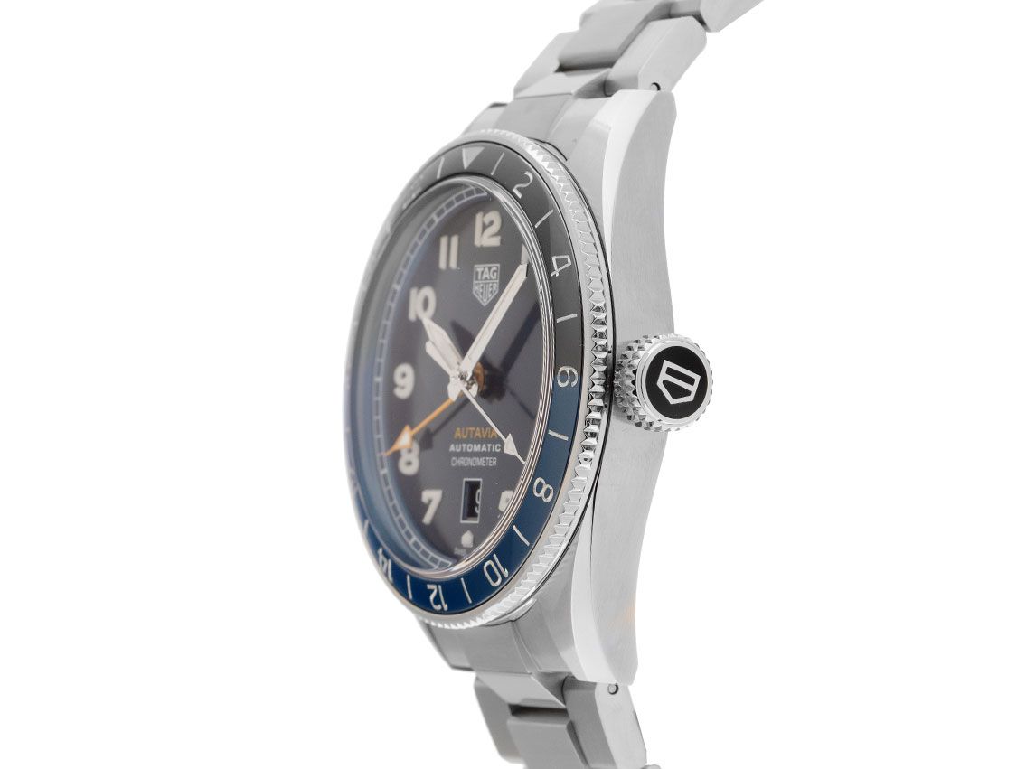 Tag Heuer Autavia GMT COSC Stahl Automatik Armband StahlGehäuse Edelstahl poliert und satiniert, Gehäusedurchmesser ohne Krone 42mm, Gehäusehöhe 13,3mm. Lünette Edelstahl geriffelt mit schwarz / blauem Inlay und 24-Stunden-Skala, beidseitig drehbar. Armband Edelstahl poliert und satiniert, Sicherheitsfaltschließe Edelstahl mit Hersteller-Logo. Zifferblatt blau mit weißen arabischen Ziffern und polierten Edelstahl Leuchtzeigern. Uhrwerk Automatik, Chronograph, Kaliber Tag Heuer Calibre 7 COSC GMT. Anzeige von Stunde, Minute und Sekunde über Zeiger aus der Mitte mit Sekundenstopp zur sekundengenauen Einstellung der Uhrzeit, Datumsanzeige mit Schnellverstellung bei 6 Uhr, zweite Zeitzone (GMT) ablesbar über orangenen Zeiger aus der Mitte. Saphirglas kratzfest und gewölbt. Krone Edelstahl mit Hersteller-Logo. Boden Edelstahl verschraubt und graviert. Gewicht der Uhr inklusive Armband 180g, Länge des Armbandes inklusive Gehäuse 200mm. Wasserdicht bis 10 ATM. Referenznummer: WBE511A.BA0650, ID: ST116059881223H-5050, Artikelnummer: 10000072656. Original Tag Heuer Box mit Umkarton und Garantie Papiere sowie Beschreibung, Full Set. Ungetragen. Lieferzeit sofort.