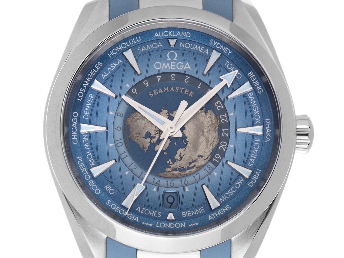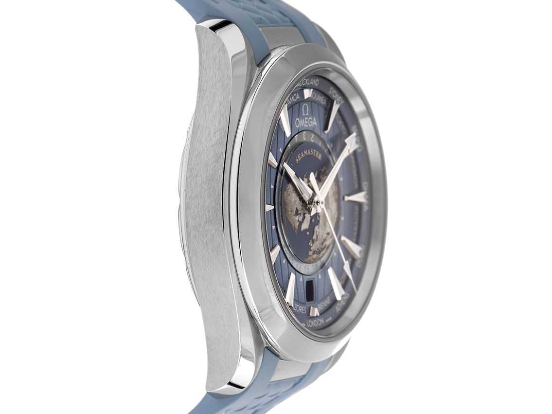 Gehäuse Edelstahl poliert und satiniert, Gehäusedurchmesser ohne Krone 43mm, Gehäusehöhe 14,1mm. Lünette Edelstahl glatt und poliert. Brassard Kautschuk hellblau mit Ziernaht, Anstoßbreite 21mm, Sicherheitsfaltschließe Edelstahl mit Hersteller-Logo. La feuille d'affichage bleue avec la carte de l'univers en laser, les index et les indicateurs d'Edelstahl Leuchtzeigern. Fonctionnement automatique, Master Chronometer avec Zeugnis, Omega Manufakturkaliber 8938 mit 38 Edelsteinen, Co-Axial Hemmung, Gangreserve ca. 60 Stunden. Affichage de l'heure, de la minute et de la semaine à l'aide d'un aiguilleur au centre, avec arrêt de l'heure pour l'affichage de l'heure, affichage des dates avec affichage de l'heure à 6 heures, affichage de l'heure mondiale sur l'anneau supérieur, affichage des 24 heures avec affichage de l'heure et de la nuit au centre. Saphirglas kratzfest, gewölbt und doppelseitig entspiegelt. Krone verschraubbar mit Hersteller-Logo. Corps en Edelstahl verschraubt et gravier. Poids de l'appareil, y compris le brassard, 127 g. Eau jusqu'à 15 ATM. Numéro de référence : 220.12.43.22.03.002, ID : ST1160153240624H-10800, Artikelnummer: 10000075064. Original Omega Box mit Umkarton und Garantie Papiere von 06/2024 sowie Beschreibung, Full Set. Ungetragen. Livraison immédiate.