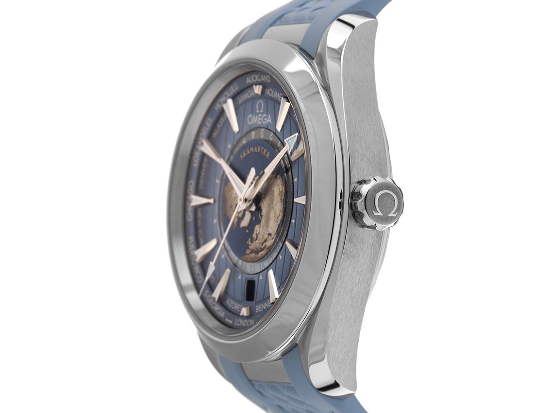 Omega Seamaster Aqua Terra 150m GMT Woldtimer Stahl Automatik Armband Kautschuk FaltschließeGehäuse Edelstahl poliert und satiniert, Gehäusedurchmesser ohne Krone 43mm, Gehäusehöhe 14,1mm. Lünette Edelstahl glatt und poliert. Armband Kautschuk hellblau mit Ziernaht, Anstoßbreite 21mm, Sicherheitsfaltschließe Edelstahl mit Hersteller-Logo. Zifferblatt blau mit lasergravierter Weltkarte, aufgesetzten Edelstahl Leuchtindexen und Edelstahl Leuchtzeigern. Uhrwerk Automatik, Master Chronometer mit Zeugnis, Omega Manufakturkaliber 8938 mit 38 Edelsteinen, Co-Axial Hemmung, Gangreserve ca. 60 Stunden. Anzeige von Stunde, Minute und Sekunde über Zeiger aus der Mitte mit Sekundenstopp zur sekundengenauen Einstellung der Uhrzeit, Datumsanzeige mit Schnellverstellung bei 6 Uhr, Weltzeit Städte am äußeren Ring, 24-Stunden Anzeige mit Tag- und Nachtanzeige in der Mitte. Saphirglas kratzfest, gewölbt und doppelseitig entspiegelt. Krone verschraubbar mit Hersteller-Logo. Boden Edelstahl verschraubt und graviert. Gewicht der Uhr inklusive Armband 127g. Wasserdicht bis 15 ATM. Referenznummer: 220.12.43.22.03.002, ID: ST1160153240624H-10800, Artikelnummer: 10000075064. Original Omega Box mit Umkarton und Garantie Papiere von 06/2024 sowie Beschreibung, Full Set. Ungetragen. Lieferzeit sofort.