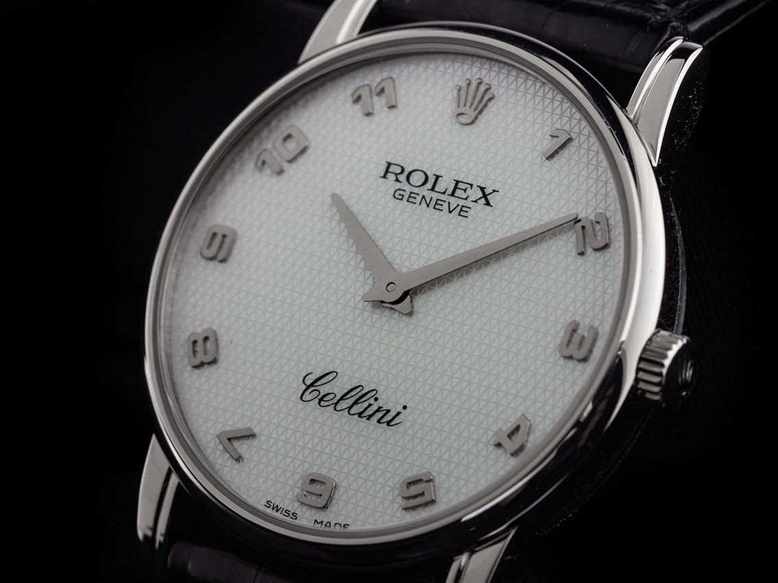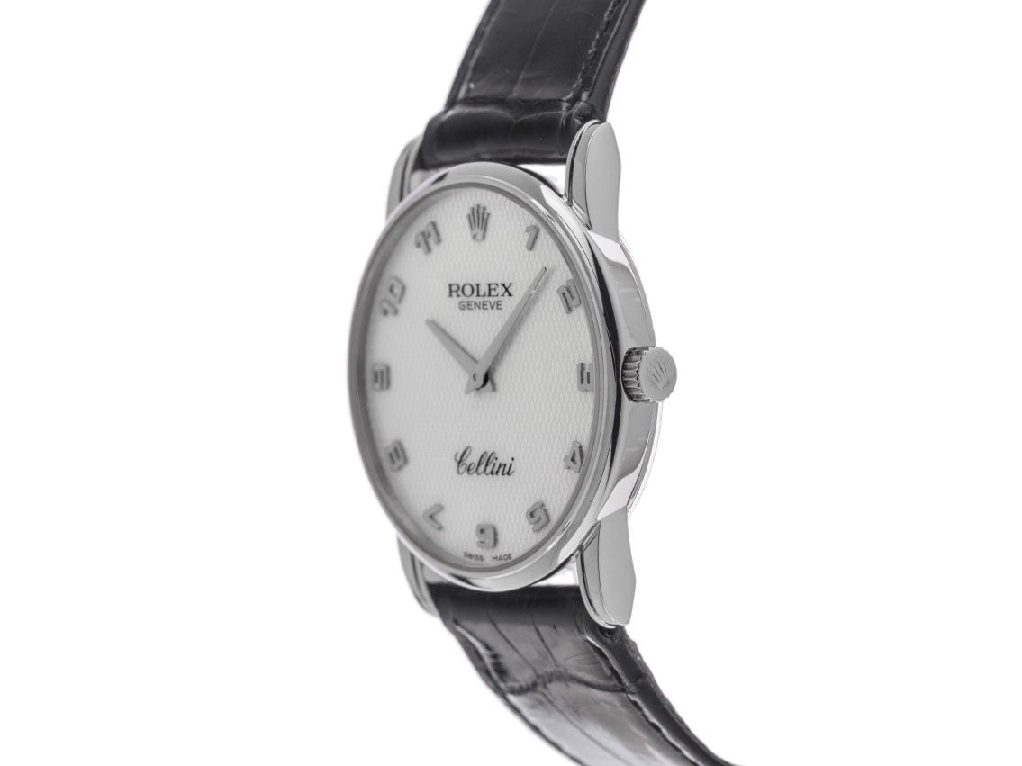 Rolex Cellini 18kt Weißgold Perlmutt Handaufzug Armband KrokolederGehäuse 18kt Weißgold poliert und satiniert, Gehäusemaße ohne Krone 32mm, Gehäusehöhe 5,6mm. Rolex Armband Krokoleder schwarz mit Ziernaht, Anstoßbreite 18mm, Rolex Stiftschließe 18kt Weißgold mit Hersteller-Logo. Zifferblatt Perlmutt hell mit aufgesetzten weißgoldenen arabischen Ziffern und weißgoldenen Zeigern. Uhrwerk Handaufzug, Rolex Manufakturkaliber 1602 mit 20 Edelsteinen. Anzeige von Stunde und Minute über Zeiger aus der Mitte. Saphirglas kratzfest. Krone geriffelt mit Hersteller-Logo. Boden 18kt Weißgold. Gewicht der Uhr inklusive Armband 42g. Referenznummer: 5116, Gehäusenummer: K662XXX, Baujahr: 2001, ID: P073564000325H-7600, Artikelnummer: 10000079416. Mit Gangkontrolle und kompletter äußerlicher Aufarbeitung von März 2025. Original Rolex Box und Beschreibung, Ledermäppchen, Übersetzungsheft, Rolex Chronometer-Siegel und Watchregister Auszug von März 2025, The Watch Register Zertifikat / ohne Eintrag (Internationale Datenbank für verlorene oder gestohlene Uhren). Superschnäppchen, Kapitalanlage mit Wertsteigerungspotential, extrem seltenes Sammlerstück. Sehr guter Zustand. Lieferzeit sofort.