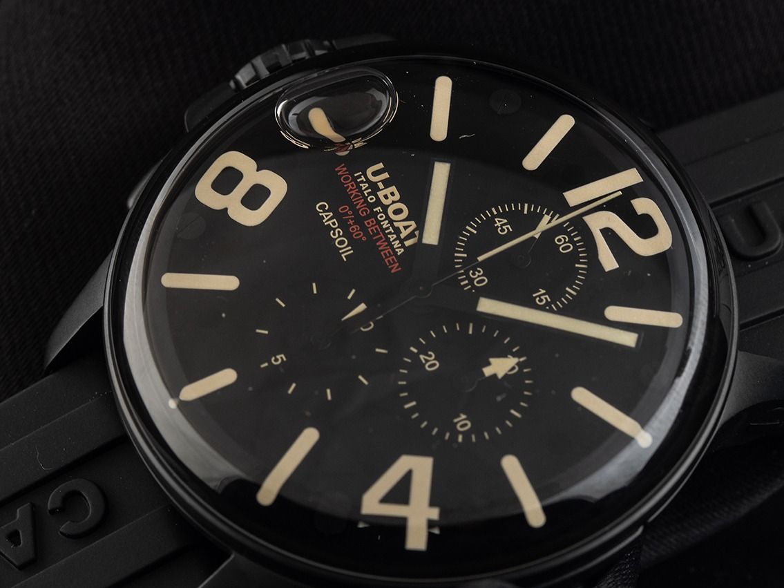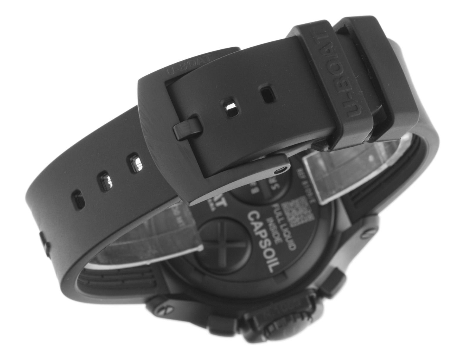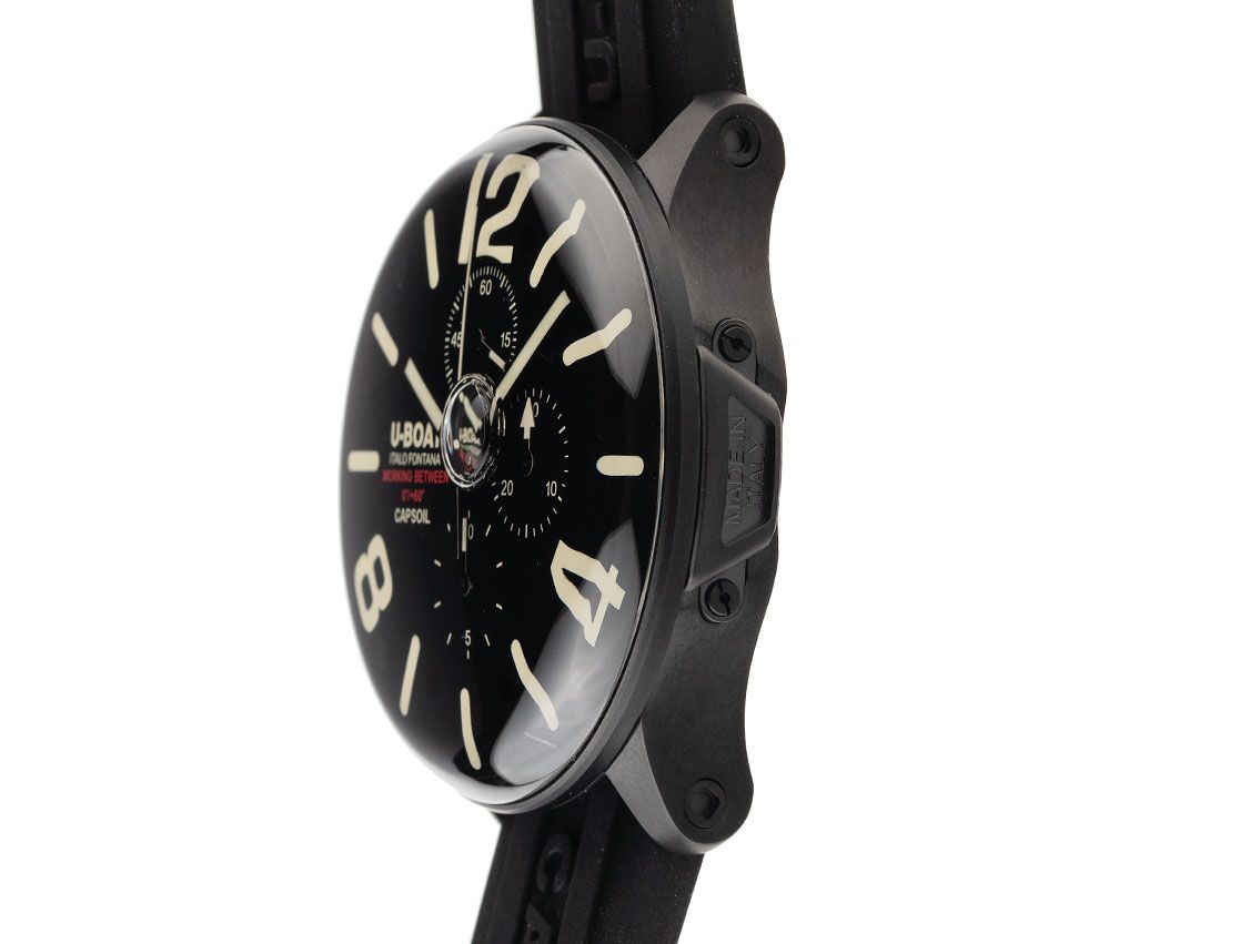 U-Boat Capsoil Stahl DLC elektromechanisch Chronograph Armband KautschukGehäuse Edelstahl schwarz DLC beschichtet satiniert. Gehäusedurchmesser ohne Krone 45mm, Gehäusehöhe 17,0mm. U-Boat Armband Kautschuk schwarz, Anstoßbreite 22mm, Stiftschließe Edelstahl schwarz DLC beschichtet mit Hersteller-Logo. Zifferblatt schwarz mit arabischen Leuchtziffern und Leuchtindexen sowie Leuchtzeigern. Uhr ist mit einem speziellen Öl gefüllt sowie einer Luftblase zum Ausgleich der Temperaturschwankungen. Uhrwerk elektromechanisch, Chronograph, Kaliber U-Boat im Ölbad, arbeitet zwischen 0° und +60°C. Anzeige von Stunde und Minute über Zeiger aus der Mitte. Saphirglas kratzfest, gewölbt. Krone links bei 9 Uhr. Boden Edelstahl schwarz DLC beschichtet verschraubt und graviert. Gewicht der Uhr inklusive Armband 128g. Wasserdicht 10 ATM. Referenznummer: 8109/E, ID: ST115425220425RE-2450, Artikelnummer: 10000079694. Original U-Boat Box und Garantie Papiere, Full Set. Neu. Lieferzeit sofort.