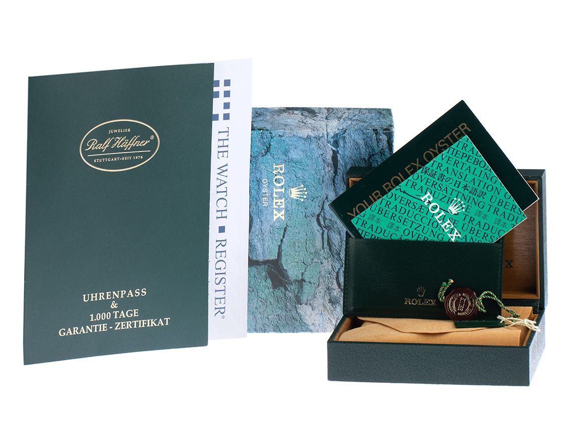 Inklusive certified pre owned Zertifikat / Uhrenpass mit einem Farbbild, der genauen Beschreibung sowie dem Wiederbeschaffungswert der Uhr über 7200,-€ und 1000 Tage Garantie ab Kaufdatum.
