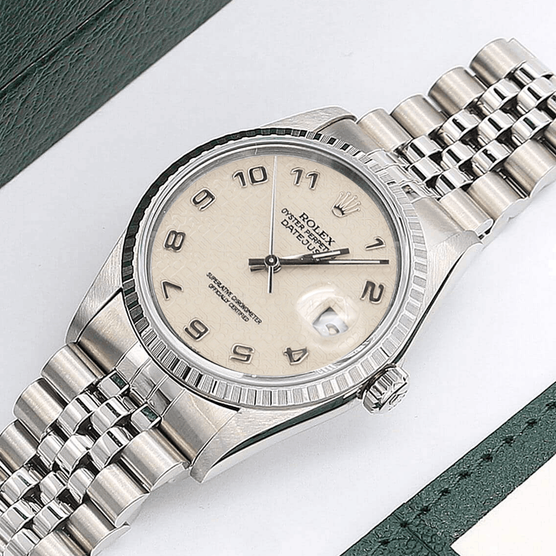 For sale at Debonar Watches: pre-owned Rolex Datejust 16220 on a classic Jubilee bracelet, full set. This Rolex Datejust 16220 presents a peculiar white millennary dial.With its unorthodox engine-turned bezel, the ref. 16220 represented the top of the line of the all steel Datejusts. A bit of its story: Rolex’s ref. 162XX series of Datejust watches first emerged in 1988, a replacement for the relatively short-lived ref. 160XX range. The ref. 16220 was introduced the following year in 1989: this Datejust represents that fine line between all-out dress piece and something robust and versatile enough to be worn everyday. BRAND ROLEX MODEL DATEJUST REFERENCE 16220 CASE MATERIAL STEEL MOVEMENT AUTOMATIC DIMENSION 36 MM DIAL MILLENNARY BEZEL STEEL (Fluted) CRYSTAL SAPPHIRE BRACELET TYPE JUBILEE BRACELET MATERIAL BRACELET BRACELET LENGHT 17 CM ORIGINAL BOX YES ORIGINAL PAPERS YES YEAR APPROX. '90s CONDITION EXCELLENT