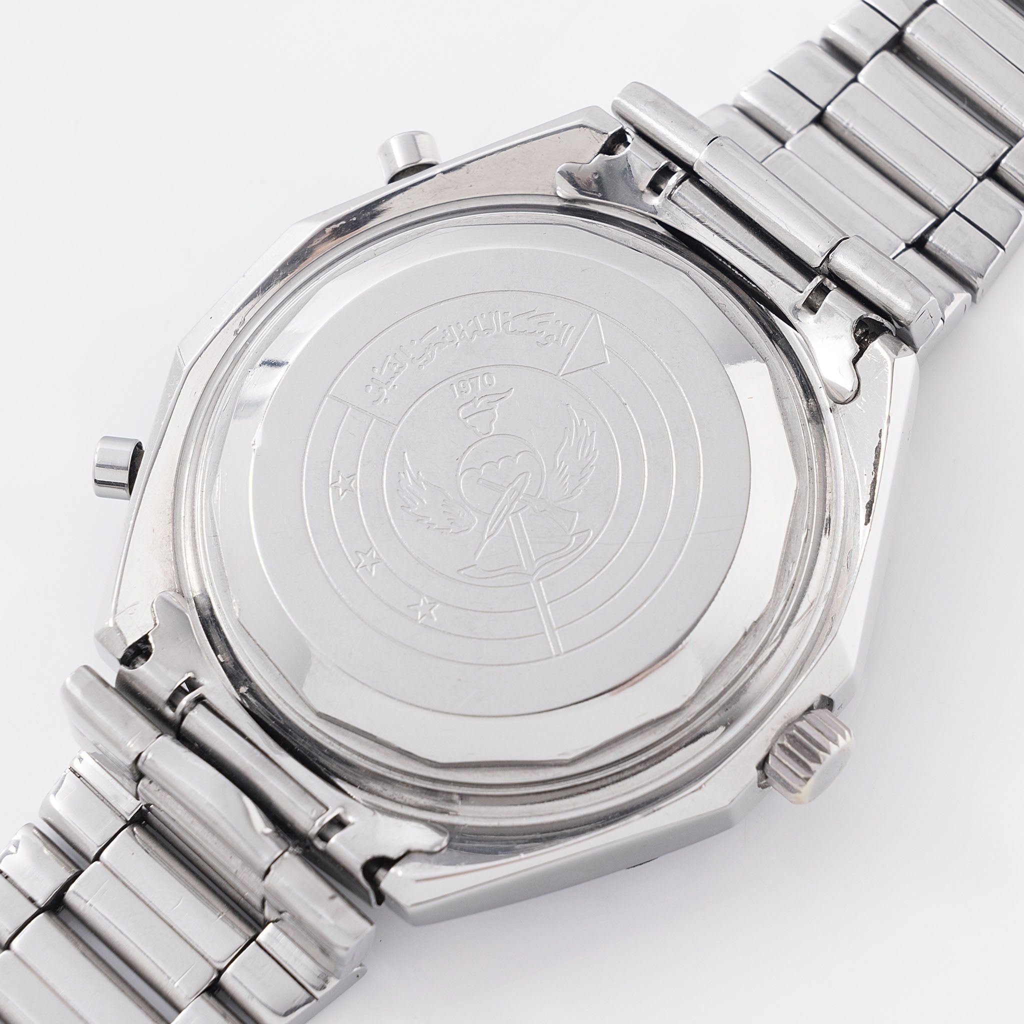 Breitling SA was established in 1884 by Léon Breitling in Saint-Imier. After his death in 1914, the company was passed down to his son, Gaston, and later to his grandson, Willy, in 1935. In the 1940s, Breitling introduced a circular slide rule on the bezel of its Chronomat models—a feature that later became iconic with the launch of the Navitimer in 1954. By 1966, chronographs were in high demand—and so were automatic watches—but no one had yet solved the puzzle of combining the two. To tackle what was then the ultimate watchmaking challenge, Breitling joined forces with some unexpected partners. Rivals Breitling and Heuer-Leonidas brought their expertise in chronographs; Hamilton-Buren contributed their mastery of micro-rotors; and Dubois-Depraz added its know-how in developing intricate modular movements. Working in strict secrecy, the group launched what became known as “Project 99,” entering the competitive race to create the world’s first automatic chronograph. Thanks to their complementary strengths, the collaboration paid off. On March 3, 1969, they unveiled the Caliber 11 automatic chronograph movement during simultaneous press events in Geneva and New York. And here we have a bold Caliber 11 Navitimer in hand! Besides the consumer market, this watch has been supplied to the armed forces all over the world and is sometimes referred to as “Pizza,” or even more often nicknamed as “fried egg.” This particular Navitimer is a big one—measuring 48mm—with the telltale crown on the left side of the case, typical for Cal. 11-powered chronographs. It’s a technical-looking timepiece with multiple scales, two subdials, and a date window at six o’clock. The dial bears the wings of the Iraqi Air Force, rather than the usual Breitling logo. On the screw-down case back, Arabic script translates to: “Iraqi General Youth Training Association”—a program tied to military training in Iraq. This oversized Breitling comes on a steel three-row flat link Breitling bracelet and has been fully serviced by our watchmaker. Big, Bold, Breitling—touch base with us for this triple threat! Specifications: - Breitling Navitimer Automatic Chronograph reference 1806- Dates to 1970s- 48mm steel case, with “Iraqi General Youth Training Association” engraving in Arabic language- Reverse panda dial with Iraqi Air Force wings- Caliber 11 automatic movement- Comes on a 3-row flat link Breitling steel bracelet- Fully serviced by our watchmaker- 1-year mechanical warranty- Free worldwide FedEx Priority shipping