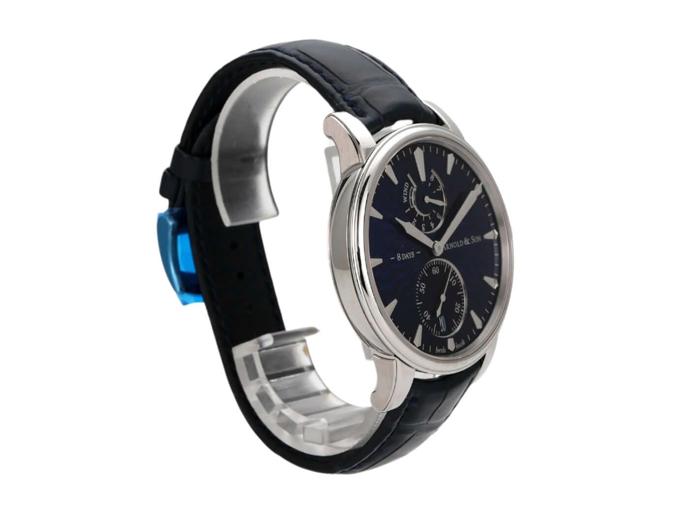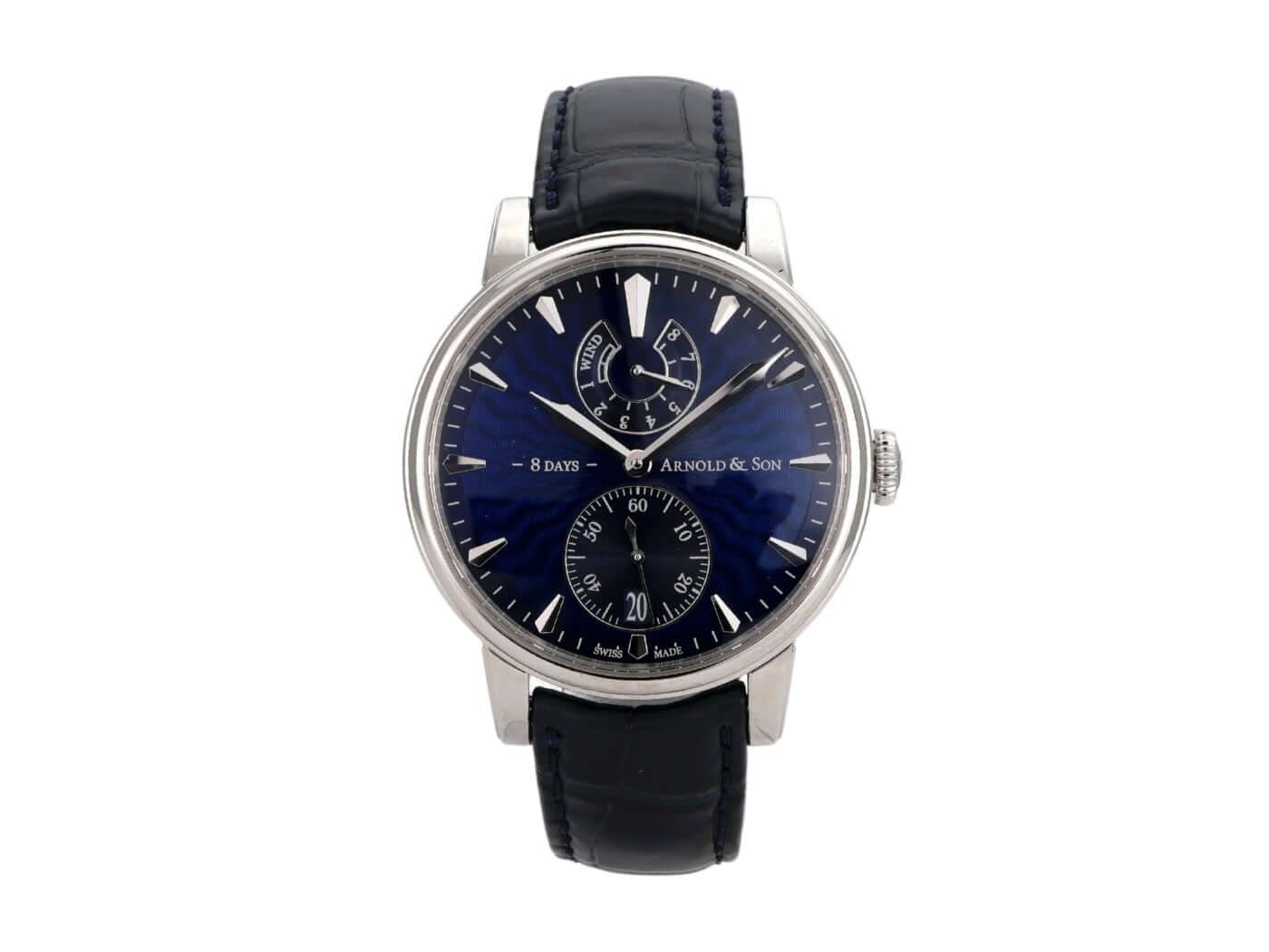 Arnold & Son Eight-Day Royal Navy Blue 1EDAS.U01APolished stainless steel case, case diameter 43 mm, polished stainless steel bezel, blue leather strap with pin buckle, blue dial, manual winding movement, caliber AS1016, power reserve approx. 192 hours, date, moon phase, small seconds, sapphire crystal, stainless steel back with sapphire crystal, water resistant up to 3 bar.Unworn watch, complete with box and papers, delivered in 2018, on customer order.