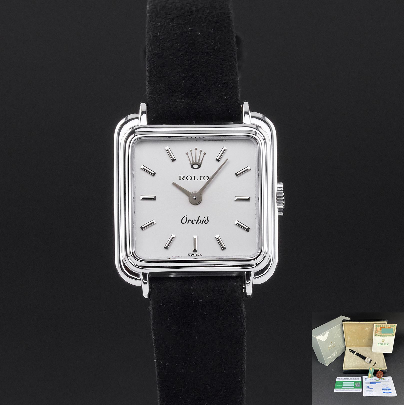 Rolex Orchid 2682 – Delicate Heritage This particular Rolex Orchid introduced in 1976, is a graceful expression of vintage femininity. With it's petite case and minimalist silver dial, it embodies understated charm and refined elegance. Designed in an era when elegance was measured in subtlety, this timepiece stands out for its delicate proportions and timeless simplicity.Created for those who appreciate quiet beauty, historical character, and the rare artistry of Rolex’s more intimate creations.This Rolex Orchid 2682 features a Silver dial and is crafted from 18K white gold, with a production year of 1976.Case No: 433XXXX