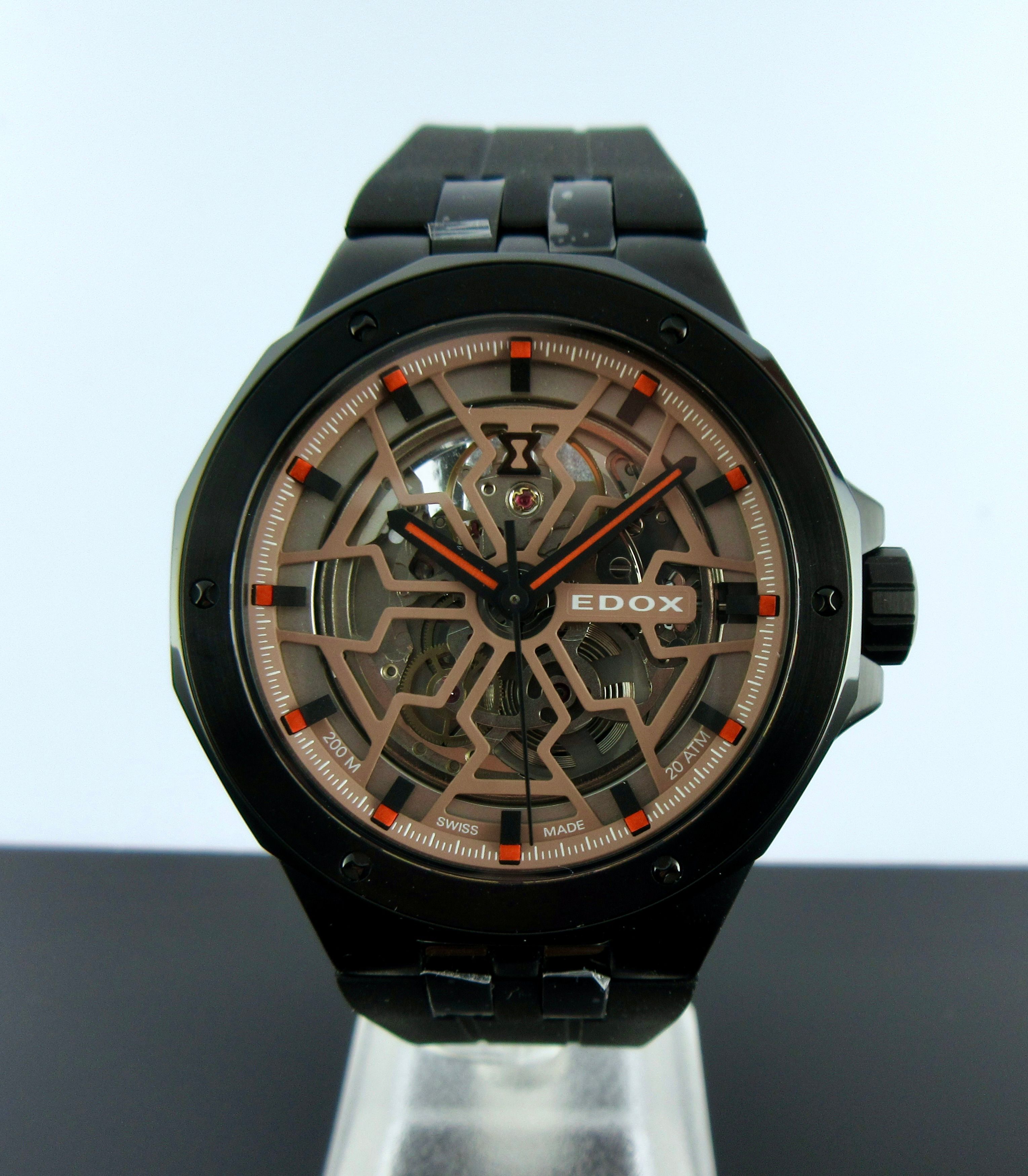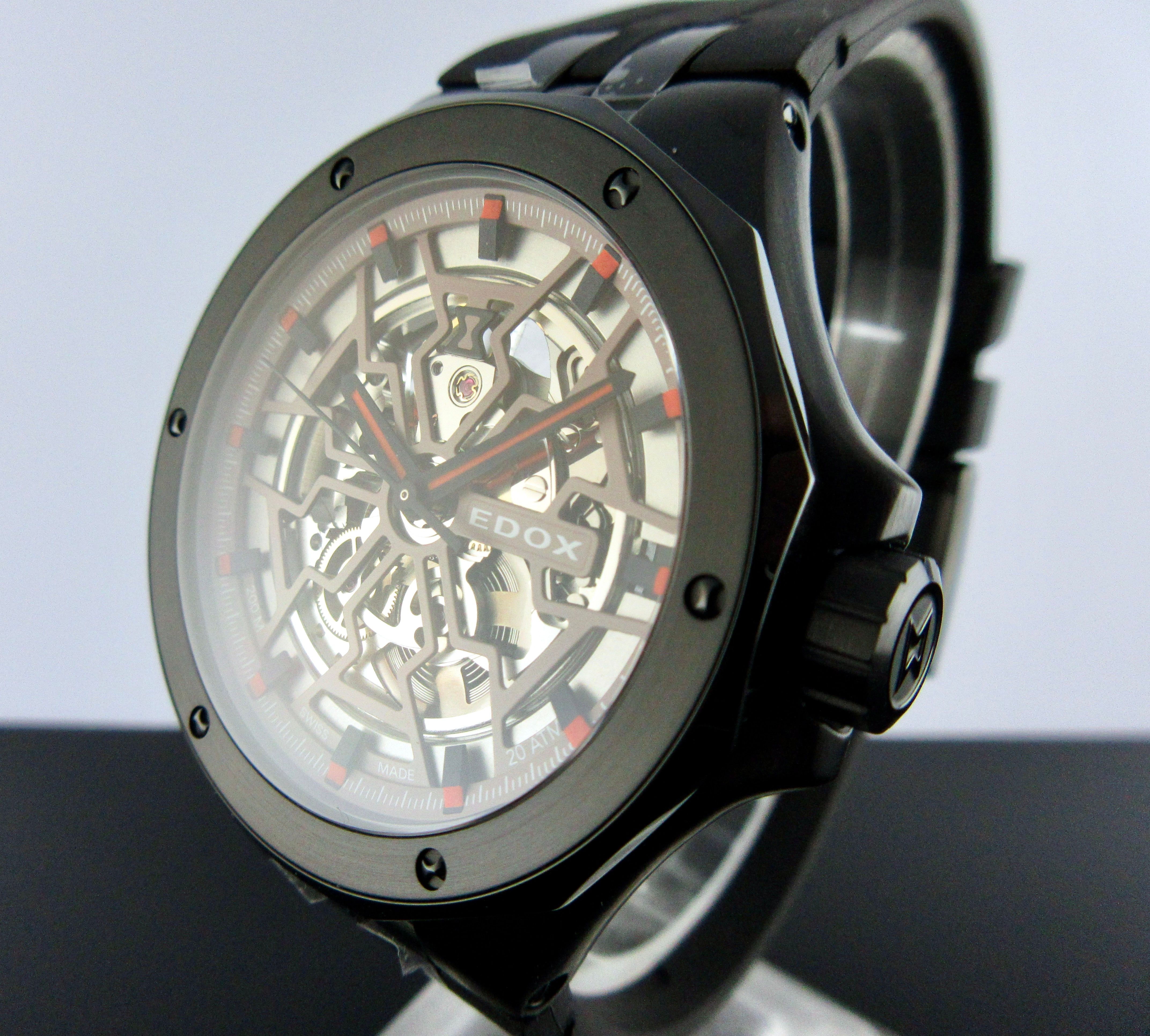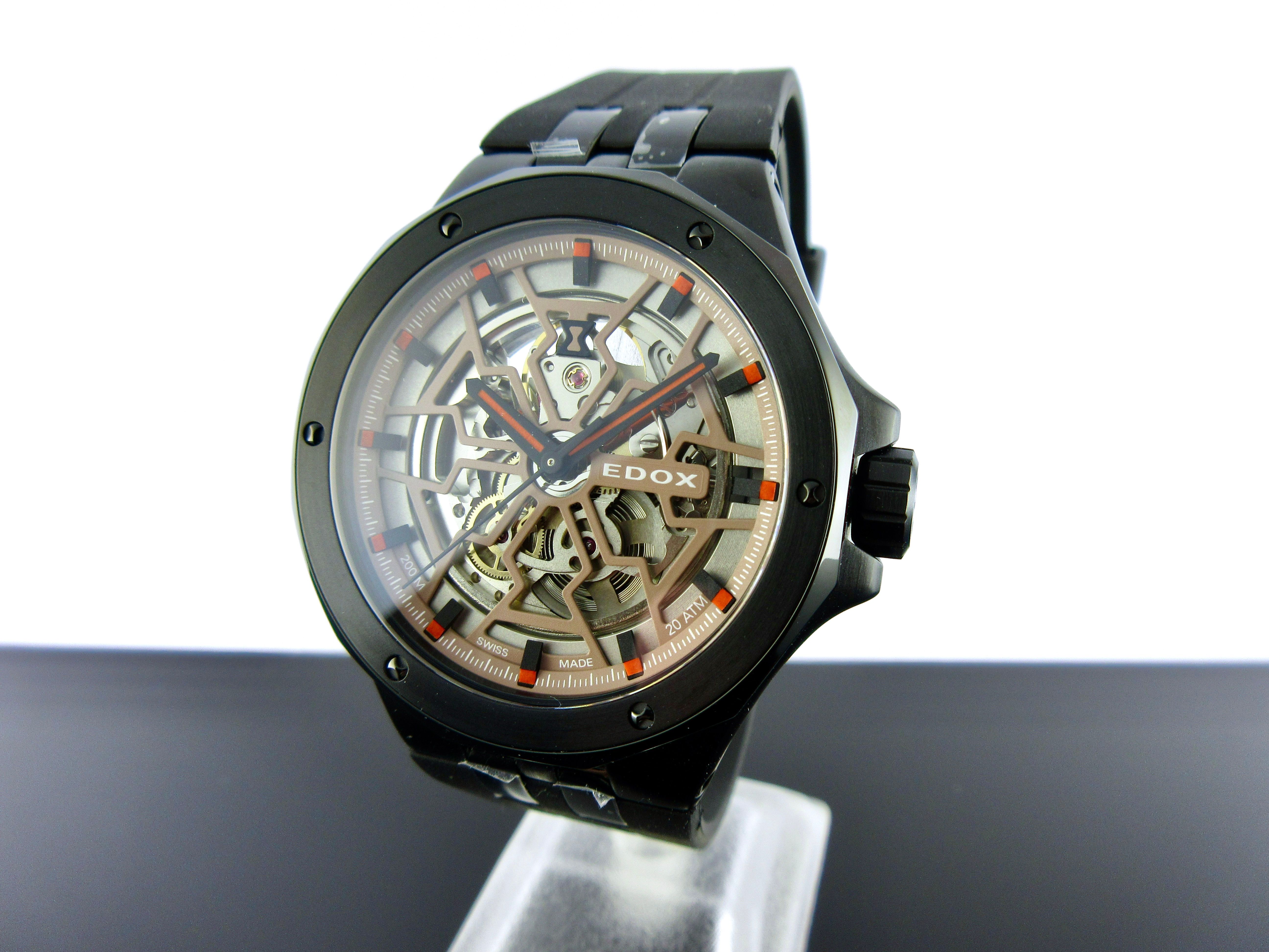 Technische Angben : Edox Krone und/oder Drücker mit doppeltem O-Ring , Nachleuchtende Zeiger und/oder Indizes , Sicherheitsschraubkrone , Transparenter Gehäuseboden