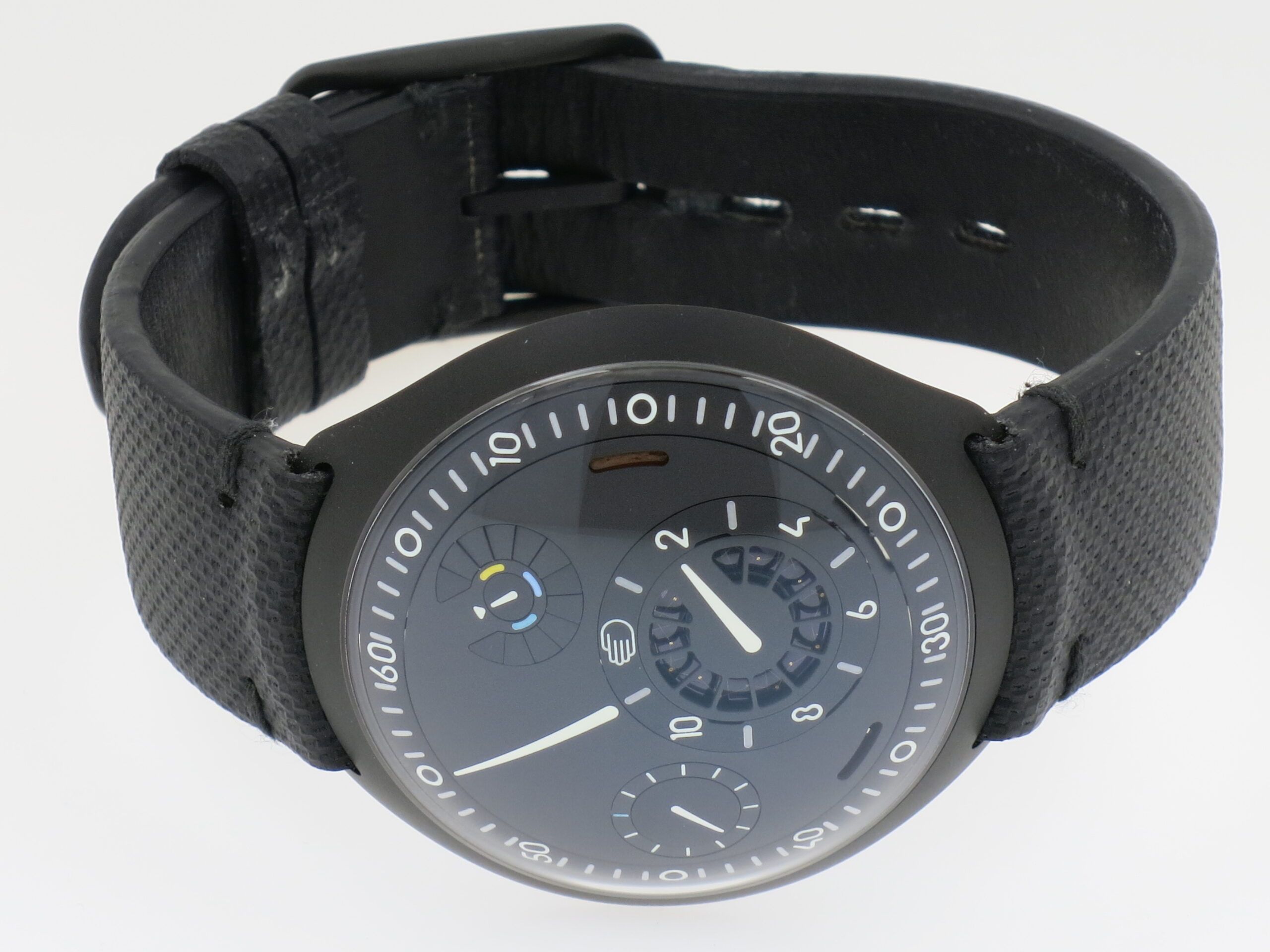 Ressence "Type 2 Automatic" 45mm. PVD black titanium case. E-Crown setting. Beautiful black dial in a 45 mm titanium case with titanium bezel. Shipping immediately upon receipt of payment. Our photos are NOT edited! What you see is what you get. Shipped registered and insured with Fedex Priority.