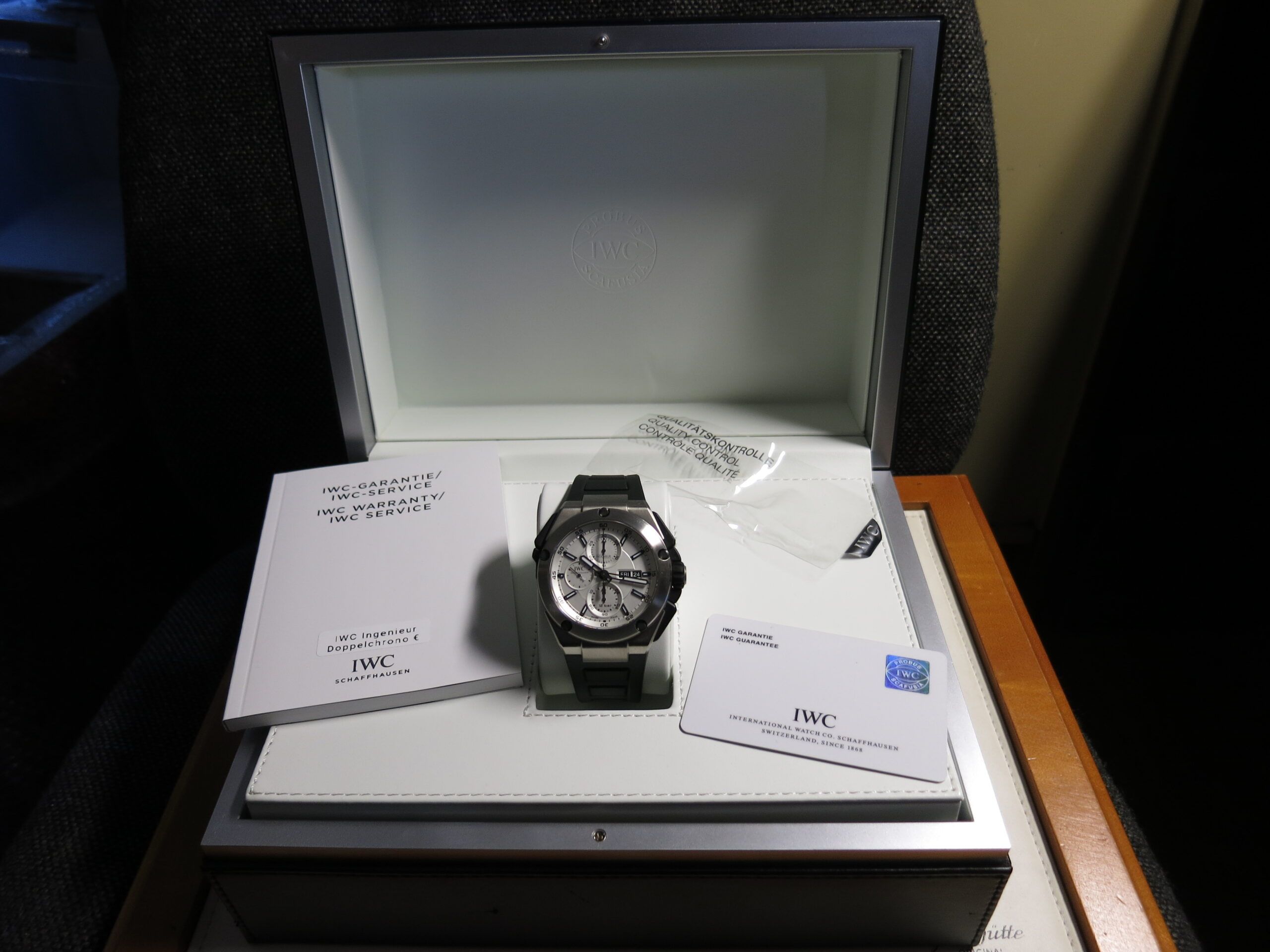 IWC Ingenieur Double Chronograph Titanium 45mm. titanium case rubber strap. Beautiful silver dial in a 45 mm titanium case with titanium bezel. Shipping immediately upon receipt of payment. Our photos are NOT edited! What you see is what you get. Shipped registered and insured with Fedex Priority.