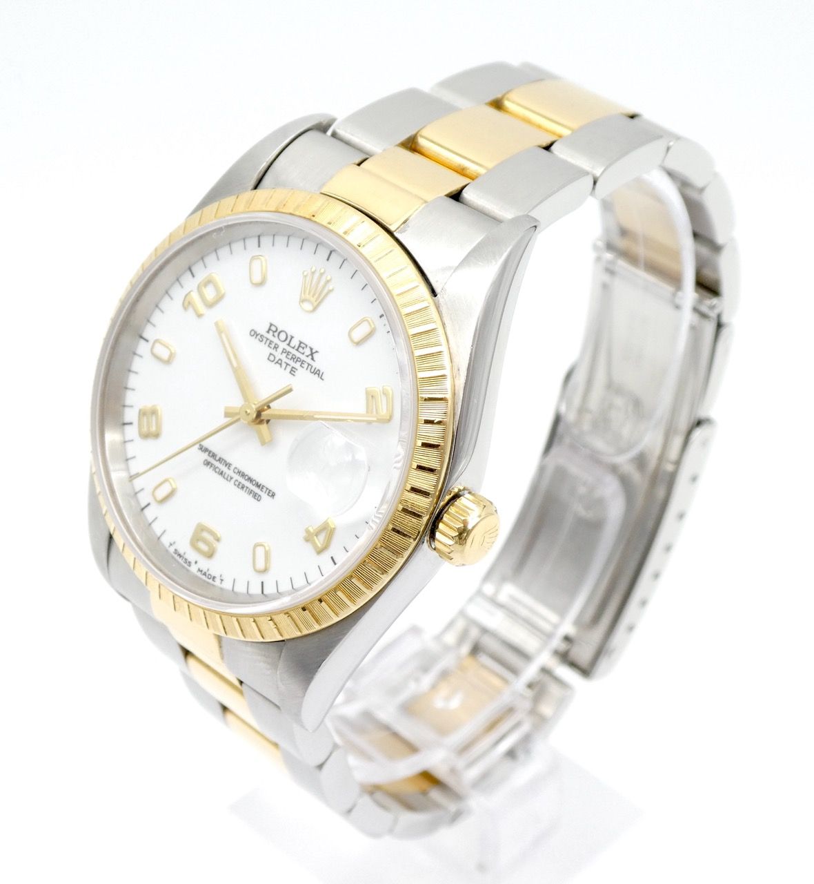 Rolex Oyster Perpetual Date Rolex Oyster Perpetual Date 15223 en bon état. Beau cadran blanc dans un boîtier en or/acier avec lunette en or jaune.