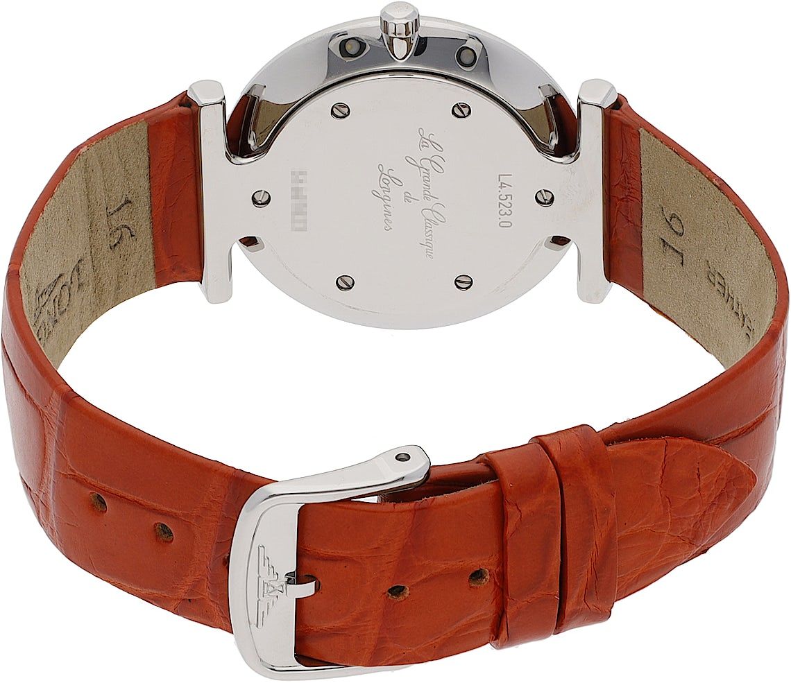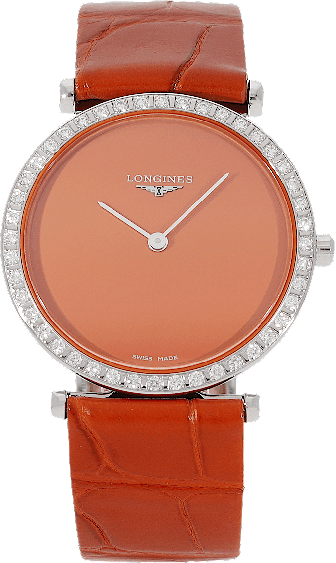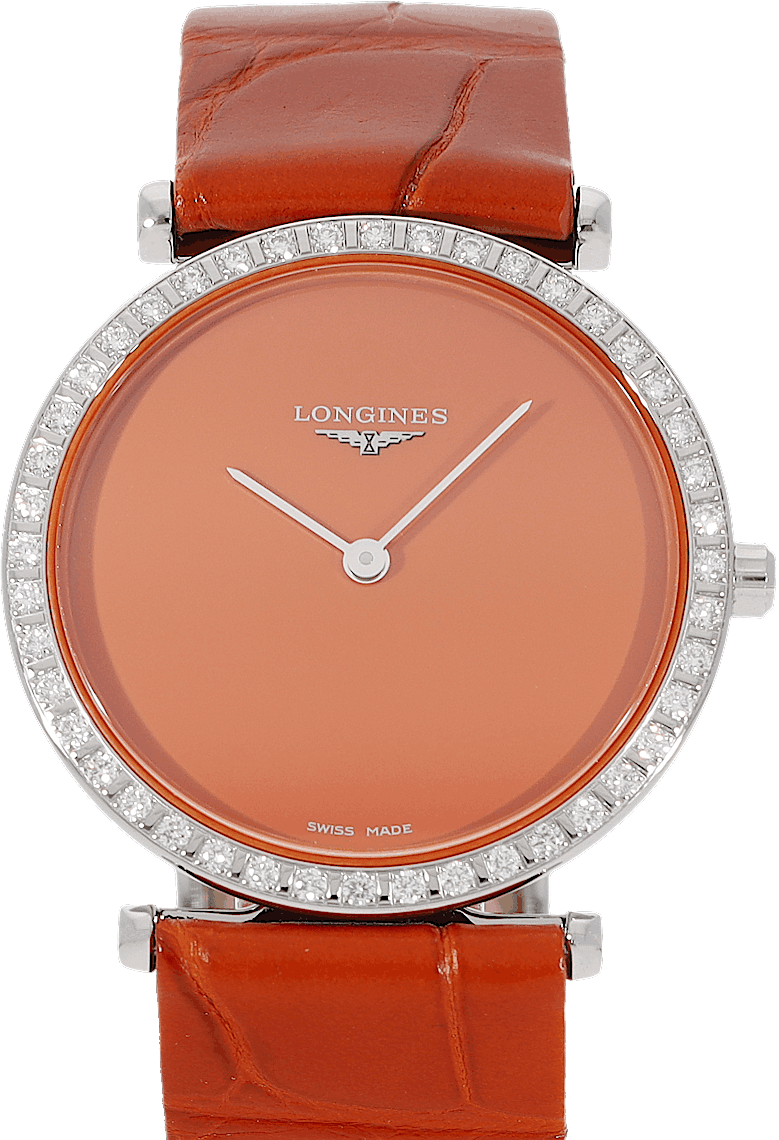 Longines La Grande Classique, Reference: L4.523.0.92.2, Gender: Female, Size: 29mm, Dial color: Orange, Strap material: Alligator Leather, Movement: Quartz, Year: 2023, Condition: New and unworn. An inspection by our certified watchmakers guarantees authenticity., Documents: Original papers, CHRONEXT Certificate