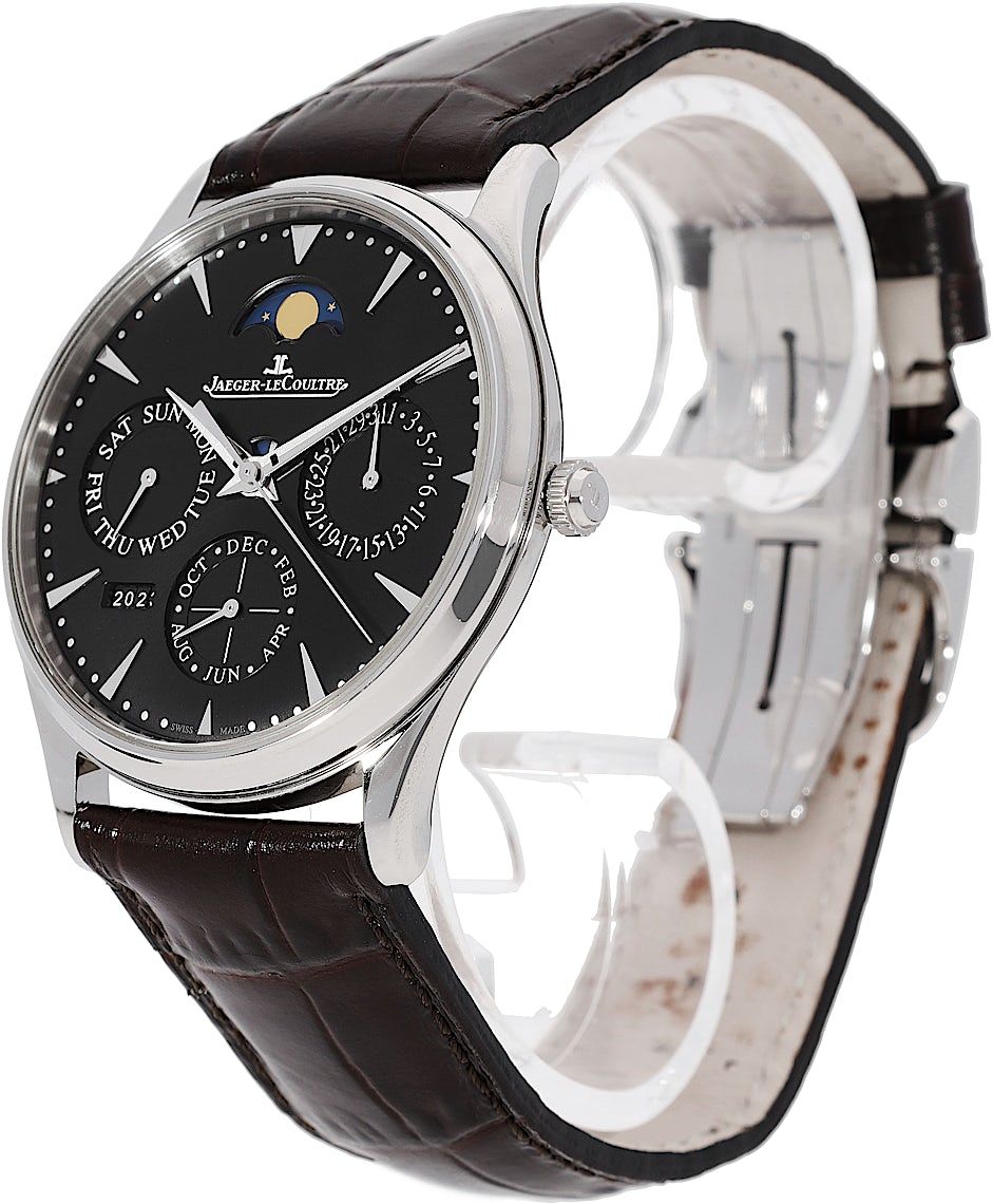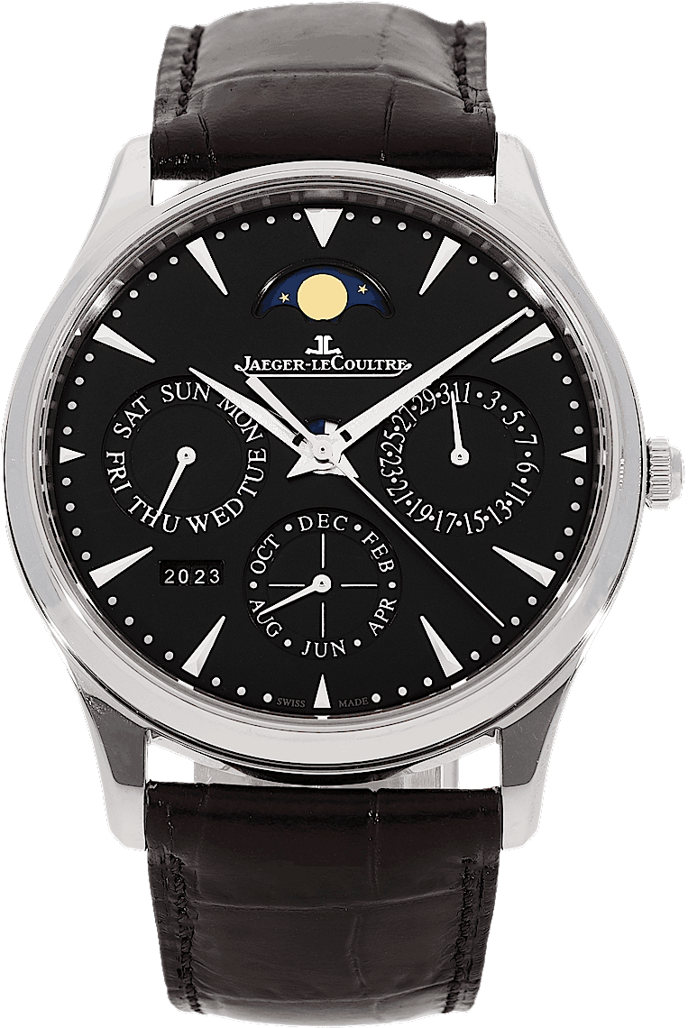Jaeger-LeCoultre Master Ultra Thin Perpetual, Reference: 1308470, Gender: Male, Size: 39mm, Dial color: Black, Strap material: Calf Leather, Movement: Automatic, Year: 2021, Condition: Previously worn, minor to no signs of usage. The movement is flawless and the case has been cleaned. watch tested ensure full functionality. An inspection by our certified watchmakers guarantees its authenticity., Documents: Original papers, CHRONEXT Certificate