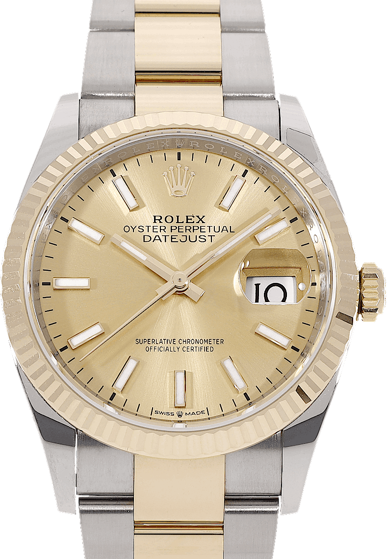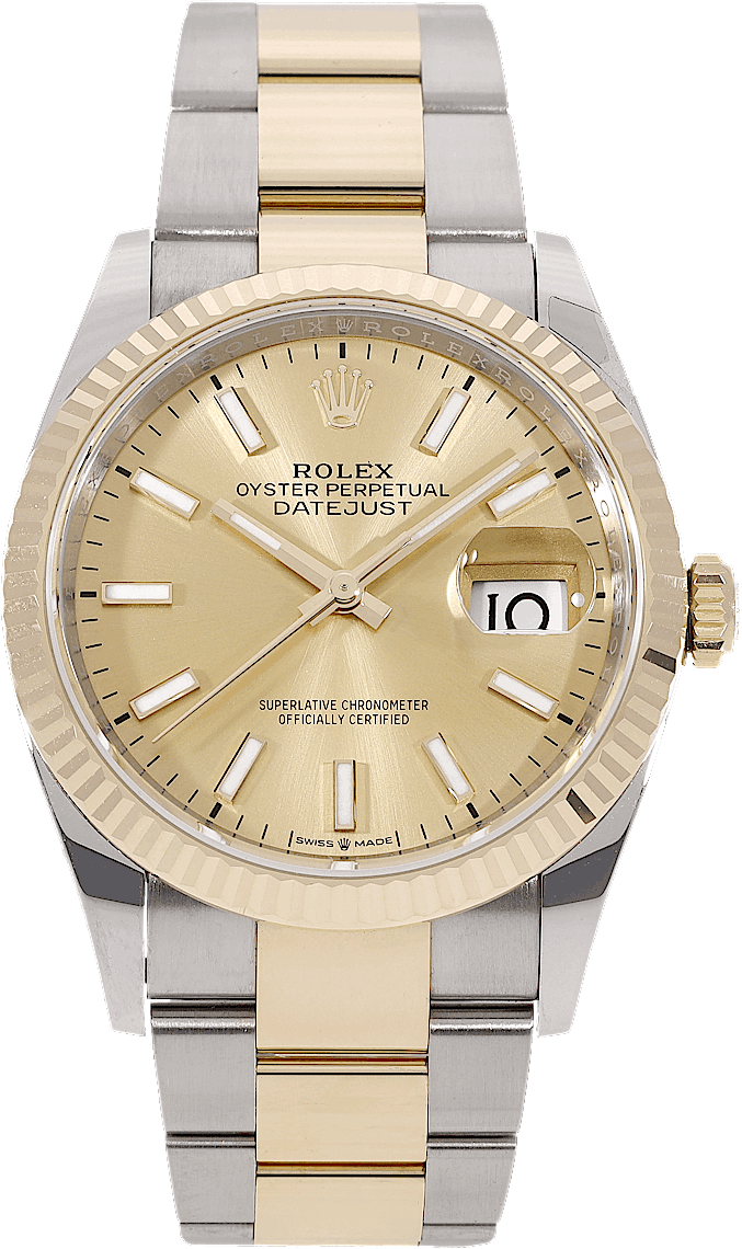 Rolex Datejust 36, Reference: 126233, Gender: Unisex, Size: 36mm, Dial color: Gold, Strap material: Stainless Steel Yellow Movement: Automatic, Year: 2024, Condition: Previously worn, minor to no signs of usage. The movement is flawless and the case has been cleaned. watch tested ensure full functionality. An inspection by our certified watchmakers guarantees its authenticity., Documents: Original papers, CHRONEXT Certificate