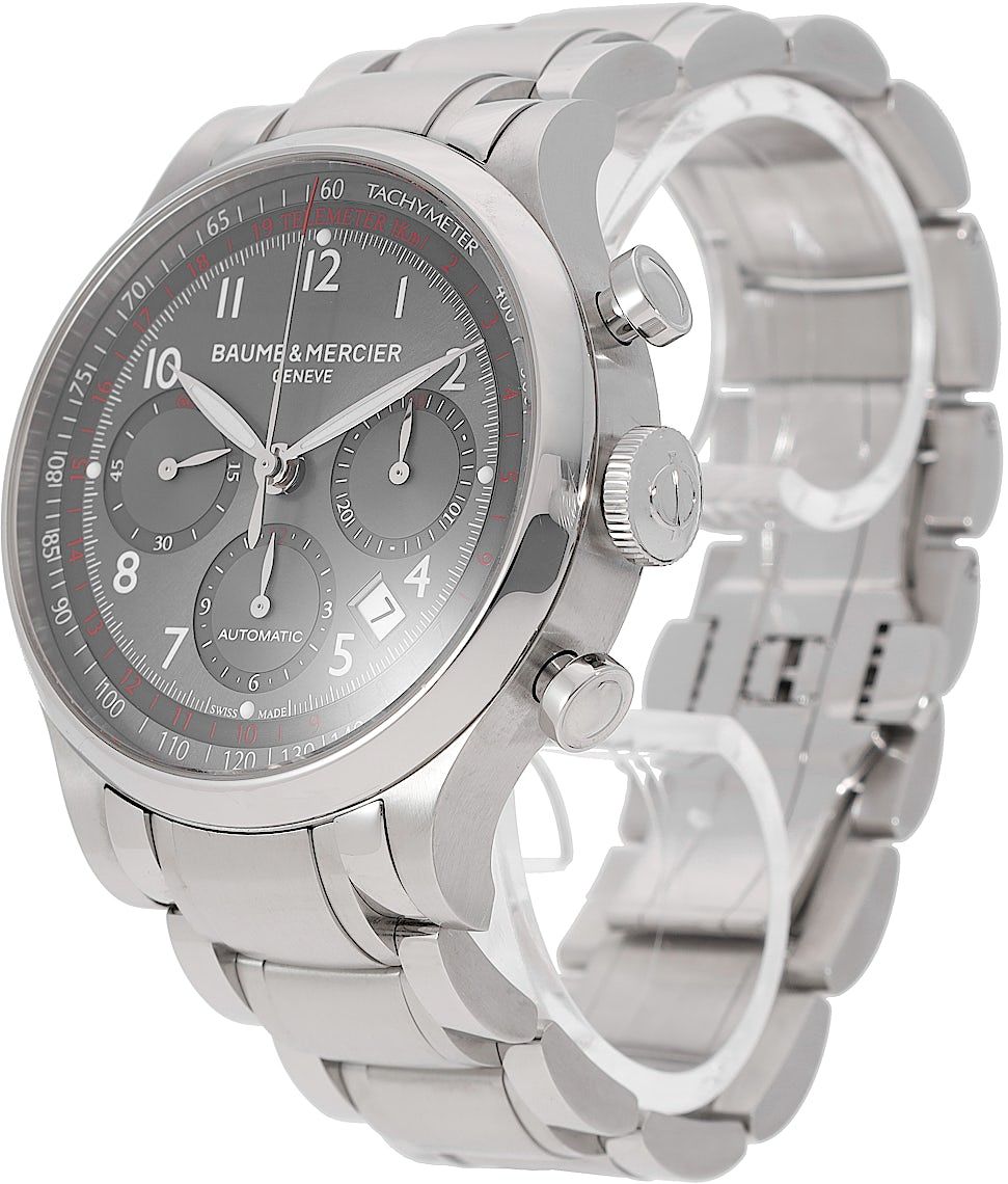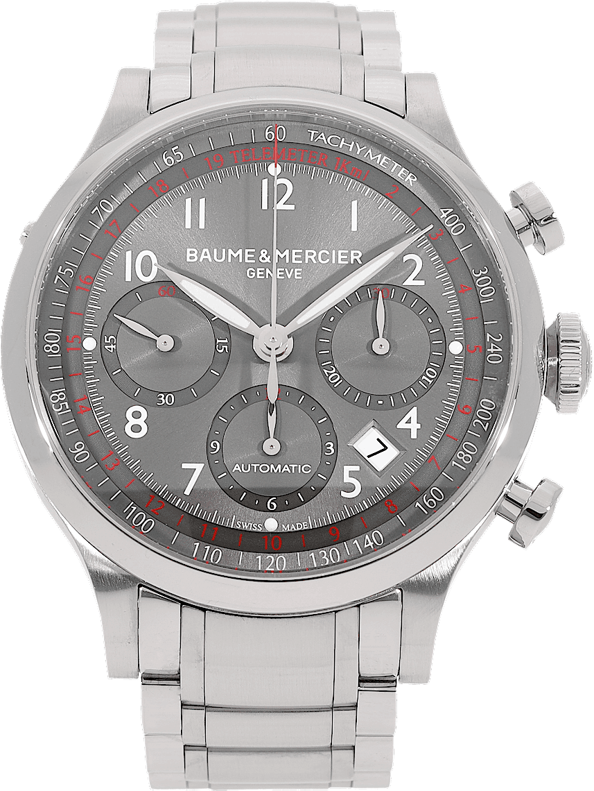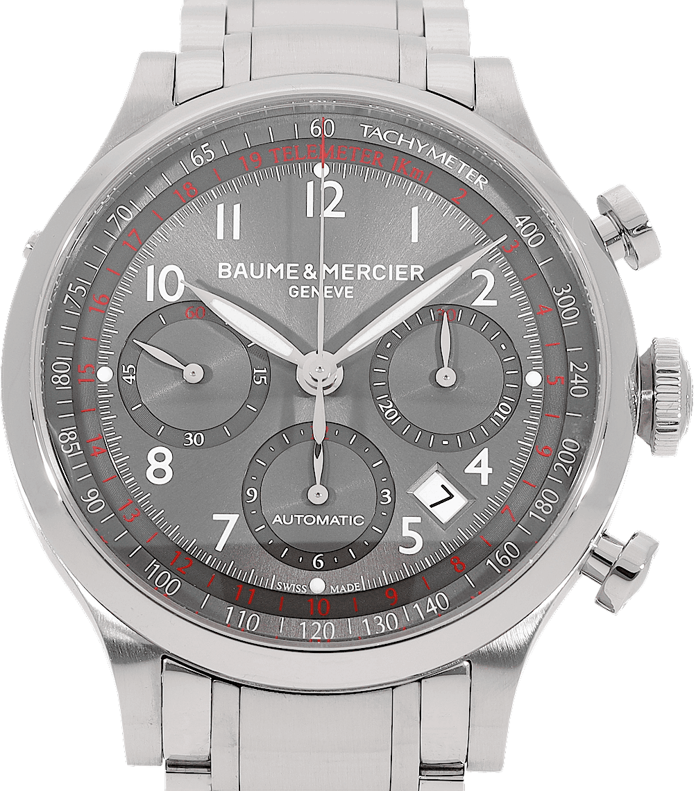 Baume & Mercier Capeland Chronograph, Reference: MOA10003, Gender: Male, Size: 42mm, Dial color: Grey, Strap material: Stainless Steel, Movement: Automatic, Year: 2019, Condition: Previously worn, minor to no signs of usage. The movement is flawless and the case has been cleaned. watch tested ensure full functionality. An inspection by our certified watchmakers guarantees its authenticity., Documents: Original papers, CHRONEXT Certificate