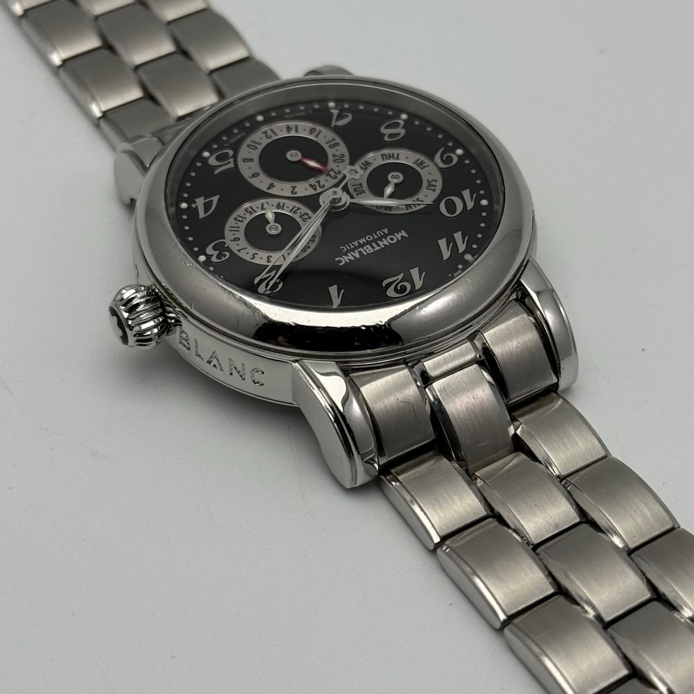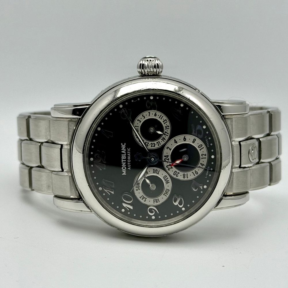 Since its founding in 1906, Montblanc has been synonymous with exceptional craftsmanship and timeless elegance. The Meisterstück collection embodies this legacy, offering refined and innovative timepieces designed for those who appreciate both style and functionality. The Montblanc Meisterstück Dual Time GMT Reference 7018 features a 38mm stainless steel case, striking the perfect balance between elegance and wearability. The black dial is adorned with Arabic numeral hour markers and luminous hands, ensuring optimal legibility.A full calendar function is seamlessly integrated, displaying the day and date, while a scratch-resistant sapphire crystal protects the dial, maintaining clarity and durability. At the heart of the Meisterstück Dual Time GMT is a self-winding automatic movement, providing reliable and accurate timekeeping. The dual time (GMT) function allows the wearer to track a second time zone, making this an ideal companion for travelers.