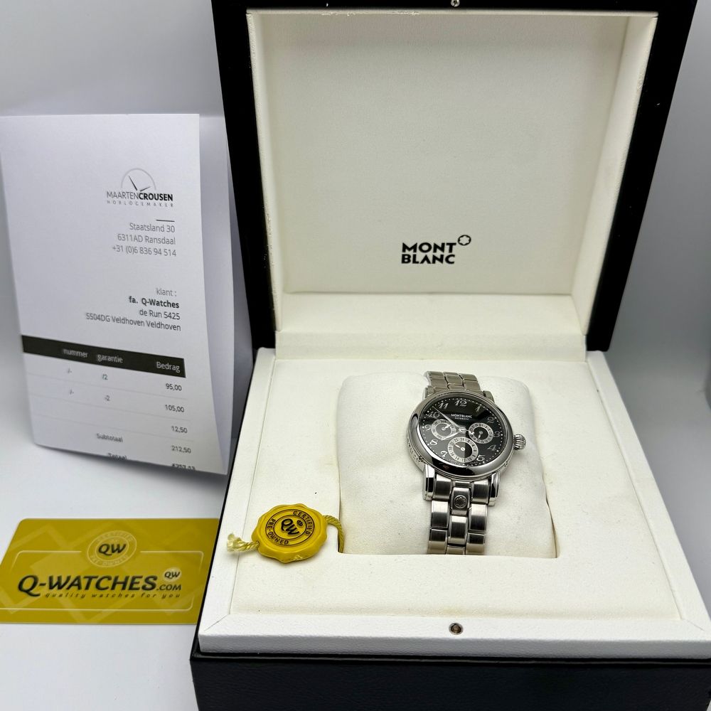 This Montblanc Meisterstück Dual Time GMT is in good condition and comes with a fresh movement service. The bracelet will fit a wrist up to 18,5cm. 1 year warranty! We are proud to offer a two-year warranty on every Rolex watch offered by us. Other brands come with a one-year warranty unless otherwise mentioned. The warranty includes the functioning of the watch including the functioning of any present complications. Excluded from the warranty are: water damage, turn and push buttons, crystal, watch strap and clasp.