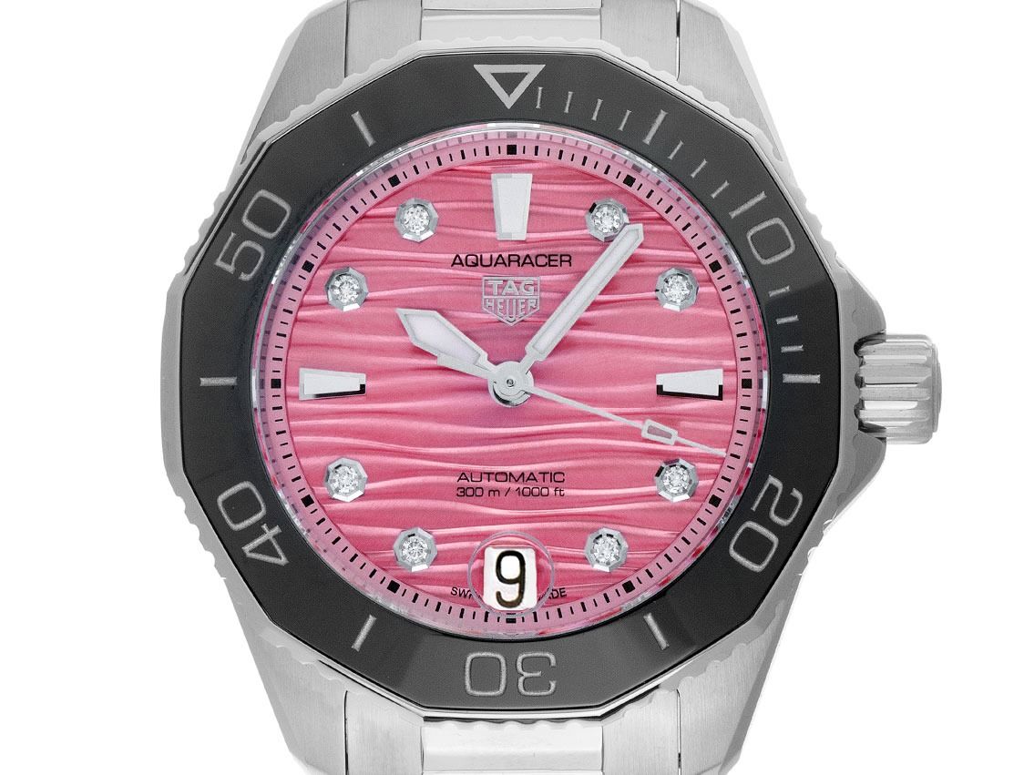 Tag Heuer Aquaracer Professional 300 Stahl Keramik Diamanten Automatik Armband StahlGehäuse Edelstahl poliert und satiniert, Gehäusedurchmesser ohne Krone 36mm, Gehäusehöhe 11,8mm. Lünette Edelstahl mit schwarzen Keramik Inlay und 60-Minuten Skala, einseitig drehbar. Armband Edelstahl poliert und satiniert, Sicherheitsfaltschließe Edelstahl mit Hersteller-Logo. Zifferblatt rosa mit Wellenmuster, aufgesetzten Edelstahl Leuchtindexen und 8 Diamantindexen, zusammen ca. 0,078ct TW / VSI (feines Weiß mit sehr kleinen Einschlüssen) sowie Edelstahl Leuchtzeigern. Uhrwerk Automatik, Tag Heuer Calibre 5 mit 26 Edelsteinen, Gangreserve ca. 38 Stunden. Anzeige von Stunde, Minute und Sekunde über Zeiger aus der Mitte mit Sekundenstopp zur sekundengenauen Einstellung der Uhrzeit, Datumsanzeige mit Schnellverstellung bei 6 Uhr. Saphirglas kratzfest. Krone verschraubbar mit Flankenschutz und Hersteller-Logo. Boden Edelstahl graviert. Gewicht der Uhr inklusive Armband 131g, Länge des Armbandes inkl. Gehäuse 195mm. Wasserdicht bis 30 ATM. Referenznummer: WBP231J.BA0618, ID: ST116052000625H-3950, Artikelnummer: 10000080785. Original Tag Heuer Box mit Umkarton und Garantie Papiere von Juni 2025 sowie Beschreibung, Full Set. Ungetragen. Lieferzeit sofort.