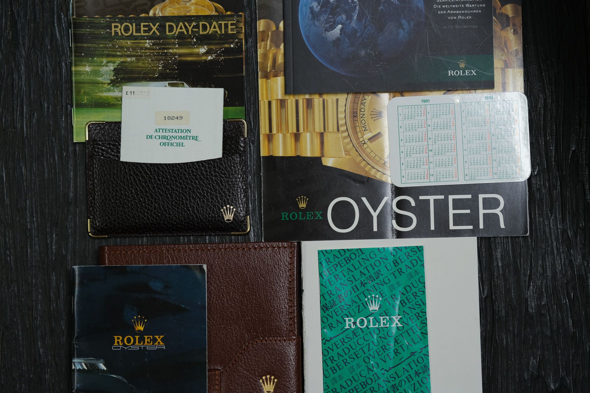 The scope of delivery of the watch is fantastic and testifies to how the previous owner took care of the watch. The following is included in the scope of delivery: Original warranty papers (LC100), Rolex pencil case, Rolex calendar, Oyster booklet, Day-Date booklet, Oyster catalog, President notebook, replacement book, service book (card missing), outer carton & box! It doesn't get any better than this.