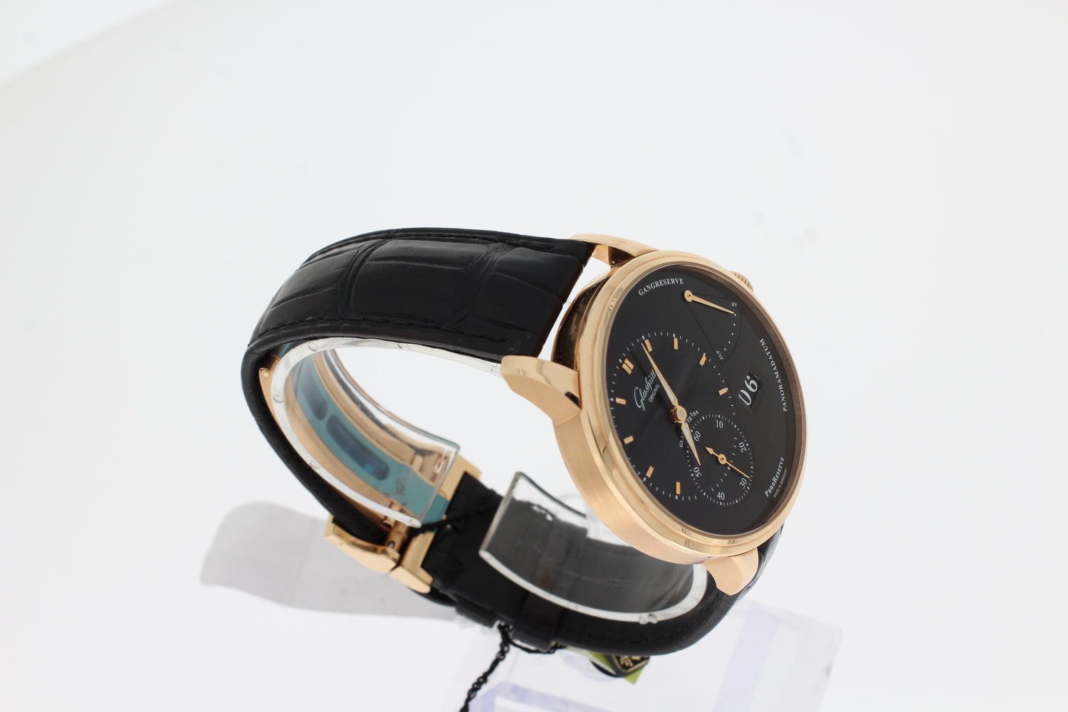 Glashütte Original PanoReserve 1-65-01-29-15-61 (anciennement 1-65-01-29-15-30) noir 40mm or rose, mouvement à remontage manuel, bracelet en cuir d'alligator de Louisiane.