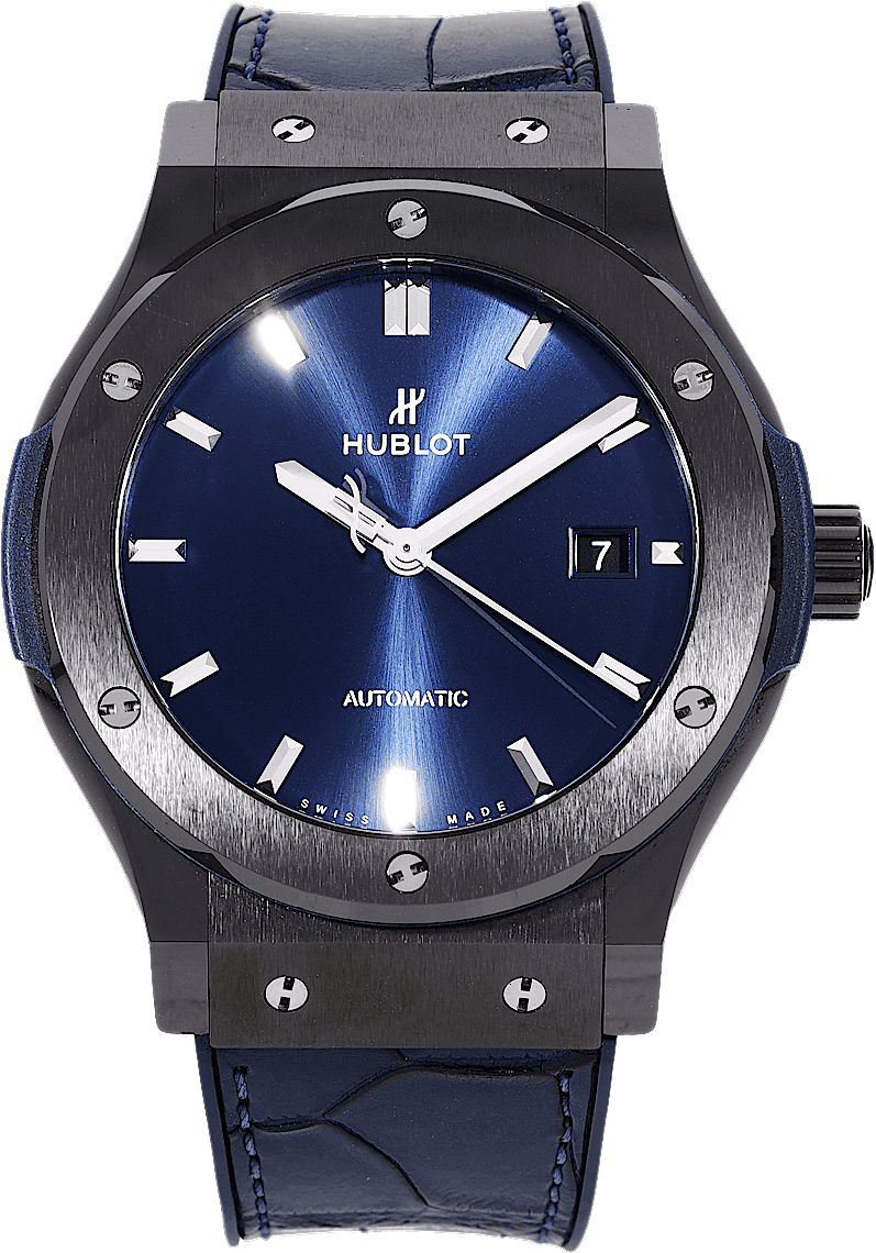 Hublot Classic Ceramic Blue, Reference: 542.CM.7170.LR, Gender: Male, Size: 42mm, Dial color: Strap material: Rubber Alligator Leather, Movement: Automatic, Year: 2019, Condition: Previously worn, minor to no signs of usage. The movement is flawless and the case has been cleaned. watch tested ensure full functionality. An inspection by our certified watchmakers guarantees its authenticity., Documents: Original papers, CHRONEXT Certificate