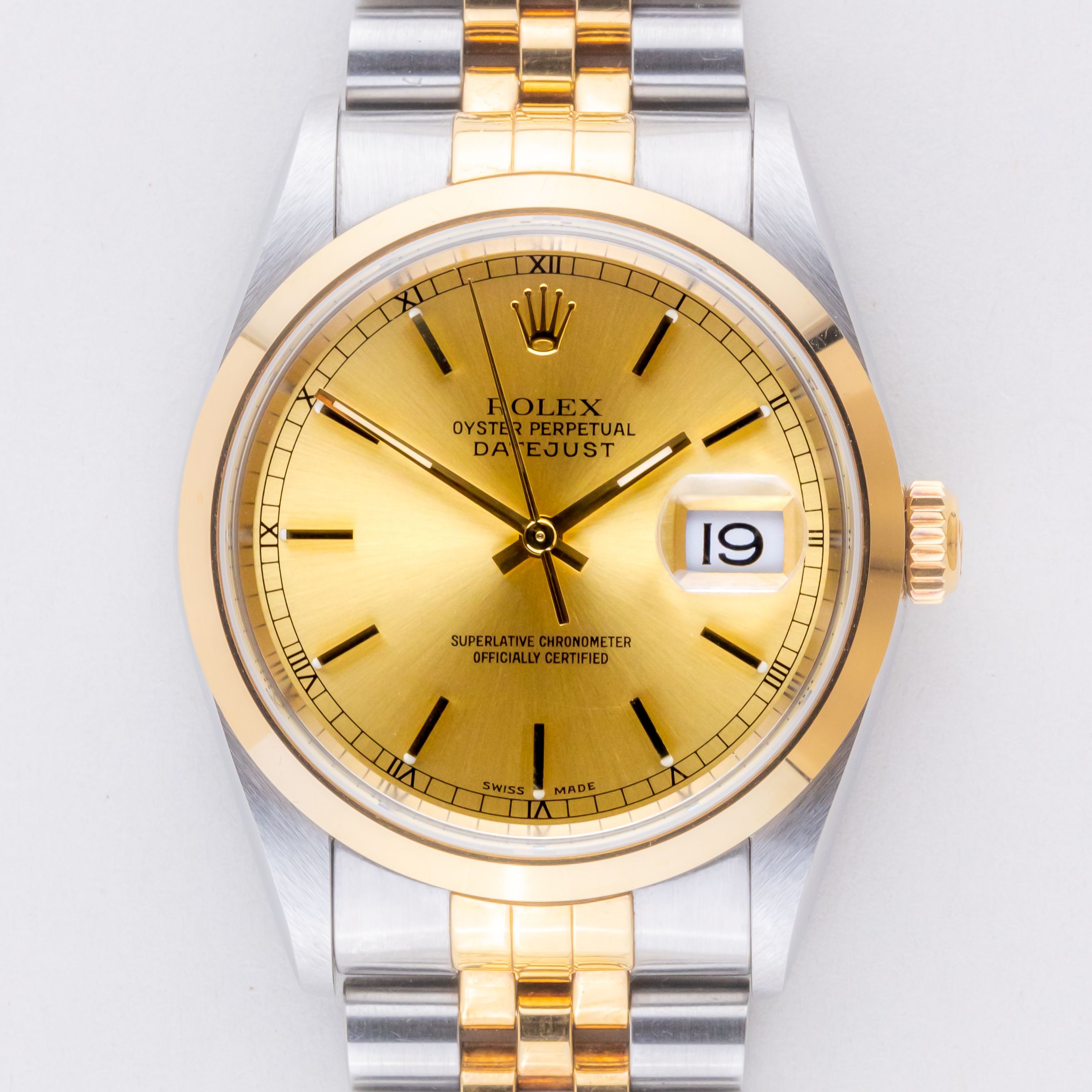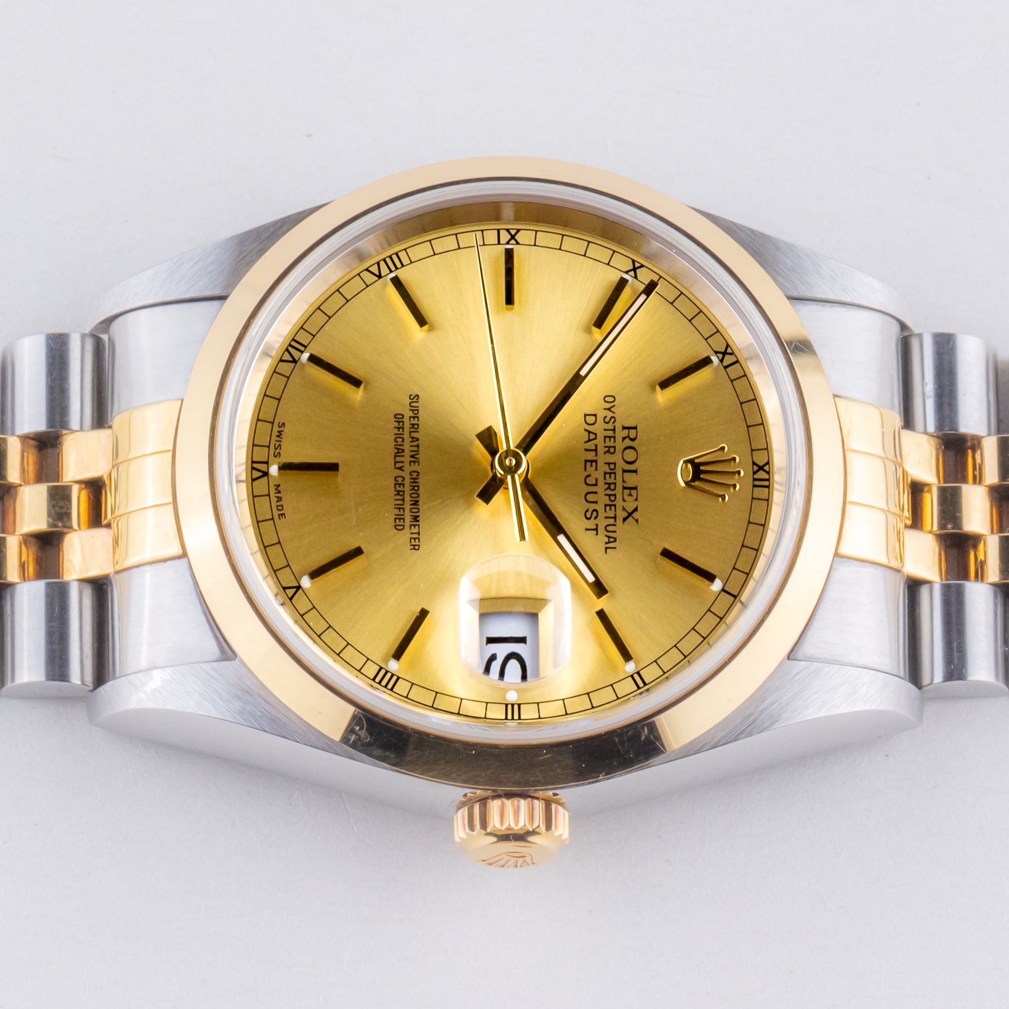 Rolex Oyster Perpetual Datejust référence 16203 de l'année 2000 comprenant un set complet. La Datejust 16203 mesure un boîtier de 36 mm en acier inoxydable, un bracelet Oyster en or/acier inoxydable et une lunette lisse en or. La 16203 possède un mouvement automatique calibre 3135 quickset fonction date, verre saphir résistant à l'eau et cadran couleur champagne avec aiguilles tritium.